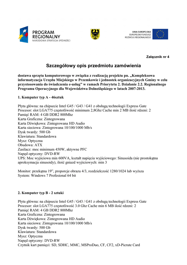 Załącznik nr 4 Szczegółowy opis przedmiotu zamówienia dostawa sprzętu komputerowego w związku z realizacją projektu pn. „Kompleksowa informatyzacja Urzędu Miejskiego w Przemkowie i jednostek organizacyjnych Gminy w celu przystosowania do świadczenia e-usług” w ramach Priorytetu 2. Działanie 2.2. Regionalnego Programu Operacyjnego dla Województwa Dolnośląskiego w latach 2007-2013. 1. Komputer typ A - 46sztuk Płyta główna: na chipsecie Intel G45 / G43 / G41 z obsługą technologii Express Gate Procesor: slot LGA775 częstotliwość minimum 2,8Ghz Cache min 2 MB ilość rdzeni: 2 Pamięć RAM: 4 GB DDR2 800Mhz Karta Graficzna: Zintegrowana Karta Dźwiękowa: Zintegrowana HD Audio Karta sieciowa: Zintegrowana 10/100/1000 Mb/s Dysk twardy: 500 Gb Klawiatura: Standardowa Mysz: Optyczna Obudowa: ATX Zasilacz: moc minimum 450W, aktywne PFC Napęd optyczny: DVD-RW UPS: Moc wyjściowa min 600VA, kształt napięcia wyjściowego: Sinusoida (nie prostokątna aproksymacja sinusoidy), ilość gniazd wyjściowych: min 3 Monitor: przekątna 19”, proporcje obrazu 4/3, rozdzielczość 1280/1024 lub wyższa System: Windows 7 Profesional 64 bit 2. Komputer typ B - 2 sztuki Płyta główna: na chipsecie Intel G45 / G43 / G41 z obsługą technologii Express Gate Procesor: slot LGA775 częstotliwość 3.0 Ghz Cache min 6 MB ilość rdzeni: 2 Pamięć RAM: 4 GB DDR2 800Mhz Karta Graficzna: Zintegrowana Karta Dźwiękowa: Zintegrowana HD Audio Karta sieciowa: Zintegrowana 10/100/1000 Mb/s Dysk twardy: 500 Gb Klawiatura: Standardowa Mysz: Optyczna Napęd optyczny: DVD-RW Czytnik kart pamięci: SD, SDHC, MMC, MSProDuo, CF, CF2, xD-Picrute Card Obudowa: ATX Zasilacz: moc minimum 450W, aktywne PFC UPS: Moc wyjściowa min 600VA, kształt napięcia wyjściowego: Sinusoida (nie prostokątna aproksymacja sinusoidy), ilość gniazd wyjściowych: min 3 Monitor: przekątna 19”, proporcje obrazu 4/3, rozdzielczość 1280/1024 lub wyższa System: Windows 7 Profesional 64 bit Dodatkowe oprogramowanie: Abbyy Fine Reader 10 Profesional (do jednego komputera) 3. Komputer typ C - 1 sztuka Płyta główna: na chipsecie Intel P45 / P43 z obsługą technologii Express Gate Procesor: slot LGA775 częstotliwość min 2.5 Ghz Cache min 4 MB ilość rdzeni: 4 Pamięć RAM: 4 GB DDR2 800Mhz Karta Graficzna: GeForce GTS 250 512MB obsługa CUDA Karta Dźwiękowa: Zintegrowana HD Audio Karta sieciowa: Zintegrowana 10/100/1000 Mb/s Dysk twardy: 640 Gb Klawiatura: Standardowa Tuner TV: wejście antena TV + wejście cyfrowe DVB-T + wejście video (S-Video lub Chinch) kompresja obrazu MPG-I, MPG-II, MPG4 w rozdzielczości 720x576 przy 25 kl/s Mysz: Optyczna Napęd optyczny: DVD-RW Czytnik kart pamięci: SD, SDHC, MMC, MSProDuo, CF, CF2, xD-Picrute Card Obudowa: ATX Zasilacz: moc minimum 600W, aktywne PFC UPS: Moc wyjściowa min 700VA, kształt napięcia wyjściowego: Sinusoida (nie prostokątna aproksymacja sinusoidy), ilość gniazd wyjściowych: min 3 Monitor: przekątna 19”, proporcje obrazu 4/3, rozdzielczość 1280/1024 lub wyższa System: Windows 7 Profesional 64 bit Komputer typ D - 1 sztuka Płyta główna: Gniazdo procesora: Socket 1366 Chipset: Intel X58 Mostek południowy: Intel ICH-10R Sloty pamięci RAM: 6x DDR3 (z obsługą pracy trójkanałowej) Złącza napędów: 8xSataII + 1xESATA Obsługa RAID: 0, 1, 5 Karta sieciowa: 10/100/1000 Mb/s USB: 2.0 Procesor: Gniazdo: Socket 1366 Częstotliwość: min 2,6 Ghz Ilość rdzeni: 4 Pamięć RAM: 3x 2GB DDR3: Częstotliwość: min 1333Mhz CL: max 7 Napięcie: 1,6V Radiatory: Żeberkowane Karta Graficzna: Typ gniazda: PCI-E Złącza wyjściowe: 2xDVI lub 1xDVI + D-SUB Pamięć: min 512Mb DDR3 Obsługiwane technologie: CUDA Karta Dźwiękowa: Zintegrowana HD Audio Dysk twardy: 3 dyski serii Raid Edition o parametrach: standard: SataII pojemność: min 500GB szybkość obrotowa 7200obr/min Cache: min 16MB MTFB min 1200000.00 godz. Klawiatura: Standardowa Mysz: Optyczna Napęd optyczny: zapis BD-R: min 12x zapis BD-R DL: min 6x zapis DVD+/-R: min 16x zapis CD-R: min 40x Czytnik kart pamięci: SD, SDHC, MMC, MSProDuo, CF, CF2, xD-Picrute Card Obudowa: ATX Zasilacz: moc minimum 780W, aktywne PFC UPS: Moc wyjściowa min 1000VA, kształt napięcia wyjściowego: Sinusoida (nie prostokątna aproksymacja sinusoidy), ilość gniazd wyjściowych: min 3 Monitor: przekątna 19”, proporcje obrazu 4/3, rozdzielczość 1280/1024 lub wyższa System: Windows 7 Profesional 64 bit Dodatkowe oprogramowanie: Acronis True Image 2010 5. Drukarka laserowa czarno-biała – 3 szt. Rozdzielczość 600x600 DPI Pojemność podajnika papieru: minimum 250 kartek Maksymalny rozmiar papieru: A4 Złącza zewnętrzne: USB 2.0 + ETHERNET RJ45 (sieciowy serwer wydruku) Normatywny cykl pracy miesięcznie dla formatu A4: do 25000 stron lub więcej Sterowniki dla systemów Windows w tym wersja Windows 7 w wersji 64 bit 6. Drukarka laserowa kolor – 1 sztuka Rozdzielczość: 600x600 DPI Pojemność podajnika papieru: minimum 250 kartek Maksymalny rozmiar papieru: A4 Złącza zewnętrzne: USB 2.0 + ETHERNET RJ45 ( sieciowy serwer wydruku) Normatywny cykl pracy miesięcznie dla formatu A4: do 40000 stron lub więcej Sterowniki dla systemów Windows w tym wersja Windows 7 w wersji 64 bit 7. Drukarka kopert i zwrotek pocztowych. Technologia druku laserowa Podajnik papieru: o pojemności minimum 250 kartek Maksymalny rozmiar papieru: A4 Dedykowany podajnik automatyczny do kopert i zwrotek pocztowych Pojemność podajnika kopert nie mniejsza niż 75 sztuk 8. Skaner: Format A4: Rozdzielczość optyczna minimum 600x600 DPI automatyczny podajnik kartek na nie mniej niż 50 kartek o gramaturze 80g/m2 skanowanie dwustronne jednoprzebiegowe Szybkość skanowania minumum 25 stron A4 na minutę przy rozdzielczości 200DPI Złącze zewnętrzne: USB 2.0 Sterowniki dla systemów Windows w tym wersja Windows 7 w wersji 64 bit 9. Skaner: Format A3: Rozdzielczość optyczna minimum 1200x1200 DPI Złącze zewnętrzne: US