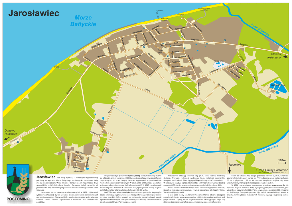 Jarosławiec zjazd dla wózków inwalidzkich pomost zjeżdżalnia Morze Bałtyckie Przystań rybacka rko Pa a ow Konwaliowa wa ko tnis ur Chabrowa Ke Le a B ok ojn Po a go dn m pi a ow wa Uzdrowiskowa W rz OCZYSZCZALNIA os ow a Za Las em Ba ko a Łą ng Makow na Sławno Jezierzany Sp ha Cic a sz ty n Fiołkowa kow a AQUAPARK wis ck Bałtycka wa ko Łą Krokusowa Leś łty P Wczasowa dro dy P Uz ka wiaz Rozg wa Rozg Szkolna a Kwiatowa a ls Mała Bzowa śn P sk ira dy wiaz a a owa Le nic Różana zo or m łów P Zespół szkół wa Ad Latarnia P lna rs a łG a sk or ko M sk Pia zejście na plażę dm wa wa a P Sz Do siow o Łos ow Bałtycka cka zaka śn P Bałty c zejsz cka er Słon ka na ac eczna ac P Bałty Le a mo Wyd Klifo J. Gr a rsk mo Nad w taro Jan Nad Na ka mors yb ka ót Kr Ry P ka Sp R a ck ba Za La se m Darłowo Rusinowo Cyp rys ow a wy rto P lna a Dębowa ca cowa Jałow a ow a łó G ał n ka jest wsią rybacką i rekreacyjno-wypoczynkową położoną na wybrzeżu Morza Bałtyckiego, na Przylądku Jarosławiec. Leży między miejscowościami Wicko Morskie i Darłowo (11 km na północ od drogi wojewódzkiej nr 203, która łączy Koszalin i Darłowo z Ustką), na zachód od jeziora Wicko. Przy wschodniej części wsi do Morza Bałtyckiego uchodzi rzeka Głównica. Jarosławiec po raz pierwszy wzmiankowany był w 1459 r. (jako wieś rybacka Garzhouede), był on wówczas częścią darłowskiej domeny książąt zachodniopomorskich. Z danych z 1648 r. wynika, że mieszkało w nim wówczas czterech kmieci, siedmiu zagrodników z rodzinami oraz siedemnastu parobków. 100m Nacmierz Urząd Gminy Postomino Jałowcowa Jarosławiec kan i wn n ta Klonow ów ł Gł a sz- Ka a nic Po Sosnow Runow a sta Brzozowa s pa wyk. Jarosław Modliszewski, 2011 r. Miejscowość była pierwotnie rybacką osadą, której mieszkańcy trudnili się także zbieraniem bursztynu. Od XIX w. następował powolny rozwój funkcji turystycznych - już przed I wojną światową wypoczywali tu przedstawiciele niemieckich środowisk artystycznych. W latach 1920–1932 wakacje spędzał we wsi malarz ekspresjonistyczny Karl Schmidt-Rottluff. W 1945 r. miejscowość została włączona do Polski. W Jarosławcu oraz jego najbliższej okolicy znajduje się kilka budynków o konstrukcji szachulcowej z XIX i XX wieku. Do 2008 r. wybrzeże stanowiły kamieniste i piaszczyste plaże. Na początku 2009 r. zakończyły się prace, wykonane na części terenu, położonego w okolicy przystani morskiej, które polegały na wykonaniu ostrogi palowej, opaski z gwiazdoblokami mającej zabezpieczać brzeg oraz refulacji. Uzupełniono także piasek, którego 10 tys. m³ przywieziono z Ustki. Miejscowość otaczają sosnowe lasy (m.in. sosna czarna, modrzew, daglezja. Przeważa roślinność wydmowa (m.in. mikołajek nadmorski). Brzegiem, na odcinku ok. 2 km, ciągną się klify dochodzące do 45 m wysokości. W Jarosławcu znajduje się latarnia morska z 1829 r. (przebudowana w 1902 r.) o wysokości 33,3 m. Jej światło można dostrzec z odległości 24 mil morskich. Można również skorzystać z rejsu łodzią z niewielkiej przystani morskiej. Niedaleko miejscowości znajdują się również jeziora takie jak: Kopań i Wicko. We wsi znajduje się kościół. 5 lipca 2008 r. przy sanatorium Panorama Morska otwarto aquapark o powierzchni lustra wody wynoszącej ok. 1500 m². Kompleks znajduje się pod gołym niebem i czynny jest od maja do września. Składają się na niego trzy zbiorniki: basen ze sztuczna falą; basen rekreacyjny; basen wielofunkcyjny. Basen ze sztuczną falą osiąga głębokość od 0 do 1,60 m, natomiast powierzchnia lustra wody wynosi ok. 770 m². Basen z rwącą rzeką ma długość 55 m, a głębokość 1,25 m. W centrum kompleksu znajduje się basen wielofunkcyjny, którego głębokość opada od 1,20 do 1,35 m. W 1994 r. w Jarosławcu ustanowiono urzędowo przystań morską dla rybaków. Przystań obejmuje dalbę wyciągową, plażę do bazowania łodzi, plac utwardzony o powierzchni 966 m² oraz akwatorium o szerokości 100 m liczonej od linii brzegu. Dostęp do przystani i jej nadzór zapewnia Urząd Morski w Słupsku. Kutry rybackie miejscowych rybaków pływają z sygnaturą JAR na burcie.