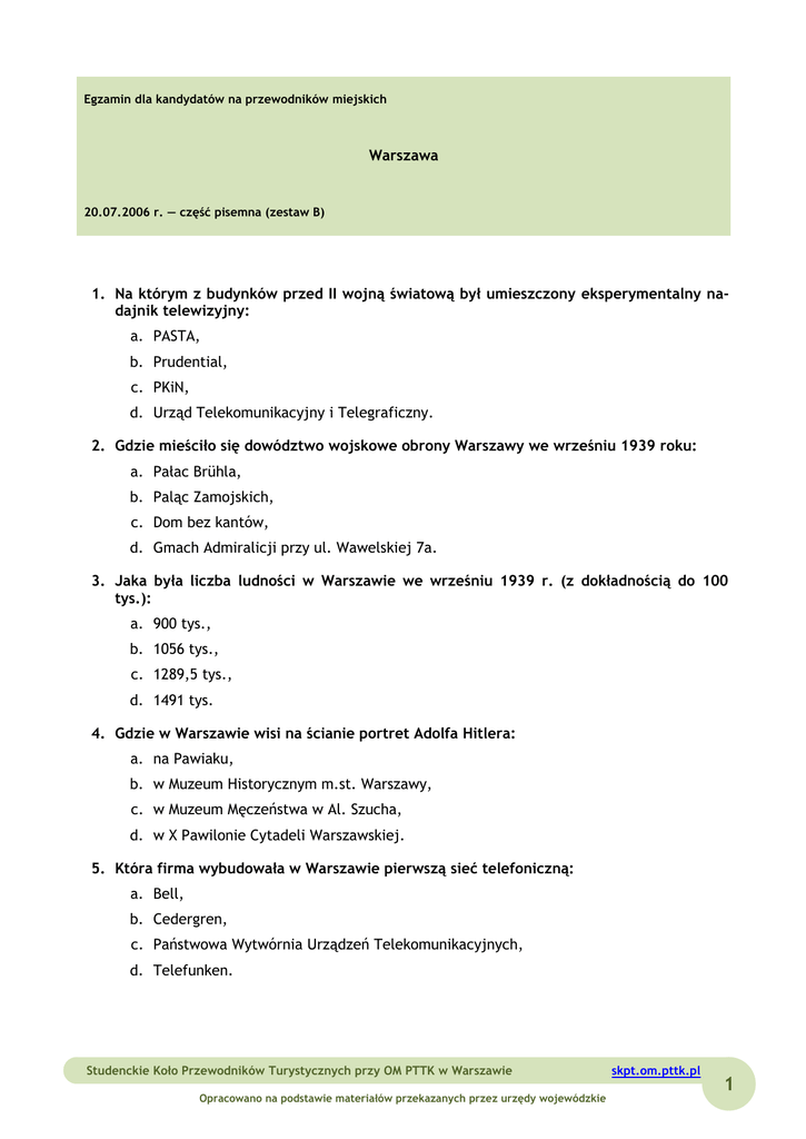 Egzamin dla kandydatów na przewodników miejskich Warszawa 20.07.2006 r. — część pisemna (zestaw B) 1. Na którym z budynków przed II wojną światową był umieszczony eksperymentalny nadajnik telewizyjny: a. PASTA, b. Prudential, c. PKiN, d. Urząd Telekomunikacyjny i Telegraficzny. 2. Gdzie mieściło się dowództwo wojskowe obrony Warszawy we wrześniu 1939 roku: a. Pałac Brühla, b. Paląc Zamojskich, c. Dom bez kantów, d. Gmach Admiralicji przy ul. Wawelskiej 7a. 3. Jaka była liczba ludności w Warszawie we wrześniu 1939 r. (z dokładnością do 100 tys.): a. 900 tys., b. 1056 tys., c. 1289,5 tys., d. 1491 tys. 4. Gdzie w Warszawie wisi na ścianie portret Adolfa Hitlera: a. na Pawiaku, b. w Muzeum Historycznym m.st. Warszawy, c. w Muzeum Męczeństwa w Al. Szucha, d. w X Pawilonie Cytadeli Warszawskiej. 5. Która firma wybudowała w Warszawie pierwszą sieć telefoniczną: a. Bell, b. Cedergren, c. Państwowa Wytwórnia Urządzeń Telekomunikacyjnych, d. Telefunken. Studenckie Koło Przewodników Turystycznych przy OM PTTK w Warszawie Opracowano na podstawie materiałów przekazanych przez urzędy wojewódzkie skpt.om.pttk.pl 1 20.07.2006 r. Egzamin dla kandydatów na przewodników miejskich — Warszawa 6. W jakich zakładach przed wojną montowano samochody Chevrolet i Buick: a. Norblin, b. Lilpop, Rau i Loewenstein, c. Państwowe Zakłady Inżynieryjne, d. Zakłady Szpotańskiego. 7. Gdzie w Warszawie będzie zlokalizowane wielokulturowe liceum humanistyczne im. J. Kuronia: a. w budynku dawnej mykwy na ul. Kłopotowskiego 31, b. w PKiN, c. przy ul. Sierakowskiego 7, d. przy ul. Okrzei 28. 8. Najstarsza murowana część Zamku Królewskiego, tzw. Curia Maior, powstała za czasów: a. Janusza II, b. Trojdena, c. Janusza I Starszego, d. Siemowita II. 9. Zwyczaj noszenia „żałobnej biżuterii” wiąże się z żałobą po: a. powstaniu kościuszkowskim, b. powstaniu listopadowym, c. powstaniu styczniowym, d. wydarzeniach 1905 roku. 10. Na którym z warszawskich cmentarzy pochowany jest Władysław Szpilman: a. na cmentarzu wojskowym na Powązkach, b. na katolickich Powązkach, c. na cmentarzu żydowskim na Powązkach, d. na cmentarzu żydowskim na Bródnie. 11. Z którą z warszawskich dzielnic związana była Agnieszka Osiecka: a. Żoliborzem, b. Mokotowem, c. Starówką, d. Pragą Południe. 2 skpt.om.pttk.pl Studenckie Koło Przewodników Turystycznych przy OM PTTK w Warszawie Opracowano na podstawie materiałów przekazanych przez urzędy wojewódzkie Egzamin dla kandydatów na przewodników miejskich — Warszawa 20.07.2006 r. 12. Jak brzmi prawidłowa aktualna nazwa ustawy, na podstawie której budynki podlegają ochronie prawnej Konserwatora Zabytków: a. ustawa, o ochronie dóbr kultury, b. ustawa o ochronie zabytków i opiece nad zabytkami, c. ustawa o zabytkach, d. ustawa o ochronie dóbr kultury i muzeach. 13. Kto jest aktualnie naczelnym architektem Warszawy: a. Stefan Kuryłowicz, b. Michał Borowski, c. Jacek Laskowski, d. Czesław Bielecki. 14. W jakim warszawskim kościele Niemcy podczas powstania i bezpośrednio po nim urządzili tymczasowy (etapowy) obóz dla wypędzonych z miasta warszawiaków: a. Św. St. Kostki przy ul. Hozjusza, b. Św. Wojciecha przy ul. Wolskiej, c. Św. Antoniego Padewskiego przy ul. Senatorskiej, d. Św. Marcina przy ul. Piwnej. 15. Co znajduje się w budynku dawnej stacji kolejki wąskotorowej w Wilanowie: a. kiosk z gazetami, b. poczta, c. punkt kontroli ruchu MZK, d. Dział Konserwacji Zabytków pałacu wilanowskiego. 16. Nazwa osiedla mieszkaniowego Muranów wywodzi się od: a. muru, który otaczał getto warszawskie, b. ruin domów wykorzystanych do budowy osiedla, c. gwarowej nazwy Murdziel, d. pałacu Murano zbudowanego tu w końcu XVII w. 17. Jak nazywała się główna ulica dzielnicy żydowskiej w Warszawie: a. Nowolipia, b. Gęsia, c. Miła, d. Nalewki. 18. Pałac Borchów to obecnie siedziba: a. prezydenta Warszawy, b. arcybiskupów warszawskich, c. Państwowego Wydawnictwa Naukowego, d. Akademii Teatralnej. Studenckie Koło Przewodników Turystycznych przy OM PTTK w Warszawie Opracowano na podstawie materiałów przekazanych przez urzędy wojewódzkie skpt.om.pttk.pl 3 20.07.2006 r. Egzamin dla kandydatów na przewodników miejskich — Warszawa 19. Gdzie w Warszawie znajduje się Muzeum Polskiej Techniki Wojskowej: a. w Muzeum Wojska Polskiego przy Moście Poniatowskiego, b. w Forcie Bema, c. w Pałacu Kultury i Nauki, d. w Forcie Czerniakowskim. 20. Kto jest obecnie Wojewodą Mazowieckim: a. Tomasz Koziński, b. Tomasz Merta, c. Ryszard Głowacz, d. Janusz Kaźniewski. 21. Walerian Czuma to: a. znany architekt warszawski, b. projektant Parku Ujazdowskiego, c. autor piosenek o Warszawie, d. dowódca obrony Warszawy w czasie II wojny światowej. 22. General SS Franz Kutschera został pochowany w: a. Warszawie, b. Berlinie, c. Dreźnie, d. Poznaniu. 23. Siedziba warszawskiej Opery Kameralnej mieści się w: a. Teatrze Wielkim Opery i Baletu, b. Gmachu byłej kaplicy zboru ewangelickiego przy AL Solidarności, c. Gmachu Warszawskiego Ośrodka Kulturalnego przy ul. Senatorskiej, d. Pałacu Prymasowskim przy ul. Senatorskiej. 24. Kto jest Stołecznym Konserwatorem Zabytków: a. Ewa Nekanda Trepka, b. Jacek Rulewicz, c. Maria Głodkowska, d. Janusz Kapuściński. 25. Kto był pierwszym proboszczem parafii św. Aleksandra i założycielem Instytutu Głuchoniemych: a. Stanisław Staszic, b. Euzebiusz Brzeziewicz, c. Jakub Falkowski, d. Józef Szczygielski. 4 skpt.om.pttk.pl Studenckie Koło Przewodników Turystycznych przy OM PTTK w Warszawie Opracowano na podstawie materiałów przekazanych przez urzędy wojewódzkie Egzamin dla kandydatów na przewodników miejskich — Warszawa 20.07.2006 r. 26. Ile sal liczy Pałac Kultury i Nauki: a. 2678, b. 3288, c. 4211, d. 1582. 27. Dowódca wojsk niemieckich odpowiedzialny za stłumienie Powstania Warszawskiego to: a. Erich von dem Bach, b. Reiner Stahel, c. Johannes von Bla