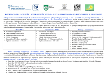 INFORMACJA DLA PACJENTÓW I KONTRAHENTÓW SZPITALA SPECJALISTYCZNEGO IM. WŁ. BIEGAŃSKIEGO W JĘDRZEJOWIE Zabezpieczenie świadczeń zdrowotnych dla Społeczności Lokalnej Powiatu Jędrzejowskiego, począwszy od dnia 1 lipca 2008 roku, realizuje Artmedik Sp. z o. o. udzielająca świadczeń medycznych poprzez Szpital Specjalistyczny im. Wł. Biegańskiego w Jędrzejowie. Szpital działa w oparciu o umowy zawarte ze Świętokrzyskim Oddziałem Wojewódzkim Narodowego Funduszu Zdrowia, co gwarantuje Pacjentom uzyskanie świadczeń opieki zdrowotnej finansowanych ze środków publicznych – Pacjent nie ponosi żadnych kosztów związanych z pobytem w Szpitalu, leczeniem i diagnostyką. Zmiany przedstawia tabela obrazująca funkcjonowanie Szpitala Specjalistycznego im. Wł. Biegańskiego w Jędrzejowie bezpośrednio po przejęciu od Powiatu Jędrzejowskiego likwidowanego Zespołu Opieki Zdrowotnej w Jędrzejowie, oraz z dniu dzisiejszym. 1 lipca 2008 r. 6 oddziałów szpitalnych 19 poradni specjalistycznych, 6 pracowni diagnostycznych, 1 Blok Operacyjny, Zatrudniano 50 lekarzy specjalistów Ogółem zatrudnienie – 247 osób 1 października 2016 r. 9 oddziałów szpitalnych 23 poradnie specjalistyczne 9 pracowni diagnostycznych 2 Bloki Operacyjne z 6 salami Zatrudnienie - 104 lekarzy specjalistów Ogółem zatrudnienie – 329 osób Zmiany – uruchomiono: Szpitalny Oddział Ratunkowy Hospicjum Stacjonarne Oddział Ortopedyczny Pracownię TK, Pracownia RTG, Pracownię USG Poradnię Kardiologii Dziecięcej Poradnię Hematologiczną Poradnię Logopedyczną Poradnię Domowego Leczenia Tlenem, Szkołę Rodzenia własny transport sanitarny Spółka – realizując Swoją Misję, Cele i Politykę Jakości - poprzez działania zmierzające do poszerzenia wachlarza świadczonych usług medycznych, działania projakościowe i marketingowe, odpowiada na potrzeby Pacjentów i dąży do zapewnienia leczenia na możliwie najwyższym poziomie. Zapewnienie wysokiej jakości świadczeń udzielanych w Naszym Szpitalu wymaga ciągłego doskonalenia, dbałości o poziom świadczonych usług i bezpieczeństwo Pacjentów. Działania zmierzające do zapewnienia jak najlepszej jakości udzielanych świadczeń, podejmowane na płaszczyźnie zarządzania jakością, zaowocowały uzyskaniem licznych certyfikatów, nagród i wyróżnień: Certyfikat Akredytacyjny Ministra Zdrowia (wdrożenie procedur i standardów akredytacyjnych Centrum Monitorowania Jakości w Ochronie Zdrowia), Certyfikat ISO 9001:2008 w zakresie świadczenie usług medycznych, Certyfikat „Szpital bez bólu”, Certyfikat WHO, UNICEF „Szpital Przyjazny Dziecku”, Wyróżnienie w XI Edycji Konkursu Świętokrzyska Nagroda Jakości, Tytuł Laureata w XIII Edycji Konkursu Świętokrzyska Nagroda Jakości, Nominacja w Konkursie Liderzy OSOZ w kategorii Innowacyjne Pomysły w Ochronie Zdrowia, Szpital działa w Krajowej Sieci Szpitali Promujących Zdrowie, Szpital działa w Ogólnopolskim Zrzeszeniu Szpitali Akredytowanych. Przyjęta i konsekwentnie realizowana strategia działania Spółki w zakresie opieki medycznej, owocuje zwiększeniem ilości dostępnych w naszej lecznicy świadczeń opieki zdrowotnej, poprawą ich jakości i poprawą standardów opieki nad Pacjentem. Szpital jest Przyjazny dla Rodzin Pacjentów i odwiedzających. Działania podejmowane przez Zarząd Spółki i Dyrekcję Szpitala mają wymierne przełożenie na finanse. Wartość umów o udzielanie świadczeń opieki zdrowotnej finansowanych ze środków publicznych, zawieranych ze ŚOWNFZ rośnie od 2008 r. Wysokość kontraktu z NFZ na rok 2008 wynosiła 16 645 641,24 zł., Wysokość kontraktu z NFZ na rok 2016 wynosi 31 223 930,82 (stan na dzień 15.09.2016 r.). Strategia Spółki zakłada nieustanny rozwój i doskonalenie. Przychody z kontraktów z Narodowym Funduszem Zdrowia pokrywają jedynie bieżącą działalność szpitala – NFZ refunduje jedynie koszty wykonanych w szpitalu świadczeń. Na rozwijanie działalności i inwestycje konieczne są środki finansowe pozyskiwane z innych źródeł. Zbudować lub unowocześnić infrastrukturę ochrony zdrowia pomagają n.in. fundusze unijne. Korzystając z dofinansowania Unii Europejskiej, w Szpitalu w Jędrzejowie zrealizowano projekty: Poprawa dostępności i skuteczności leczenia pacjentów w nagłych przypadkach poprzez wyposażenie SOR Szpitala Specjalistycznego w Jędrzejowie – dokończono remont budynku i pomieszczeń Szpitalnego Oddziału Ratunkowego, zakupiono sprzęt medyczny i wyposażenie, Poprawa efektywności funkcjonowania regionalnego systemu ochrony zdrowia poprzez dobudowę pawilonu łóżkowego oraz stworzenie Hospicjum w Szpitalu im. W. Biegańskiego w Jędrzejowie – wybudowano i wyposażono pawilon łóżkowy, w którym zlokalizowano Hospicjum Stacjonarne, Oddział Ortopedyczny, Oddział Neonatologiczny, Odcinek zakaźny Oddziału Pediatrycznego Salę Cięć cesarskich i Blok Porodowy, Uruchomienie e-rejestracji Pacjentów w Przychodni Specjalistycznej NZOZ Szpital Specjalistyczny w Jędrzejowie celem poprawy dostępu do świadczeń opieki zdrowotnej na teranie obszaru działania LGR Jędrzejowska Ryba – zakupiono i zainstalowano profesjonalne wieloelementowe oprogramowanie komputerowe, umożliwiające prowadzenie dokumentacji medycznej Pacjentów, gromadzenie i wymianę informacji, rozliczenia z NFZ oraz e-rejestrację. W planach są kolejne inwestycje, w tym, współfinansowane ze środków Unii Europejskiej projekty : Zwiększenie dostępności i skuteczności leczenia pacjentów w nagłych przypadkach przez kompleksową modernizację SOR NZOZ Szpitala Specjalistycznego w Jędrzejowie – wniosek o dofinansowanie projektu, złożony w Ministerstwie Zdrowia, jest w trakcie oceny (projekt zakłada doposażenie SOR i budowę całodobowego oświetlonego lądowiska dla śmigłowców ratunkowych na dachu budynku), Zwiększenie efektywności energetycznej budynków Szpitala Specjalistycznego i