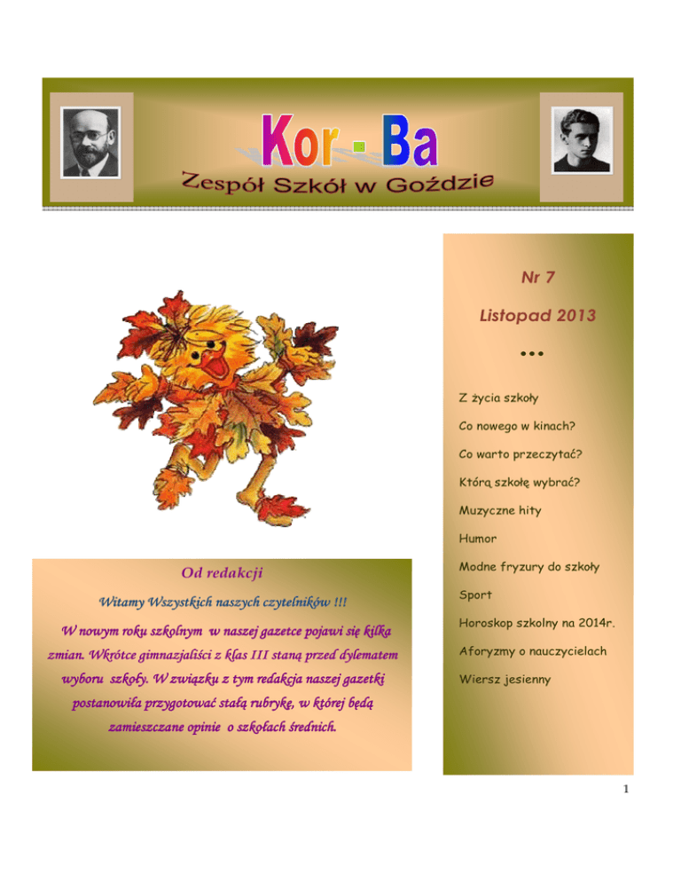 Nr 7 Listopad 2013 ••• Z życia szkoły Co nowego w kinach? Co warto przeczytać? Którą szkołę wybrać? Muzyczne hity Humor Od redakcji Witamy Wszystkich naszych czytelników !!! W nowym roku szkolnym w naszej gazetce pojawi się kilka zmian. zmian. Wkrótce gimnazjaliści z klas III staną przed dylematem wyboru szkoły. W związku z tym redakcja naszej gazetki Modne fryzury do szkoły Sport Horoskop szkolny na 2014r. Aforyzmy o nauczycielach Wiersz jesienny postanowiła przygotować stałą rubrykę, w której będą zamieszczane zamieszczane opinie o szkołach średnich. średnich. 1 Z życia szkoły Dzień Bezpiecznej Drogi do Szkoły 27 września 2013roku w Publicznej Szkole Podstawowej odbył się Dzień Bezpiecznej Drogi do Szkoły. Nasza szkoła pełniła honory gospodarza imprezy. W projekcie udział wzięły wszystkie szkoły podstawowe z terenu gminy Gózd. Dla uczniów klas I-III organizatorzy przygotowali konkursy plastyczne, dla uczniów klas IV zadaniem konkursowym był przejazd po torze rowerowym. Wszyscy uczestnicy otrzymali zestawy rowerzysty oraz podręczniki „Moje pierwsze prawo jazdy”. Osoby wyróżnione w konkursach zdobyły nagrody rzeczowe, wśród których znalazły się gry i konsole. Pielgrzymkowy Rajd Świętokrzyski 28 września 2013 roku uczniowie Publicznego Gimnazjum wzięli udział w Pielgrzymkowym Rajdzie Świętokrzyskim zorganizowanym przez panią Dorotę Łakotę. Podczas rajdu opiekę nad uczniami sprawowali także: pani Izabela Kowalik, pani Edyta Miernik, pani Dorota Góralska oraz pan Paweł Gregorczyk. Którą szkołę wybrać... Jesteś uczniem klasy III gimnazjum? Masz dylemat, którą szkołę wybrać? Redakcja naszej gazetki wyszła naprzeciw Waszym oczekiwaniom i postanowiła przygotować stałą rubrykę, w której znajdą się opinie naszych starszych kolegów o szkołach, do których obecnie uczęszczają. W dzisiejszym numerze przedstawiamy Wam wypowiedź jednego z uczniów Liceum Ogólnokształcącego im. Dionizego Czachowskiego w Radomiu. Dlaczego Czachowski? Liceum im. Dionizego Czachowskiego to elitarne liceum, o wysokim poziomie kształcenia, doskonale przegotowujące do matury. Profil humanistyczny z językiem angielskim jest idealny dla językowców. Nauczyciele są wymagający, zwłaszcza nauczyciele uczący przedmiotów wiodących na danym profilu. Liceum cechuje wysoka zdawalność matur. Ponadto Liceum Czachowskiego wyróżnia bogata oferta zajęć pozalekcyjnych. Wystarczą tylko chęci do rozwijania swoich zainteresowań i umiejętności. Asia Liwińska:) 2 Co nowego w kinach? kinach? W ostatnim czasie do kin trafił film pt. „ Chce się żyć ‘’. Jest to dość ciekawy film, opowiadający o niepełnosprawnym chłopaku. Kiedy Mateusz przyszedł na świat, lekarze wydali na niego wyrok, uznając go za „roślinę”. Jednak rodzice chłopca (Arkadiusz Jakubik i Dorota Kolak) nigdy nie pogodzili się z diagnozą, wierząc, że mimo problemów z komunikacją, ich syn jest w pełni sprawny intelektualnie. Mateusz dorastał otoczony troską i miłością, zyskując wiernego przyjaciela, mieszkającą w sąsiedztwie Ankę (Anna Karczmarczyk). Jednak los sprawia, że musi rozłączyć się z rodziną i trafia do specjalistycznego ośrodka. Z dala od bliskich podejmuje trudną walkę o godność i prawo do normalnego życia. Sytuacja Mateusza zmieni się, kiedy do placówki trafi młoda wolontariuszka (Katarzyna Zawadzka), a on sam przyciągnie uwagę lekarki (Anna Nehrebecka), która pracuje nad eksperymentalnymi metodami leczenia. Polecam osobom, które nie boją się łez! Natalia Tatar:) Co warto przeczytać? przeczytać? Dzisiaj zaprezentuję Wam książkę pt. „Nie moja córka”. Głównym wątkiem utworu są rozterki samotnej matki, dla której ciąża siedemnastoletniej córki to niewyobrażalna tragedia. Kiedy Susan dowiaduje się, że Lily, zachodzi w zaplanowaną ciążę, jej świat wywraca się do góry nogami. Młoda kobieta zaczyna zdawać sobie sprawę, że nie uchroniła córki przed jej błędami z młodości. Wieści szybko rozchodzą się po miasteczku, a ludzie zaczynają plotkować o pakcie jaki zawarły uczennice szkoły średniej. Szczerze powiem, że „Nie moja córka” jest pierwszą książką Barbary Delinsky, którą przeczytałam, jednak po tym bestsellerze mam ochotę na większą dawkę jej twórczości. Styl tej pisarki jest lekki i zrozumiały, lecz sądzę, że dla osób, które lubią ogólniki może być męcząca, ponieważ widać, że autorka lubi opisywać szczegóły. Książka jest przede wszystkim przestrogą dla nastolatek, ale także miłą i przyjemną odskocznią od własnych problemów. Gorąco polecam! Asia Liwińska:) 3 Humor Na lekcji pani nauczycielka kazała wszystkim uczniom powiedzieć jakiego zwierzaka mają w domu. Doszło do Jasia, nauczycielka spytała: - Jasiu jakie masz zwierzątko w domu ?? A Jaś na to: - Kurczaka w zamrażalniku. Babcia mówi do Jasia: - Ja też kiedyś chodziłam do przedszkola. - A kiedy? - Dawno temu. - Bardzo dawno? - Bardzo. - Gdy byłaś jeszcze małpką? Jasio poszedł z tatą do cyrku. Podczas przedstawienia z uwagą obserwuje, jak mężczyzna przebrany za kowboja jeździ wokół areny na koniu i rzuca nożami w ścianę, pod którą stoi kobieta. Widzowie klaszczą. - Z czego się oni tak cieszą? - dziwi się Jasio. - Przecież ani razu nie trafił! Jasiu, jeśli przed sobą masz północ, po lewej ręce zachód, a po prawej wschód, to co masz z tyłu? - pyta nauczyciel geografii. - Powiedziałbym, ale się wstydzę - odpowiada Jasiu. Marzenia Pani zadała temat wypracowania: "Kim będziesz jak dorośniesz". Jaś napisał w wypracowaniu: "Najpierw będę lekarzem, bo tak chce tata. Potem zostanę prawnikiem, jak chce mama. A na końcu zostanę kominiarzem, bo mi się też coś od życia należy..." Mały chłopczyk pyta kolegę: - Jak myślisz, czy Święty Mikołaj istnieje? - Istnieje. - A skąd wiesz? - Bo rodzice