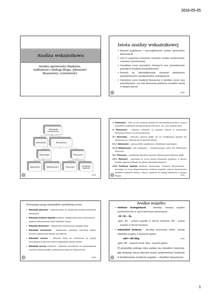 2016-05-05 Istota analizy wskaźnikowej Stanowi pogłębienie i uszczegółowienie analizy sprawozdań finansowych Analiza wskaźnikowa Jest to najszerzej stosowane narzędzie analizy strukturalnej, czasowej i przestrzennej Umożliwia ocenę przeszłych, bieżących oraz przewidywanie Analiza sprawności działania, zadłużenia i obsługi długu, płynności finansowej, rentowności przyszłych wyników przedsiębiorstwa Pozwala na zidentyfikowanie obszarów działalności przedsiębiorstwa nieodpowiednio zarządzanych, Umożliwia ocenę kondycji finansowej w krótkim czasie oraz przewidywanie, czy stan finansowy podmiotu umożliwi rozwój w długim okresie. 16:28 2 1. Zewnętrzne – dane do ich ustalenia (licznik lub mianownik) pochodzą z innych materiałów źródłowych niż sprawozdania finansowe, np. cena rynkowa akcji Wskaźniki ekonomiczne 2. Wewnętrzne – obliczane wyłącznie na postawie danych ze sprawozdań finansowych firmy i są ich interpretacją 2.1 Operacyjne – dotyczące operacji spółki, ale nie uwzględniają sposobu ich sfinansowania. Odnoszą się do aktywów bilansu Zewnętrzne Wewnętrzne 2.1.1 Aktywności – opisują efekty uzyskiwane z działalności operacyjnej 2.1.2 Efektywności, czyli wydajności – charakteryzujące obrót lub efektywność inwestycji Operacyjne Finansowe 2.2 Finansowe – umożliwiają określenie sposobu sfinansowania aktywów spółki 2.2.1 Płynności – pozwalają na ocenę pozycji finansowej podmiotu w okresie krótkim, głównie zdolności do spłaty zobowiązań bieżących Aktywności Efektywności Płynności Struktury kapitału 2.2.2 Struktury kapitału (zasilenia finansowego, struktury finansowania) – pozwalają na ocenę długoterminowej struktury kapitału, zakresu finansowania podmiotu kapitałem własny i obcym, zdolności do obsługi zadłużenia w okresie 16:28 3 4 16:28 długim. Analiza majątku Następujące grupy wskaźników umożliwiają ocenę: wielkości Wskaźniki płynności – zdolności firmy do regulowania krótkoterminowych Wskaźnik aktywności – efektywności wykorzystania majątku firmy Wskaźniki rentowności – wzrostu – zdolności firmy wskaźników struktury – określają procentowy udział sprzedaży, inwestycji będąca danego składnika majątku w aktywach ogółem do zachowania jej pozycji uMT = MT/Mog ekonomicznej w procesie wzrostu gospodarki danego sektora majątku majątku w okresie bazowym wyrazem efektywności działań menedżerów Wskaźniki rozmiary gdzie: M1 – poziom majątku w okresie badanym; M0 – poziom stopienia sfinansowania firmy kapitałem obcym określają ∆M = M1 – M0 Wskaźnik struktury kapitału (zasilenia, dźwigni finansowej, lewarowania) - zyskowności – przedsiębiorstwa w ujęciu kwotowym (pieniężnym) zobowiązań bezwzględnych 16:28 gdzie: MT – majątek trwały, Mog – majątek ogółem Wskaźniki wyceny (rynkowe) – zdolności menedżerów do maksymalizacji W przypadku jednego roku analiza ma charakter statyczny, wartości rynkowej spółki i powiększania bogactwa akcjonariuszy gdy obejmuje więcej okresów można zaobserwować tendencje 5 16:28 6 w kształtowaniu struktury majątku – charakter dynamiczny 1 2016-05-05 Wskaźniki relacji – obrazują stosunek pomiędzy poszczególnymi Wskaźniki obrotowości grupami aktywów na określony moment. Umożliwiają Podstawowy wskaźnik struktury majątkowej Aktywa trwałe (Wsk. unieruchomienia majątku) Aktywa obrotowe Licznik: wskaźnik dynamiczny wyrażający przychód ze sprzedaży Określa stopień elastyczności przedsiębiorstwa w dostosowywaniu w cenach brutto, netto lub kosztach własnych się do zmian warunków rynkowych. Mianownik: >1 oznacza, że w strukturze majątku dominują aktyw trwałe. wskaźnik statyczny wyrażający przeciętny stan zaangażowanego majątku Struktura majątkowa jest sztywna, mało elastyczna. Mówimy o Dla znacznym poziomie unieruchomienia majątku. < 1 oznacza przewagę majątku obrotowego w aktywach. Struktura działalność produkcyjną (przemysłowe, transportowe) określany mianem przedsiębiorstw prowadzących wskaźnika produktywności majątku, którego odwrotnością jest wskaźnik majątkowa jest elastyczna, większe możliwości w przeprowadzaniu zaangażowania majątku. zmian. Oba wskaźniki wyrażają stopień efektywności wykorzystania = 1 struktura jest przeciętnie sztywna, średnio elastyczna. 7 ocenę efektywności gospodarowania majątkiem, wykorzystania zasobów majątkowych przedsiębiorstwa Odwrotnością to wskaźnik elastyczności majątku Em= MO/MT Wskaźnik produktywności aktywów (majątku) (Wskaźnik obrotu aktywami ogółem) Total assets turnover zaangażowanych w działalności zasobów majątkowych lub też 16:28 całości kapitałów ulokowanych w majątku trwałym i obrotowym 16:28 8 Pozytywnie przychody netto ze sprzedaży będzie oceniany wyższy (niższy) poziom wskaźnika produktywności (zaangażowania majątku) lub przeciętny stan aktywów obserwowana tendencja wzrostowa (malejąca) w roku Określa efekt produkcyjny przedsiębiorstwa uzyskany z jednostki badanym: zaangażowanego majątku ogółem (z 1 zł) świadczy Jest miarą szybkości krążenia, ilości cykli obrotu majątku w to o wyższej efektywności wykorzystania zasobów majątkowych, danym okresie (wielkość niemianowana) poprawie wykorzystania majątku, Wskaźnik zaangażowania majątku przeciętny stan aktywów (Wskaźnik majątkochłonności) Engagement of assets przychody netto ze sprzedaży przyspieszeniu krążenia, zmniejszeniu zaangażowania dla uzyskania jednostki Określa wartość majątku, jaki został zaangażowany dla uzyskania efektu jednostki przychodu ze sprzedaży (1 zł) Przeciętny stan aktywów = (stan na początku roku + stan na koniec roku)/2 16:28 9 16:28 10 Relacja majątek- praca-produkcja - wynik finansowy Wskaźnik produktywności aktywów trwałych tzw. wzorcowy układ nierówności przychody netto ze sprzedaży (Wska