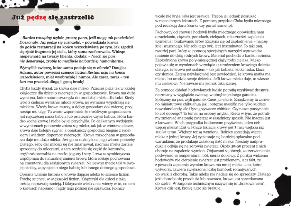 Już pędzę się zastrzelić – Bardzo rozsądny wybór, proszę pana, jeśli mogę tak powiedzieć. Doskonały. Już pędzę się zastrzelić. – powiedziała krowa do gościa restauracji na końcu wszechświata po tym, jak zgodził się zjeść fragment jej ciała, który sama zaoferowała. Widząc niepewność na twarzy klienta, dodała: – Niech się pan nie denerwuje, zrobię to możliwie najbardziej humanitarnie. Wymyślić zwierzę, które samo podaje się w ofercie? Douglas Adams, autor powieści science fiction Restauracja na końcu wszechświata, miał wyobraźnię i humor. Ale zaraz, zaraz – ten żart ma przecież długą i gęstą brodę! Chyba każdy słyszał, że krowa daje mleko. Przecież piszą tak w każdej książeczce dla dzieci o zwierzętach w gospodarstwie. Krowa ma duże wymiona, które natura stworzyła do produkcji mleka dla ludzi. Kiedy tylko z cielęcia wyrośnie młoda krowa, jej wymiona wypełniają się mlekiem. Wtedy krowa muczy, a dobry gospodarz doi zwierzę, przynosząc mu ulgę. Tu warto wspomnieć, że troskliwym gospodarzem jest najczęściej nasza babcia lub ostatecznie czyjaś babcia, która bardzo kocha krowę i nieba by jej przychyliła. Po delikatnym wydojeniu w wymionach ponownie zbiera się mleko, tak jak w chmurze deszcz, krowa daje kolejny sygnał, a opiekuńczy gospodarz biegnie z zydelkiem i wiadrem dopomóc zwierzęciu. Krowa rozkochana w gospodarzu daje mu dużo mleka. Jest go za dużo jak na jego własne potrzeby. Dlatego, żeby dar miłości się nie zmarnował, nadmiar mleka zostaje sprzedany do mleczarni, a tam rozdziela się część do kartonów, część zaś przerabia na masło, jogurty i sery. I trwa ta symbiotyczna współpraca do naturalnej śmierci krowy, która zostaje pochowana na cmentarzu dla zasłużonych zwierząt. Na pewno macie taki w swojej okolicy, zapytajcie o niego babcię lub innego dobrego gospodarza. Opisana właśnie historia o krowie dającej mleko to science fiction. Trochę science, w większości fiction. Książeczki dla dzieci z taką treścią naprawdę istnieją. I faktycznie wielu z nas wierzy w to, co tam o krowach napisano i nigdy tego później nie sprawdza. Rolnicy wcale nie kryją, jaka jest prawda. Trzeba jej jednak poszukać w nieco innych lekturach. Z pomocą przyjdzie Chów bydła mlecznego pod redakcją Jana Szarka czy portal farmer.pl. Fachowcy od chowu i hodowli bydła mlecznego opowiedzą nam o zacielaniu, ciążach, porodach, cielętach, mleczności, zapaleniu wymienia i brakowaniu krów. Zaczyna się od zapłodnienia – najczęściej sztucznego. Nie robi tego byk, lecz inseminator. To taki pan, rzadziej pani, który za pomocą specjalnych narzędzi wprowadza nasienie do dróg rodnych krowy. Materiał pochodzi z banku nasienia. Zapłodniona krowa po 9-miesięcznej ciąży rodzi cielaka. Mleko pojawia się w wymionach w związku z urodzeniem krowiego dziecka dlatego, że krowa jest ssakiem – tak jak kobieta, kotka, suka, klacz czy słonica. Zatem najwłaściwiej jest powiedzieć, że krowa matka ma mleko, bo urodziła swoje dziecko. Jeśli krowa mleko daje, to własnemu cielakowi. Nie zawsze ma jednak taką szansę. Za pomocą działań hodowlanych ludzie potrafią uzyskiwać drastyczne zmiany w wyglądzie zwierząt w obrębie jednego gatunku. Spójrzmy na psa, czyli gatunek Canis familiaris. Znajdziemy tu zarówno miniaturowe chihuahua jak i potężne mastiffy, nie tylko kudłate nowofundlandy, ale i łyse grzywacze chińskie. Czy nasze poczynania to coś dobrego? To temat na osobny artykuł. Rzecz w tym, że potrafimy zmieniać anatomię zwierząt w zasadniczy sposób. Nie inaczej jest z krowami. W ich przypadku hodowcom przyświeca jeden cel: więcej mleka! Dziś w Polsce laktacja krowy jest 3 razy większa niż 100 lat temu. Większe też są wymiona. Rolnicy sprzedają więcej mleka z jednej krowy. Jej życie staje się bardziej opłacalne pod warunkiem, że produkuje założoną ilość mleka. Niestety nadprodukcja odbija się na zdrowiu zwierząt. Około 30–50 procent z nich choruje na zapalenie wymion. Objawami są obrzęk, zaczerwienienie, podwyższona temperatura i ból, nieraz dotkliwy. Z punktu widzenia hodowców nie cierpienie zwierząt jest problemem, lecz fakt, że z powodu zapalenia wymion krowa ma mniej mleka, a to, które wytworzy, zawiera zwiększoną liczbę komórek somatycznych do walki z chorobą. Takie mleko nie nadaje się do sprzedaży. Dlatego jeśli choroba się przedłuża lub nawraca, krowa jest sprzedawana do rzeźni. W żargonie technicznym nazywa się to „brakowaniem”. Krowa dziś jest, krowę jutro się brakuje.