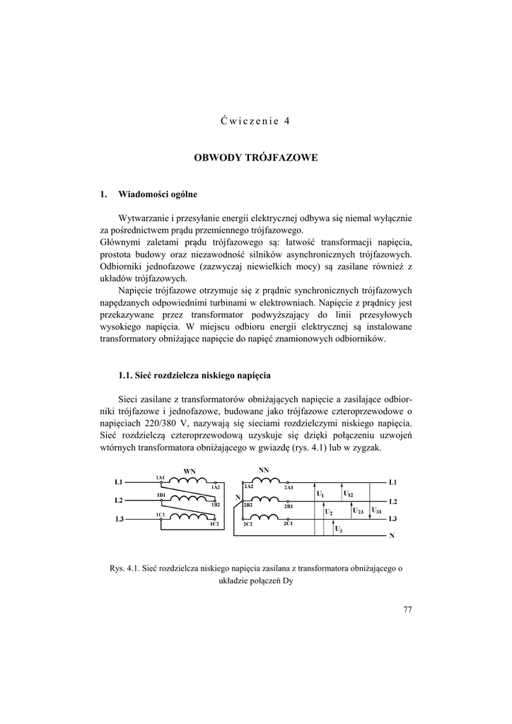 Ćwiczenie 4 OBWODY TRÓJFAZOWE 1. Wiadomości ogólne Wytwarzanie i przesyłanie energii elektrycznej odbywa się niemal wyłącznie za pośrednictwem prądu przemiennego trójfazowego. Głównymi zaletami prądu trójfazowego są: łatwość transformacji napięcia, prostota budowy oraz niezawodność silników asynchronicznych trójfazowych. Odbiorniki jednofazowe (zazwyczaj niewielkich mocy) są zasilane również z układów trójfazowych. Napięcie trójfazowe otrzymuje się z prądnic synchronicznych trójfazowych napędzanych odpowiednimi turbinami w elektrowniach. Napięcie z prądnicy jest przekazywane przez transformator podwyższający do linii przesyłowych wysokiego napięcia. W miejscu odbioru energii elektrycznej są instalowane transformatory obniżające napięcie do napięć znamionowych odbiorników. 1.1. Sieć rozdzielcza niskiego napięcia Sieci zasilane z transformatorów obniżających napięcie a zasilające odbiorniki trójfazowe i jednofazowe, budowane jako trójfazowe czteroprzewodowe o napięciach 220/380 V, nazywają się sieciami rozdzielczymi niskiego napięcia. Sieć rozdzielczą czteroprzewodową uzyskuje się dzięki połączeniu uzwojeń wtórnych transformatora obniżającego w gwiazdę (rys. 4.1) lub w zygzak. Rys. 4.1. Sieć rozdzielcza niskiego napięcia zasilana z transformatora obniżającego o układzie połączeń Dy 77 Przewody fazowe L1, L2, L3 sieci rozdzielczej (faza L1, faza L2, faza L3) przyłączone są do początków 2A1, 2B1, 2C1 uzwojeń wtórnych transformatora. Przewód neutralny N przyłączony jest do punktu neutralnego, który tworzą złączone razem końce 2A2, 2B2, 2C2 tych uzwojeń. Napięcia fazowe U1, U2, U3 występują między przewodem neutralnym N a poszczególnymi przewodami fazowymi (rys. 4.1). Napięcia fazowe zmieniają się w czasie wg zależności: u1 = U m sin ωt , u 2 = U m sin(ωt − 120° ) , (4.1) u 3 = U m sin(ωt − 240° ) , gdzie: u1, u2 , u3 - wartości chwilowe napięć fazowych, Um - amplituda napięcia fazowego. Wykresy zależności (4.1) przedstawia rys. 4.2a, natomiast wykres wskazowy tych zależności w odniesieniu do wartości skutecznych przedstawia rys. 4.2b. Rys. 4.2. Napięcia fazowe trójfazowej czteroprzewodowej sieci rozdzielczej: a) przebiegi czasowe, b) wykres wskazowy napięć fazowych, c) wykres wskazowy napięć międzyprzewodowych W sieci trójfazowej symetrycznej, napięcia fazowe posiadają tę samą wartość skuteczną i są przesunięte wzajemnie o 120°. Suma algebraiczna wartości chwilowych napięć fazowych jest równa zeru, u1 + u2 + u3 = 0 , (4.2) jak również suma geometryczna wartości skutecznych napięć fazowych (rys. 4.2b) jest równa zeru, U1 + U2 + U3 = 0. 78 (4.3) Napięcia międzyprzewodowe, lub krócej napięcia przewodowe U12, U23, U31 występują między poszczególnymi przewodami fazowymi L1, L2, L3 sieci rozdzielczej (rys. 4.1). Przy symetrycznym układzie napięć fazowych, otrzymuje się również symetryczny układ napięć przewodowych: U12 = U23 = U31 = Up = U. Dla układu symetrycznego napięcie przewodowe Up jest napięcia fazowego Uf : (4.4) 3 razy większe od Up = 3Uf . (4.5) Na wykresie wskazowym napięcia przewodowe układu trójfazowego przedstawia się w postaci trójkąta (rys. 4.2c). 1.2. Odbiorniki trójfazowe Odbiorniki trójfazowe mogą być kojarzone w gwiazdę ( ) lub w trójkąt (∆). Zaciski początkowe odbiorników składowych są oznaczone: U1, V1, W1, natomiast końcowe odpowiednio: U2, V2, W2. Jeżeli odbiornik jest skojarzony w gwiazdę lub w trójkąt w sposób trwały, to ma tylko 3 zaciski (końcówki) oznaczone literami U, V, W do których przyłącza się przewody fazowe sieci zasilającej. Zasady kojarzenia odbiorników trójfazowych w gwiazdę i w trójkąt przedstawiono na rys. 4.3. Muszą być one przestrzegane przy urządzeniach elektromagnetycznych np. silnikach asynchronicznych 3 – fazowych. Rys. 4.3. Odbiornik trójfazowy: a) gwiazdowy zasilany z sieci trójfazowej czteroprzewodowej, b) trójkątowy zasilany z sieci trójfazowej 79 Odbiornik trójfazowy jest symetryczny jeżeli impedancje odbiorników fazowych są jednakowe: ZU = ZV = ZW = Z , (4.6) oraz są jednakowe ich współczynniki mocy: cosϕU = cosϕV = cosϕW = cosϕ . (4.7) sinϕU = sinϕV = sin ϕW = sin ϕ . (4.8) Odbiornik gwiazdowy niesymetryczny, zasilanie trójfazowe czteroprzewodowe. Napięcia na poszczególnych odbiornikach fazowych (rys. 4.3a) są takie same i równe napięciom fazowym sieci (U1 = U2 = U3 = Uf). Znając wartości napięć fazowych oraz impedancje poszczególnych odbiorników składowych, możemy obliczyć wartości skuteczne prądów płynących w przewodach fazowych zasilających odbiornik, z zależności: I1 = Uf U U , I2 = f , I3 = f . ZU ZV ZW (4.9) Współczynniki mocy odbiorników fazowych: cos ϕ U = RU R R , cos ϕ V = V , cos ϕ W = W . ZU ZV ZW (4.10) Wykres wskazowy napięć i prądów rozpatrywanego układu przedstawia rys. 4.4a. Rys. 4.4. Wykresy wskazowe odbiornika gwiazdowego zasilanego z sieci trójfazowej czteroprzewodowej: a) odbiornik niesymetryczny o obciążeniu czynno-indukcyjnym, b) odbiornik symetryczny o obciążeniu czynnym Prąd IN w przewodzie neutralnym równa się sumie geometrycznej prądów płynących w przewodach fazowych (rys. 4.4a): 80 IN = I1 + I2 + I3 . (4.11) Odbiornik gwiazdowy symetryczny. Prądy płynące w przewodach fazowych zasilających odbiornik posiadają tę samą wartość: I1 = I 2 = I 3 = I = Uf Z (4.12) i tworzą symetryczny układ trójfazowy (rys. 4.4b). Suma geometryczna prądów w przewodach fazowych zasilających odbiornik równa się zeru; I1 + I2 + I3 = IN = 0 . (4.13) Prąd w przewodzie neutralnym nie płynie. Odbiornik gwiazdowy symetryczny nie wymaga przewodu neutralnego. Do odbiorników symetrycznych zalicza się: silniki trójfazowe, trójfazowe oporowe urządzenia grzejne itp. Odbiornik gwiazdowy niesymetryczny, zasilanie trójfazowe trójprzewodowe. Napięcia prz