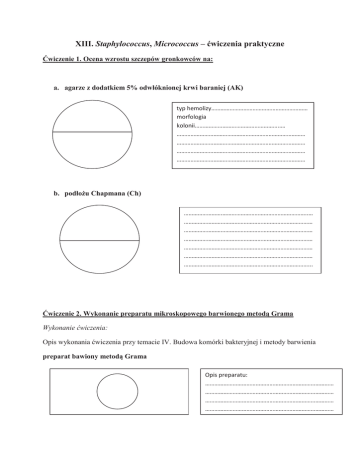 XIII. Staphylococcus, Micrococcus – ćwiczenia praktyczne Ćwiczenie 1. Ocena wzrostu szczepów gronkowców na: a. agarze z dodatkiem 5% odwłóknionej krwi baraniej (AK) typ hemolizy……………………………………………………… morfologia kolonii………………………………………………..… ………………………………………………………………………… ………………………………………………………………………… ………………………………………………………………………… ………………………………………………………………………… ………………………………………………………………………... b. podłożu Chapmana (Ch) …………………….………………………………………………..… ………………………………………………………………………… ………………………………………………………………………… ………………………………………………………………………… ………………………………………………………………………… ………………………………………………………………………… ………………………………………………………………………... Ćwiczenie 2. Wykonanie preparatu mikroskopowego barwionego metodą Grama Wykonanie ćwiczenia: Opis wykonania ćwiczenia przy temacie IV. Budowa komórki bakteryjnej i metody barwienia preparat bawiony metodą Grama Opis preparatu: ………………………………………………………………………… ………………………………………………………………………… ………………………………………………………………………… ………………………………………………………………………… Ćwiczenie 3. Oznaczanie cech biochemicznych gronkowców i mikrokoków - wykonanie próby na katalazę Wykonanie ćwiczenia: Opis wykonania ćwiczenia przy temacie VI. Fizjologia bakterii Szczep badany ……………………………….. ……………………………………. obserwowane wyniki Wnioski ...................................................................................................................................... ………………………………………………………………………………….……………… …………………………………………………………………………………………………. Ćwiczenie 4. Różnicowanie gronkowców i mikrokoków za pomocą testu z furazolidonem Zasada metody: Szczepy gronkowców są wrażliwe na furazolidon. Szczepy mikrokoków są oporne na furazolidon. Wykonanie oznaczenia: 1. Czystą hodowlę (pojedynczą kolonię) badanego szczepu, zidentyfikowanego jako gronkowiec koagulazo-ujemny, o gęstości około 0,5 McFarlanda posiać na podłoże Mullera-Hintona a następnie nałożyć krążek bibułowy nasycony 100 µg furazolidonu (można wykonać identyfikację kilku szczepów równocześnie, posiewając badane szczepy promieniście i nakładając krążek centralnie na płytkę). 2. Płytki z nałożonymi krążkami należy preinkubować przez 15 minut w temperaturze pokojowej, następnie hodowlę inkubować 18-24 godzin, w temperaturze 35° C, w atmosferze tlenowej. 3. Odczytać wielkość strefy zahamowania wzrostu wokół krążka z furazolidonem. Wielkość ≥ 15 mm świadczy o wrażliwości na furazolidon. Micrococcus spp. furazolidon 100µg Staphylococcus spp. Wnioski: ………………………………………………………………………………………………… ………………………………………………………………………………………………… ………………………………………………………………………………………………… …………………………………………………………………………………………………. Ćwiczenie 5. Różnicowanie gronkowców koagulazododatich i koagulazoujemnych za pomocą próby na koagulazę Koagulaza jest enzymem uwalnianym do otoczenia przez niektóre szczepy gronkowców, np.: gronkowca złocistego (Staphylococcus aureus). Działa ona podobnie jak protrombina i zawarty w osoczu fibrynogen przekształca w fibrynę. W wyniku tej reakcji osocze ulega wykrzepianiu. Wykonanie: 1. Próbę na koagulazę wykonuje się w małych, wąskich probówkach. 2. Używa się świeżego lub liofilizowanego osocza króliczego rozcieńczonego w stosunku 1:5 roztworem 0,9% NaCl (zgodnie z instrukcją dołączoną przez producenta). 3. Do 0,5 ml osocza króliczego dodaje się 1 pełne oczko ezy 18-24 godzinnej hodowli bakteryjnej. 4. Próbę inkubuje się przez 4 godziny w temperaturze 370C. 5. O dodatniej próbie świadczy powstanie skrzepu. 6. W przypadku próbek ujemnych (osocze pozostaje płynne) inkubację przedłuża się do 18 godzin i ponownie odczytuje wynik. Należy pamiętać, że szczepy gronkowców koagulazododatnich mogą wytwarzać fibrynolizynę, która upłynnia powstały skrzep (wynik fałszywie ujemny). Badany szczep …………………………… wynik …………………………….. Wnioski ...................................................................................................................................... ………………………………………………………………………………….……………… …………………………………………………………………………………………………. Ćwiczenie 6. Identyfikacja szczepu Staphylococcus aureus z wykorzystaniem testu Staphytect plus. Zasada metody: STAPHYTECT PLUS firmy Oxoid – lateksowy test oparty na reakcji aglutynacji, umożliwia detekcję S. aureus, na podstawie wykrycia trzech antygenów: białka A, czynnika CF, polis