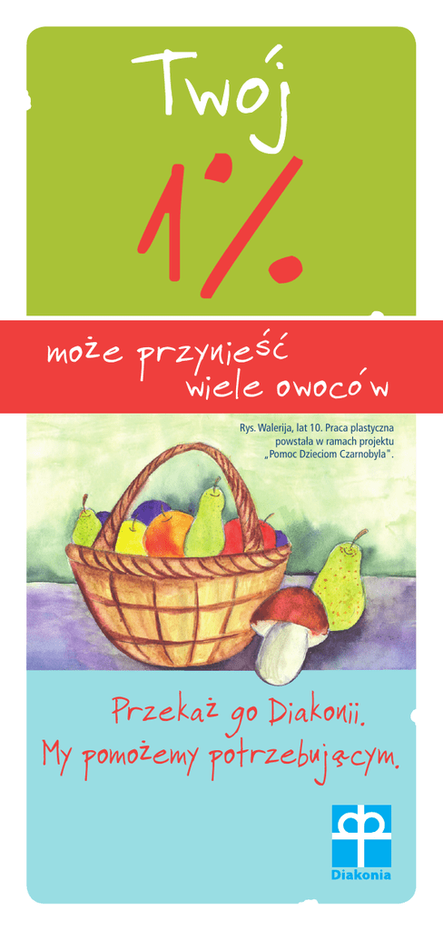 1% może przynieść wiele owoców Rys. Walerija, lat 10. Praca plastyczna powstała w ramach projektu „Pomoc Dzieciom Czarnobyla". Przekaż go Diakonii. My pomożemy potrzebującym. Od ponad 20 lat Diakonia Kościoła Ewangelicko-Augsburskiego w Polsce prowadzi działalność charytatywną na rzecz osób starszych, niepełnosprawnych, dzieci, młodzieży i rodzin w trudnej sytuacji życiowej. Niesiemy także pomoc ludziom w sytuacji katastrof i klęsk żywiołowych, a mottem biblijnym naszych działań są słowa: „Cokolwiek uczyniliście jednemu z tych najmniejszych moich braci, mnie uczyniliście” (Mt 25,40). Od 2006 roku jesteśmy organizacją pożytku publicznego i w ramach tego statusu możemy pozyskiwać 1 proc. podatku dochodowego od wszystkich płatników. Dzięki funduszom uzyskanym z 1% za rok podatkowy 2012 udało nam się pomóc wielu osobom i instytucjom diakonijnym w Polsce. Dzięki tym środkom mogliśmy: • dofinansować wyjazd wakacyjny dzieci i młodzieży z ubogich rodzin; • zakupić podręczniki i wyprawki szkolne; • dofinansować dojazdy szkolne; • przygotować paczki świąteczne dla dzieci i seniorów; • zakupić lekarstwa i opał dla uboższych parafian; • pomóc osobom z niepełnosprawnością; • dofinansować zakup sprzętu rehabilitacyjnego i medycznego; • wesprzeć domy opieki, środowiskowe domy samopomocy i świetlice socjoterapeutyczne; • pomóc rodzinom w trudnych sytuacjach losowych. Dzięki Państwa wsparciu udało nam się pomóc około 500 osobom. Serdecznie dziękujemy za coroczne wspieranie naszych akcji! W 2014 roku nadal chcemy wspierać osoby w trudnej sytuacji socjalnej poprzez: • działalność świetlic środowiskowych i socjoterapeutycznych; • programy dla osób starszych i z niepełnosprawnością; • działalność poradnictwa „Przeciw przemocy”; • Program „Równe szanse” – stypendia dla dzieci i młodzieży (zakup podręczników i obiadów szkolnych, opłacenie dojazdów do szkoły); • zakup leków i rehabilitację osób chorych; • projekty, które łączą pokolenia. Diakonia Kościoła Ewangelicko-Augsburskiego w Rzeczypospolitej Polskiej KRS 0000260697 Biuro Diakonii Polskiej 00-246 Warszawa, ul. Miodowa 21, tel. +48 (22) 88 70 216 e-mail: [email protected] www.diakonia.org.pl Jak wypełnić formularz PIT, by wesprzeć działania Diakonii Polskiej? Aby przekazać 1 % podatku za rok 2013, należy w rocznym rozliczeniu podatkowym (PIT-28, PIT-36, PIT-36L, PIT-37, PIT-38, PIT-39) wpisać w odpowiednich pozycjach nr KRS Diakonii: 0000260697 oraz wyliczoną kwotę 1 % podatku. PIT-28 w części M, w poz. 125 nr KRS, w poz. 126 wyliczoną kwotę 1 % podatku PIT-36 w części O, w poz. 301 nr KRS, w poz. 302 wyliczoną kwotę 1 % podatku PIT-36L w części N, w poz. 104 nr KRS, w poz. 105 wyliczoną kwotę 1 % podatku PIT-37 w części H, w poz. 122 nr KRS, w poz. 123 wyliczoną kwotę 1 % podatku PIT-38 w części G, w poz. 57 nr KRS, w poz. 58 wyliczoną kwotę 1 % podatku PIT-39 w części G, w poz. 50 nr KRS, w poz. 51 wyliczoną kwotę 1 % podatku Każde zeznanie podatkowe zawiera dodatkową rubrykę informacje uzupełniające, w której można podać cel i inne dane kontaktowe podatnika. Wypełnienie tej rubryki nie jest obowiązkowe. Wpisaną przez Państwa kwotę 1 % podatku Urząd Skarbowy przesyła na konto Diakonii.