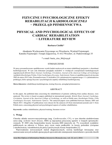 Medycyna fizykalna / Physical medicine FIZYCZNE I PSYCHOLOGICZNE EFEKTY REHABILITACJI KARDIOLOGICZNEJ − PRZEGLĄD PIŚMIENNICTWA PHYSICAL AND PSYCHOLOGICAL EFFECTS OF CARDIAC REHABILITATION − LITERATURE REVIEW Barbara Cieślik* Akademia Wychowania Fizycznego we Wrocławiu, Wydział Fizjoterapii, Katedra Fizjoterapii i Terapii Zajęciowej, 51-612 Wrocław, ul. Paderewskiego 35 * e-mail: [email protected] STRESZCZENIE W pracy przeanalizowano opublikowane wyniki badań naukowych na temat rehabilitacji pacjentów z chorobami kardiologicznymi. W tym celu dokonano przeglądu artykułów w wiodących czasopismach kardiologicznych zagranicznych (British Heart Journal, Cardiology, Circulation, Journal of the American College of Cardiology) i polskich (Kardiologia Polska, Folia Cardiologica Excerpta, Nadciśnienie Tętnicze) opublikowanych od stycznia 2005 do marca 2015 roku. Przeanalizowano 35 artykułów (24 z piśmiennictwa zagranicznego i 11 z piśmiennictwa polskiego), które opisują fizyczne i psychologiczne aspekty rehabilitacji kardiologicznej. Słowa kluczowe: rehabilitacja kardiologiczna, trening fizyczny, przegląd piśmiennictwa ABSTRACT In this paper, the published data concerning the rehabilitation of patients suffering from cardiac diseases, were analyzed. The review is based on papers published in international journals: British Heart Journal, Cardiology, Circulation, Journal of the American College of Cardiology, as well as Polish ones: Kardiologia Polska, Folia Cardiologica Excerpta, Nadciśnienie Tętnicze. The analyzed papers were published between January 2005 and March 2015. Altogether 35 publications were chosen for the analysis (24 from international journals and 11 from Polish ones), concerning physical and psychological aspects of cardiac rehabilitation. Keywords: cardiac rehabilitation, physical training, literature review 1. Wstęp Choroby układu sercowo-naczyniowego (ang. Cardiovascular, CV), w tym choroba niedokrwienna serca (ang. ischemic heart disease, IHD) są najczęstszą przyczyną zgonów w krajach uprzemysłowionych. W 2005 roku bezpośrednie koszty leczenia IHD stanowiły ok. 7% wszystkich wydatków publicznych na zdrowie w Polsce, przy czym warto podkreślić, że koszty pośrednie (związane z nieobecnością i niezdolnością do pracy) przewyższyły koszty bezpośrednie [1]. Wprowadzenie nowoczesnych metod diagnostycznych, rozwój kardiologii inwazyjnej oraz zastosowanie nowych technik operacyjnych spowodowało zmniejszenie śmiertelności z powodu chorób Acta Bio-Optica et Informatica Medica Inżynieria Biomedyczna, vol. 22, nr 2, 2016 71 Medycyna fizykalna / Physical medicine układu krążenia. Nastąpiło także zwiększenie liczby wykonywanych procedur medycznych u ludzi starszych, którzy dawniej nie byli brano pod uwagę z powodu dużego ryzyka zabiegu. To wszystko sprawiło, że coraz więcej osób wymaga rehabilitacji [2]. Szacunkowa liczba osób, które powinny być objęte Optymalnym Modelem Kompleksowej Rehabilitacji i Wtórnej Prewencji w ciągu jednego roku w Polsce po operacji pomostowania aortalno-wieńcowego (lub innej operacji kardiochirurgicznej) wynosi 19 132 osób, po ostrym zespole wieńcowym – 109 089 pacjentów, pacjenci z niewydolnością serca – 158 744 oraz pacjenci ze stabilną chorobą niedokrwienną serca – 173 613 [1]. Według definicji Światowej Organizacji Zdrowia z 1964 roku, rehabilitacja kardiologiczna to suma działań prowadzących do zapewnienia choremu na serce możliwie najlepszych warunków fizycznych, psychicznych i socjalnych, tak aby mógł on przy własnym udziale powrócić do normalnego życia rodzinnego i zawodowego [3]. Współczesna rehabilitacja kardiologiczna jest kompleksowym działaniem obejmującym trening fizyczny, rehabilitację psychiczną oraz wdrażanie metod wtórnej prewencji schorzeń układu sercowo-naczyniowego [4]. Do jej głównych celów zaliczyć należy: zmniejszenie śmiertelności i chorobowości u osób z chorobami układu krążenia, utrwalenie wyników leczenia zachowawczego, interwencyjnego lub operacyjnego, przywrócenie sprawności psychofizycznej i ułatwienie powrotu do aktywnego życia oraz poprawę jakości życia [4]5]. Rehabilitacja pacjentów kardiologicznych obejmuje trzy główne etapy: I. wczesny szpitalny, II. wczesny poszpitalny, III. późny poszpitalny, trwający do końca życia [6]. Mimo, że zasadnicze elementy składowe oraz cele rehabilitacji kardiologicznej zostały ustandaryzowane i udokumentowane, struktura ośrodków i forma rehabilitacji kardiologicznej są zróżnicowane w poszczególnych krajach Europy, co wiąże się z tradycjami związanymi z systemem opieki zdrowotnej i zagadnieniami dotyczącymi kosztów. W niektórych krajach europejskich, w tym w Polsce, istnieją ośrodki stacjonarnej rehabilitacji kardiologicznej, do których pacjent przenosi się ze swojego miejsca zamieszkania, aby uczestniczyć w programie ćwiczeń fizycznych i zaznajamiać się z niezbędnymi informacjami na temat leków, a także odbyć szkolenia dotyczące zdrowego stylu życia. Po opuszczeniu takiego ośrodka rehabilitacja powinna być kontynuowana w formie ambulatoryjnych sesji szkoleniowych. Uważa się, że jeśli rehabilitacja i edukacja nie są kontynuowane po zakończeniu rehabilitacji w trybie stacjonarnym, korzyści z niej są mniejsze. W innych krajach preferuje się ambulatoryjne ośrodki rehabilitacyjne, w których w ciągu kilkumiesięcznego okresu pacjent uczestniczy kilka razy w tygodniu w sesjach rehabilitacji i próbuje wprowadzić zalecane zmiany stylu życia w swoim środowisku, w tym również po powrocie do pracy zawodowej. W ostatnich latach coraz większą uwagę zwraca się na możliwości, jakie stwarza telemedycyna. Znajduje to odbicie w programach rehabilitacji hybrydowej. Rehabilitacja hybrydowa składa się z dwóch etapów: I etap odbywa się w warunkach stacjonarnych lub na oddziale dziennym, natomiast etap II ma formę teler