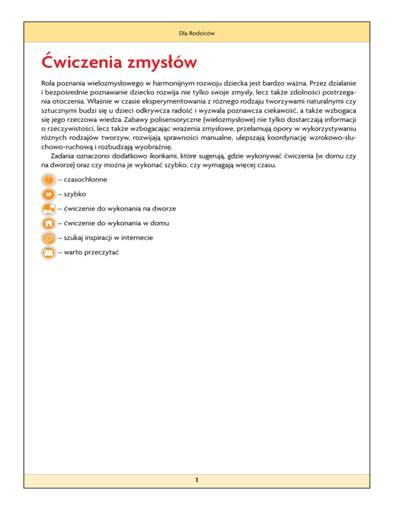 Dla Rodziców Ćwiczenia zmysłów Rola poznania wielozmysłowego w harmonijnym rozwoju dziecka jest bardzo ważna. Przez działanie i bezpośrednie poznawanie dziecko rozwija nie tylko swoje zmysły, lecz także zdolności postrzegania otoczenia. Właśnie w czasie eksperymentowania z różnego rodzaju tworzywami naturalnymi czy sztucznymi budzi się u dzieci odkrywcza radość i wyzwala poznawcza ciekawość, a także wzbogaca się jego rzeczowa wiedza. Zabawy polisensoryczne (wielozmysłowe) nie tylko dostarczają informacji o rzeczywistości, lecz także wzbogacając wrażenia zmysłowe, przełamują opory w wykorzystywaniu różnych rodzajów tworzyw, rozwijają sprawności manualne, ulepszają koordynację wzrokowo-słuchowo-ruchową i rozbudzają wyobraźnię. Zadania oznaczono dodatkowo ikonkami, które sugerują, gdzie wykonywać ćwiczenia (w domu czy na dworze) oraz czy można je wykonać szybko, czy wymagają więcej czasu. – czasochłonne – szybko – ćwiczenie do wykonania na dworze – ćwiczenie do wykonania w domu – szukaj inspiracji w internecie – warto przeczytać 1 Dla Rodziców • Ćwiczenia zmysłów Zmysł słuchu Ćwiczenie 1. Odgłosy ptaków Ćwiczenie to uczy koncentracji uwagi i rozpoznawania dźwięków wydawanych przez ptaki. Jak to wykonać? 1. Podczas jesiennego spaceru poproś, by dziecko wsłuchało się w odgłosy ptaków. 2.Zwróć uwagę na to, że każdy ptak może być rozpoznany po charakterystycznym dźwięku, jaki wydaje, np.: gołąb wydaje z siebie dwusylabowe gruchanie z akcentem na drugą sylabę gro-chu, sikora bogatka – śpiewa np. cicibej, cicibej, w szczebiocie czyżyka daje się wyraźnie słyszeć cz, zakończone pijut. Najczęściej zaś można usłyszeć wróbla i jego głos ćwir-ćwir. Obejrzyjcie film o jesieni z zasobów Scholarisa: Jesienne obserwacje Ćwiczenie 2. Wycieczka do parku Ćwiczenie ma pobudzić zmysły wzroku, dotyku, słuchu i węchu. Jak to wykonać? 1. Podczas pobytu w parku poleć dziecku, by bacznie rozejrzało się wokół i znalazło: • coś, co pachnie; • coś, co szeleści; • coś, co jest miękkie; • coś twardego. Ćwiczenie 3. Rytm bębenka Ćwiczenie polegające na zabawie w echo muzyczne. Jak to wykonać? 1. Trzymając bębenek, wystukuj rytm. Poproś dziecko, by powtarzało rytm, wyklaskując go rękami. Można użyć różnych instrumentów rytmicznych albo ćwiczyć, stukając ołówkiem w stół czy kijkiem w krzesło, w płot albo drzewo na spacerze w parku. 2.Wersja trudniejsza – osoba wystukująca rytm na bębenku odwraca się plecami, by rytm był tylko słyszany, a nie widziany przez dziecko. Dziecko koncentruje się wyłącznie na wsłuchiwaniu się w dźwięki. 2 Dla Rodziców • Ćwiczenia zmysłów Zmysł wzroku Ćwiczenie 1. Domy zwierząt Ćwiczenie pozwoli dziecku poznać domy poszczególnych zwierząt i zapamiętać globalnie ich zapis słowny. Jak to wykonać? 1. Wszystko się pomieszało. Niech dziecko dopasuje zwierzę do jego domu. niedźwiedździupla wiewiórkabuda lisgawra wróbelnora piesgniazdo Ćwiczenie 2. Zagadka Jak to wykonać? 1. Zadaj dziecku zagadkę. Niech nazwie po kolei przedmioty przedstawione na obrazku. 2. Wyodrębnijcie razem pierwsze litery nazw przedmiotów – one utworzą hasło. 3. Wpiszcie hasło pod obrazkiem. Rys. www.scholaris.pl 3 Dla Rodziców • Ćwiczenia zmysłów Zmysł równowagi Ćwiczenia: Czy dam radę? Jak to wykonać? 1. Zacznij z dzieckiem ćwiczenie równowagi od próby stania na jednej nodze tak długo, jak tylko się to uda, później zmiana – to samo ćwiczenie na drugiej nodze. 2.Poproś dziecko, by wykonało to samo ćwiczenie z zamkniętymi oczami. 3.Kolejne ćwiczenie to rzucanie (do drugiej osoby) i łapanie piłki w pozycji na jednej nodze. 4.Skoki na jednej nodze w przód i w tył (im dalej, tym trudniej). 5.Ćwiczcie skoki na jednej nodze w prawo i w lewo. 6.Zróbcie półobroty skokiem na jednej nodze. 7.Wykonajcie uderzenia pięścią przed siebie w staniu na jednej nodze. 8.Ćwiczcie jazdę na hulajnodze i rowerze. Zmysł smaku Ćwiczenie 1. Koktajl bananowy Wspólne sporządzenie pysznego koktajlu bananowego. Co przygotować? • 1 banan; • 1 szklanka soku pomarańczowego; • 1 łyżeczka miodu lub cukru trzcinowego. Jak to zrobić? 1. Rozgniecionego widelcem banana połączcie z sokiem pomarańczowym. 2.Dokładnie wymieszajcie koktajl, dodajcie 1 łyżeczkę miodu. 3.Poczujcie i przeanalizujcie smak tego napoju. Niech dziecko skupi się na wyczuciu smaku poszczególnych składników. Smacznego! Ćwiczenie 2. Przeciwieństwa smakowe Kształtowanie wrażliwości smakowej. Jak to wykonać? 1. Wybierz artykuły spożywcze o przeciwnych smakach, np. dżem–musztarda, ogórek kiszony–miód, sól–cukier i podaj dziecku do spróbowania. 2.Zachęć dziecko do opowiadania o tym, co czuje, smakując te produkty. Niech odpowie na pytanie, z czym kojarzą mu się te smaki. 4 Dla Rodziców • Ćwiczenia zmysłów Zmysł dotyku Ćwiczenie 1. Tajemniczy worek Jak to wykonać? 1. Do tego ćwiczenia wykorzystaj dowolny worek (lub torbę), w którym schowasz różne bezpieczne przedmioty. Mogą to być zabawki. 2.Niech dziecko włoży ręce do środka worka i „bada” rękami kolejne przedmioty, by rozpoznać trzymany przedmiot. Następnie niech odgadnie, co trzyma, a potem wyciągnie przedmiot z worka. Ćwiczenie 2. Zabawa ruchowo-dotykowa Pobawcie się razem do słów wierszyka. Jak to wykonać? 1. Dorosła osoba czyta wierszyk, dziecko pokazuje to, co słyszy. Dotknij ramion, Dotknij nosa, Dotknij łokci oraz włosów. Dotknij pięty, Dotknij ucha, Dotknij łydki oraz brzucha! Dotknij ściany i podłogi, A na koniec krzesła nogi! Autor nieznany Zmysł węchu Ćwiczenia: Co czujemy? 1. Przygotowując posiłki, zachęcaj dziecko do tego, by wąchało i opisywało unoszące się zapachy. 2.Pożytecznym ćwiczeniem jest wąchanie herbaty, kawy lub przypraw kuchennych, np. pieprzu, papryki, imbiru, kminku, ja