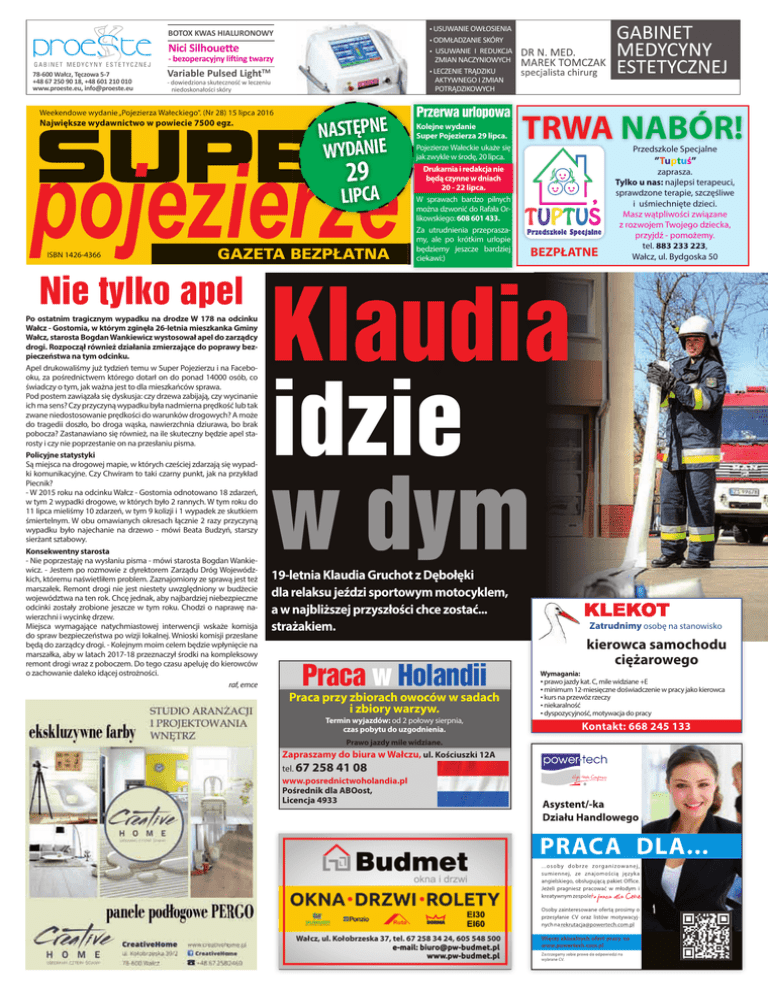 • USUWANIE OWŁOSIENIA • ODMŁADZANIE SKÓRY • USUWANIE I REDUKCJA ZMIAN NACZYNIOWYCH • LECZENIE TRĄDZIKU AKTYWNEGO I ZMIAN POTRĄDZIKOWYCH BOTOX KWAS HIALURONOWY Nici Silhouette AQUALYX - bezoperacyjny lifting twarzy LIPOLIZA FARMAKOLOGICZNA 78-600 Wałcz, Tęczowa 5-7 +48 67 250 90 18, +48 601 210 010 www.proeste.eu, [email protected] Variable Pulsed LightTM - dowiedziona skuteczność w leczeniu niedoskonałości skóry Weekendowe wydanie „Pojezierza Wałeckiego”. (Nr 28) 15 lipca 2016 SUPER Największe wydawnictwo w powiecie 7500 egz. NASTĘPNE WYDANIE 29 LIPCA ISBN 1426-4366 GAZETA BEZPŁATNA Nie tylko apel Po ostatnim tragicznym wypadku na drodze W 178 na odcinku Wałcz - Gostomia, w którym zginęła 26-letnia mieszkanka Gminy Wałcz, starosta Bogdan Wankiewicz wystosował apel do zarządcy drogi. Rozpoczął również działania zmierzające do poprawy bezpieczeństwa na tym odcinku. Apel drukowaliśmy już tydzień temu w Super Pojezierzu i na Facebooku, za pośrednictwem którego dotarł on do ponad 14000 osób, co świadczy o tym, jak ważna jest to dla mieszkańców sprawa. Pod postem zawiązała się dyskusja: czy drzewa zabijają, czy wycinanie ich ma sens? Czy przyczyną wypadku była nadmierna prędkość lub tak zwane niedostosowanie prędkości do warunków drogowych? A może do tragedii doszło, bo droga wąska, nawierzchnia dziurawa, bo brak pobocza? Zastanawiano się również, na ile skuteczny będzie apel starosty i czy nie poprzestanie on na przesłaniu pisma. Policyjne statystyki Są miejsca na drogowej mapie, w których cześciej zdarzają się wypadki komunikacyjne. Czy Chwiram to taki czarny punkt, jak na przykład Piecnik? - W 2015 roku na odcinku Wałcz - Gostomia odnotowano 18 zdarzeń, w tym 2 wypadki drogowe, w których było 2 rannych. W tym roku do 11 lipca mieliśmy 10 zdarzeń, w tym 9 kolizji i 1 wypadek ze skutkiem śmiertelnym. W obu omawianych okresach łącznie 2 razy przyczyną wypadku było najechanie na drzewo - mówi Beata Budzyń, starszy sierżant sztabowy. Konsekwentny starosta - Nie poprzestaję na wysłaniu pisma - mówi starosta Bogdan Wankiewicz. - Jestem po rozmowie z dyrektorem Zarządu Dróg Wojewódzkich, któremu naświetliłem problem. Zaznajomiony ze sprawą jest też marszałek. Remont drogi nie jest niestety uwzględniony w budżecie województwa na ten rok. Chcę jednak, aby najbardziej niebezpieczne odcinki zostały zrobione jeszcze w tym roku. Chodzi o naprawę nawierzchni i wycinkę drzew. Miejsca wymagające natychmiastowej interwencji wskaże komisja do spraw bezpieczeństwa po wizji lokalnej. Wnioski komisji przesłane będą do zarządcy drogi. - Kolejnym moim celem będzie wpłynięcie na marszałka, aby w latach 2017-18 przeznaczył środki na kompleksowy remont drogi wraz z poboczem. Do tego czasu apeluję do kierowców o zachowanie daleko idącej ostrożności. raf, emce Przerwa urlopowa Kolejne wydanie Super Pojezierza 29 lipca. Pojezierze Wałeckie ukaże się jak zwykle w środę, 20 lipca. Drukarnia i redakcja nie będą czynne w dniach 20 - 22 lipca. W sprawach bardzo pilnych można dzwonić do Rafała Orlikowskiego: 608 601 433. Za utrudnienia przepraszamy, ale po krótkim urlopie będziemy jeszcze bardziej ciekawi:) TRWA NABÓR! Przedszkole Specjalne ”Tuptuś” BEZPŁATNE zaprasza. Tylko u nas: najlepsi terapeuci, sprawdzone terapie, szczęśliwe i uśmiechnięte dzieci. Masz wątpliwości związane z rozwojem Twojego dziecka, przyjdź - pomożemy. tel. 883 233 223, Wałcz, ul. Bydgoska 50 Klaudia idzie w dym 19-letnia Klaudia Gruchot z Dębołęki dla relaksu jeździ sportowym motocyklem, a w najbliższej przyszłości chce zostać... strażakiem. Praca w Holandii Praca przy zbiorach owoców w sadach i zbiory warzyw. Termin wyjazdów: od 2 połowy sierpnia, czas pobytu do uzgodnienia. Zatrudnimy osobę na stanowisko kierowca samochodu ciężarowego Wymagania: • prawo jazdy kat. C, mile widziane +E • minimum 12-miesięczne doświadczenie w pracy jako kierowca • kurs na przewóz rzeczy • niekaralność • dyspozycyjność, motywacja do pracy Kontakt: 668 245 133 Prawo jazdy mile widziane. Zapraszamy do biura w Wałczu, ul. Kościuszki 12A tel. 67 258 41 08 www.posrednictwoholandia.pl Pośrednik dla ABOost, Licencja 4933 High-tech Company Sudoku 357 (Medium) Horoskop Baran: Twoim głównym celem będzie teraz zabawa SUDOKU 7 Sudoku 357 (Medium) Sudoku 358 (Hard) 4 Sudoku 358 (Hard) 2 Krzyżówka 9 2 3 i życie towarzyskie. Stresujący okres powoli dobiega 1 6 2 73 1 6 5 4 sobie 7 na odrobinę braku 2 roz9 2 końca, dlatego pozwól sądku. Nawet jeśli brzmi to strasznie – nie pożałujesz! 1 1 86 4 7 6 1 2 1 6 7 5 5 Byk: Przedurlopowa gorączka sprawi, że łatwo bę8 4 6 9 3 dzie wytrącić 1 Cię z równowagi. 8Jeśli nie chcesz 5spę7 6 7 1 dzić wakacji skonfliktowany z całym światem, posta6 67 1 9 3 7 2 1 9 raj się 8 znaleźć sposób na rozładowanie negatywnej 7 38 9 2 energii. 9 8 4 6 7Mniej1przejmuj się innymi, a8bardziej 9 intere2 3 5 7 2 1 96 Bliźnięta: suj się sobą, jeśli chcesz zaznać choć trochę odpoczyn1 6 8 5 3 5 że sam nie zmienisz świata! Pod koniec 6 9 9 8 48 ku. Pamiętaj, tygodnia czeka Cię prawdziwy zastrzyk finansowy. 2 8 5 1 9 8 63 8 54 1 35 Rak: To, co teraz zadzieje się w Twoim życiu uczu1 7 2 ciowym, nie 3 może okazać się bardzo 4 1 trwałe, dlatego 5 26 8 8 2 5 lekceważ intencji i uczuć ważnych dla Ciebie osób. W Sudoku (Medium) Sudoku 358 (Hard) 6357sobie 8 2słodkiego lenistwa. 1 7 2 pracy pozwól na odrobinę Lew: Odsuń na bok upór i pierwszy wyciągnij rękę, Sudoku 359 (Medium) Sudoku 360 (Hard) by zażegnać stary konflikt. 4 7 Chociaż może2ucierpieć 9 2 3 na tym Twoja duma, to na dłuższą metę jest to ideal2359 (Medium) 6 7 6 5 neSudoku rozwiązanie. Twoja1dojrzałość zrobi teraz wrażenie Sudoku 360 (Hard) 3 11 2 1 8 4 7 5 na ważnej dla Ciebie osobie. 1 8 5 Panna: 724 1 58 27 34 76 651 4 5 3 W Twoim 1 życiu już