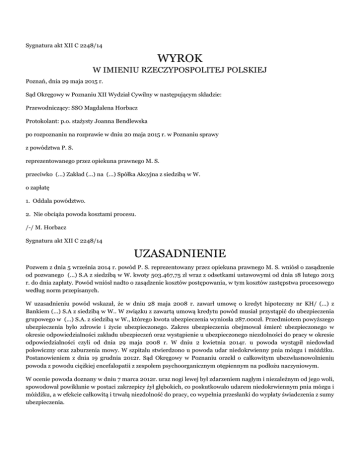 Sygnatura akt XII C 2248/14 WYROK W IMIENIU RZECZYPOSPOLITEJ POLSKIEJ Poznań, dnia 29 maja 2015 r. Sąd Okręgowy w Poznaniu XII Wydział Cywilny w następującym składzie: Przewodniczący: SSO Magdalena Horbacz Protokolant: p.o. stażysty Joanna Bendlewska po rozpoznaniu na rozprawie w dniu 20 maja 2015 r. w Poznaniu sprawy z powództwa P. S. reprezentowanego przez opiekuna prawnego M. S. przeciwko (...) Zakład (...) na (...) Spółka Akcyjna z siedzibą w W. o zapłatę 1. Oddala powództwo. 2. Nie obciąża powoda kosztami procesu. /-/ M. Horbacz Sygnatura akt XII C 2248/14 UZASADNIENIE Pozwem z dnia 5 września 2014 r. powód P. S. reprezentowany przez opiekuna prawnego M. S. wniósł o zasądzenie od pozwanego (...) S.A z siedzibą w W. kwoty 503.467,75 zł wraz z odsetkami ustawowymi od dnia 18 lutego 2013 r. do dnia zapłaty. Powód wniósł nadto o zasądzenie kosztów postępowania, w tym kosztów zastępstwa procesowego według norm przepisanych. W uzasadnieniu powód wskazał, że w dniu 28 maja 2008 r. zawarł umowę o kredyt hipoteczny nr KH/ (...) z Bankiem (...) S.A z siedzibą w W.. W związku z zawartą umową kredytu powód musiał przystąpić do ubezpieczenia grupowego w (...) S.A. z siedzibą w W., którego kwota ubezpieczenia wyniosła 287.000zł. Przedmiotem powyższego ubezpieczenia było zdrowie i życie ubezpieczonego. Zakres ubezpieczenia obejmował śmierć ubezpieczonego w okresie odpowiedzialności zakładu ubezpieczeń oraz wystąpienie u ubezpieczonego niezdolności do pracy w okresie odpowiedzialności czyli od dnia 29 maja 2008 r. W dniu 2 kwietnia 2014r. u powoda wystąpił niedowład połowiczny oraz zaburzenia mowy. W szpitalu stwierdzono u powoda udar niedokrwienny pnia mózgu i móżdżku. Postanowieniem z dnia 19 grudnia 2012r. Sąd Okręgowy w Poznaniu orzekł o całkowitym ubezwłasnowolnieniu powoda z powodu ciężkiej encefalopatii z zespołem psychoorganicznym otępiennym na podłożu naczyniowym. W ocenie powoda doznany w dniu 7 marca 2012r. uraz nogi lewej był zdarzeniem nagłym i niezależnym od jego woli, spowodował powikłanie w postaci zakrzepicy żył głębokich, co poskutkowało udarem niedokrwiennym pnia mózgu i móżdżku, a w efekcie całkowitą i trwałą niezdolność do pracy, co wypełnia przesłanki do wypłaty świadczenia z sumy ubezpieczenia. W odpowiedzi na pozew z dnia 22 października 2014r. pozwany (...) Zakład (...) na (...) S.A. z siedzibą w W. wniósł o oddalenie powództwa oraz zasądzenie zwrotu kosztów procesu wraz z kosztami zastępstwa procesowego według norm przepisanych. W uzasadnieniu pozwany zarzucił brak legitymacji czynnej powoda, a także brak umocowania pełnomocnika do reprezentowania powoda w sporze sądowym przeciwko pozwanemu, podnosząc że składając oświadczenie o korzystaniu z ochrony ubezpieczeniowej nazwanego Deklaracją przystąpienia powód złożył oświadczenie, że dokonuje cesji praw do świadczenia z tytułu niezdolności do pracy na ubezpieczającego czyli na bank Milenium. Nadto pozwany zakwestionował, by stan opisany w pozwie: niezdolność do wykonywania pracy i samodzielnej egzystencji, zaistniały u powoda 2 kwietnia 2012r., był wynikiem nieszczęśliwego wypadku w rozumieniu OWU to jest gwałtownego zdarzenia wywołanego przyczyną zewnętrzną. Sąd Okręgowy ustalił następujący stan faktyczny: Powód w dniu 29 maja 2008 r. zawarł umowę o kredyt hipoteczny nr KH/ (...) z Bankiem (...) S.A z siedzibą w W.. Powód w dniu 29 maja 2008 r. przystąpił do grupowego ubezpieczenia na życie kredytobiorców w (...) Zakładzie (...) na (...) S.A. z siedzibą w W., początkowa wysokość sumy ubezpieczenia wynosiła 287.000,00 zł. Przedmiotem ubezpieczenia było życie i zdrowie ubezpieczonego. Zakres ubezpieczenia obejmował śmierć ubezpieczonego w okresie odpowiedzialności oraz wystąpienie u ubezpieczonego niezdolności do pracy od dnia 29 maja 2008r. Okoliczność bezsporna, nadto: umowa o kredyt hipoteczny nr KH/ (...) (k.15-20), deklaracja przystąpienia do grupowego ubezpieczenia na życie kredytobiorców (k. 21) Powód w dniu 7 marca z2012r. podczas biegu poczuł nagły ból w łydce lewej. Tego samego dnia zgłosił się do (...) Sp. z o.o. w P. celem wykonania konsultacji chirurgicznej. Wynik badania wskazał na obrzęk łydki, bolesność przy palpacji w 1/3 bliższej lewej łydki. Ruchomość stopy w stawie kolanowym zachowana, bez objawów uszkodzenia ścięgna A.. Założono podłużnik gipsowy unieruchamiający podudzie z powodu dużych dolegliwości bólowych. Pacjent wcześniej przez kilka dni odczuwał lekki ból lewej łydki. Okoliczność bezsporna, nadto: opis konsultacji chirurgicznej wykonanej w Prywatnej Lecznicy (...)z dnia 7 marca 2012 r. (k. 28). Powód w dniu 10 marca 2012 r. udał się na konsultację ortopedyczną do (...) S.A (...) w P.. W wyniku przeprowadzonego badania oraz wywiadu lekarskiego stwierdzono u powoda uraz mięśnia i ścięgna na poziomie podudzia lewej nogi. Okoliczność bezsporna, nadto: historia zdrowia i choroby pacjenta P. S. z (...) S.A (...) . (k. 29). Powód w dniu 21 marca 2012 r. został poddany badaniu ultrasonograficznemu lewej kończyny dolnej w R. C.. Badanie przeprowadził doktor M. D. w wyniku, którego stwierdzono całkowite uszkodzenie mięśnia brzuchatego łydki oraz zakrzepicę żylnych naczyń zatokowych mięśnia trójgłowego łydki w części centralnej mięśnia płaszczkowatego oraz niezależenie w bliższym odcinku głowy przyśrodkowej mięśnia brzuchatego, tuż przy ujściu do żyły podkolanowej. Okoliczność bezsporna, nadto: karta informacyjna badania ultrasonograficznego narządu ruchu pacjenta P. S. z dnia 21 marca 2012 r. wykonanego w R. C. (k. 30). Powód w dniu 2 kwietnia 2014 r. o godzinie 6.00 rano doznał niedowładu połowicznego oraz zaburzeń mowy. Powód został niezwłocznie przyjęty na Oddział (...) z siedzibą w P. przy ul. (...). W wyniku przeprowadzonych badań u