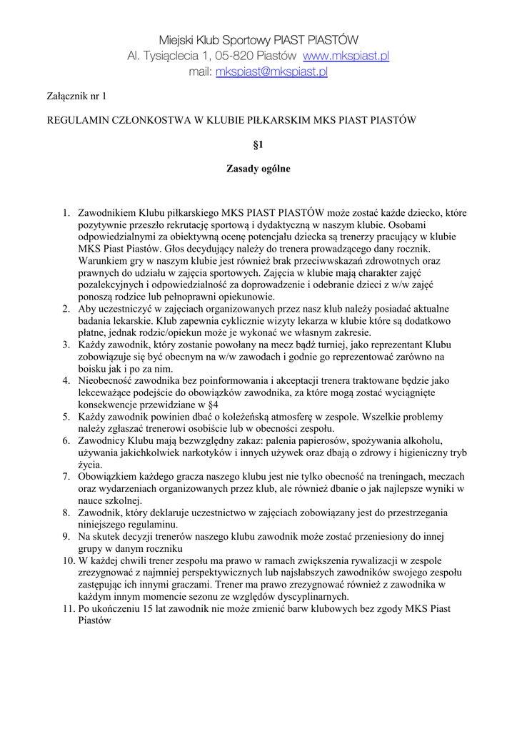Miejski Klub Sportowy PIAST PIASTÓW Al. Tysiąclecia 1, 05-820 Piastów www.mkspiast.pl mail: [email protected] Załącznik nr 1 REGULAMIN CZŁONKOSTWA W KLUBIE PIŁKARSKIM MKS PIAST PIASTÓW §1 Zasady ogólne 1. Zawodnikiem Klubu piłkarskiego MKS PIAST PIASTÓW może zostać każde dziecko, które pozytywnie przeszło rekrutację sportową i dydaktyczną w naszym klubie. Osobami odpowiedzialnymi za obiektywną ocenę potencjału dziecka są trenerzy pracujący w klubie MKS Piast Piastów. Głos decydujący należy do trenera prowadzącego dany rocznik. Warunkiem gry w naszym klubie jest również brak przeciwwskazań zdrowotnych oraz prawnych do udziału w zajęcia sportowych. Zajęcia w klubie mają charakter zajęć pozalekcyjnych i odpowiedzialność za doprowadzenie i odebranie dzieci z w/w zajęć ponoszą rodzice lub pełnoprawni opiekunowie. 2. Aby uczestniczyć w zajęciach organizowanych przez nasz klub należy posiadać aktualne badania lekarskie. Klub zapewnia cyklicznie wizyty lekarza w klubie które są dodatkowo płatne, jednak rodzic/opiekun może je wykonać we własnym zakresie. 3. Każdy zawodnik, który zostanie powołany na mecz bądź turniej, jako reprezentant Klubu zobowiązuje się być obecnym na w/w zawodach i godnie go reprezentować zarówno na boisku jak i po za nim. 4. Nieobecność zawodnika bez poinformowania i akceptacji trenera traktowane będzie jako lekceważące podejście do obowiązków zawodnika, za które mogą zostać wyciągnięte konsekwencje przewidziane w §4 5. Każdy zawodnik powinien dbać o koleżeńską atmosferę w zespole. Wszelkie problemy należy zgłaszać trenerowi osobiście lub w obecności zespołu. 6. Zawodnicy Klubu mają bezwzględny zakaz: palenia papierosów, spożywania alkoholu, używania jakichkolwiek narkotyków i innych używek oraz dbają o zdrowy i higieniczny tryb życia. 7. Obowiązkiem każdego gracza naszego klubu jest nie tylko obecność na treningach, meczach oraz wydarzeniach organizowanych przez klub, ale również dbanie o jak najlepsze wyniki w nauce szkolnej. 8. Zawodnik, który deklaruje uczestnictwo w zajęciach zobowiązany jest do przestrzegania niniejszego regulaminu. 9. Na skutek decyzji trenerów naszego klubu zawodnik może zostać przeniesiony do innej grupy w danym roczniku 10. W każdej chwili trener zespołu ma prawo w ramach zwiększenia rywalizacji w zespole zrezygnować z najmniej perspektywicznych lub najsłabszych zawodników swojego zespołu zastępując ich innymi graczami. Trener ma prawo zrezygnować również z zawodnika w każdym innym momencie sezonu ze względów dyscyplinarnych. 11. Po ukończeniu 15 lat zawodnik nie może zmienić barw klubowych bez zgody MKS Piast Piastów §2 Prawa i obowiązki zawodnika MKS Piast Piastów 1. W zajęciach treningowych mogą brać udział tylko zawodnicy posiadający aktualne badania lekarskie oraz zgodę rodziców/opiekunów. 2. Zawodnik MKS Piast Piastów zobowiązuje się: a) godnie reprezentować barwy klubowe zarówno w trakcie treningu, meczu jak i w życiu codziennym, b) szanować kolegów z zespołu, pracowników klubu, rywali i sędziów, c) dbać o jak najlepsze oceny w szkole, d) Po zajęciach sportowych nie zostawiać żadnych śmieci po sobie (puste butelki, reklamówki, itp.) e) trenować w jednolitym stroju treningowym, którego obowiązkowym elementem są: Niebieska Koszulka treningowa z herbem klubu (do nabycia w cenie 20 zł/szt),spodenki lub spodnie, ochraniacze na kości goleni buty piłkarskie odpowiednie do nawierzchni (korki, turfy, halówki)oraz bidon z wodą/napojem izotonicznym. f) przed, w trakcie, jak i po treningu pomagać trenerowi podczas rozstawiania i składania sprzętu sportowego, g) wykonywać polecenia trenera prowadzącego zajęcia oraz innych pracowników klubu h) być sumiennym i zdyscyplinowanym (nie spóźniać się na zajęcia), i) w razie nieobecności na zajęciach zespołu powiadomić trener o nieobecności (sms, telefonicznie) j) w razie kontuzji uczestniczyć w zajęciach treningowych i wykonywać program indywidualny przekazany przez trenera (wyjątek stanowią zawodnicy chorzy lub przechodzący rehabilitację w tym samym czasie), k) w trakcie treningu skupiać się na wykonywanych ćwiczeniach, l) wszelkie dolegliwości zdrowotne bezzwłocznie zgłaszać trenerowi, m) w czasie wolnym doskonalić elementy piłkarskie poznane na treningu, n) dbać o sprzęt treningowy – ubrania, piłki, pachołki itp. o) poinformować trenera o ewentualnych zajęciach dodatkowych, które mają wpływ na uczestnictwo w treningach/turniejach/meczach p) uzyskać zgodę naszego klubu na ewentualne testy w innych klubach lub udział w turniejach, meczach gdzie zawodnik ma występować w barwach innych niż MKS Piast 3. Zawodnik, który z nieusprawiedliwionych przyczyn nie pojawia się na treningu lub w szkole, nie może być brany pod uwagę przy ustalaniu kadry meczowej na najbliższe spotkanie ligowe lub turnieje, mecze towarzyskie, 4. Zakupiony przez Klub sprzęt zostaje wypożyczony zawodnikowi na okres, w którym trenuje w naszym klubie. 5. Każdy zawodnik zobowiązuje się dbać o powierzony mu sprzęt sportowy, a w przypadku jego celowego zniszczenia lub utraty zobowiązuje się zwrócić koszty zniszczonego lub utraconego sprzętu. 6. W przypadku zniszczenia mienia naszego klubu lub wyrządzenia szkód podczas turniejów, obozów wszelkie koszty ponosi winowajca. §3 Prawa i obowiązki rodziców/opiekunów zawodnika MKS Piast Piastów 1. Każdy rodzic/opiekun zobligowany jest do zapoznania się z regulaminem MKS Piast Piastów 2. Zgłoszenie dziecka oznacza akceptację warunków zawartych w niniejszym regulaminie i stosowania się do jego ustaleń. 3. W trakcie zajęć treningowych i zawodów rodzice/opiekunowie zobowiązują się nie kontaktować z dziećmi, ponieważ wpływa to na ich koncentrację. 4. Podczas meczów i treningów rodzice/opiekunowie, kibice (osoby postronne) powinni przebywać na trybu