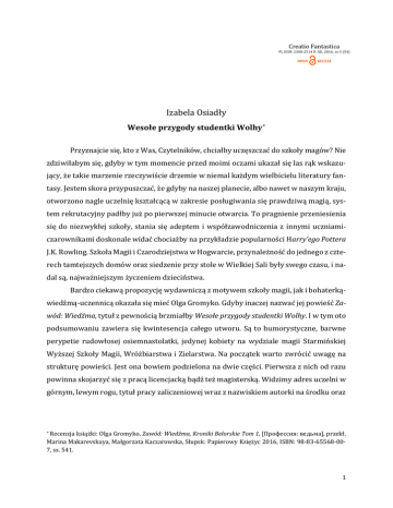 Creatio Fantastica PL ISSN: 2300-2514 R. XII, 2016, nr 3 (54) Izabela Osiadły Wesołe przygody studentki Wolhy ∗ Przyznajcie się, kto z Was, Czytelników, chciałby uczęszczać do szkoły magów? Nie zdziwiłabym się, gdyby w tym momencie przed moimi oczami ukazał się las rąk wskazu- jący, że takie marzenie rzeczywiście drzemie w niemal każdym wielbicielu literatury fantasy. Jestem skora przypuszczać, że gdyby na naszej planecie, albo nawet w naszym kraju, otworzono nagle uczelnię kształcącą w zakresie posługiwania się prawdziwą magią, sys- tem rekrutacyjny padłby już po pierwszej minucie otwarcia. To pragnienie przeniesienia się do niezwykłej szkoły, stania się adeptem i współzawodniczenia z innymi uczniamiczarownikami doskonale widać chociażby na przykładzie popularności Harry’ego Pottera J.K. Rowling. Szkoła Magii i Czarodziejstwa w Hogwarcie, przynależność do jednego z czte- rech tamtejszych domów oraz siedzenie przy stole w Wielkiej Sali były swego czasu, i nadal są, najważniejszym życzeniem dzieciństwa. Bardzo ciekawą propozycję wydawniczą z motywem szkoły magii, jak i bohaterką- wiedźmą-uczennicą okazała się mieć Olga Gromyko. Gdyby inaczej nazwać jej powieść Zawód: Wiedźma, tytuł z pewnością brzmiałby Wesołe przygody studentki Wolhy. I w tym oto podsumowaniu zawiera się kwintesencja całego utworu. Są to humorystyczne, barwne perypetie rudowłosej osiemnastolatki, jedynej kobiety na wydziale magii Starmińskiej Wyższej Szkoły Magii, Wróżbiarstwa i Zielarstwa. Na początek warto zwrócić uwagę na strukturę powieści. Jest ona bowiem podzielona na dwie części. Pierwsza z nich od razu powinna skojarzyć się z pracą licencjacką bądź też magisterską. Widzimy adres uczelni w górnym, lewym rogu, tytuł pracy zaliczeniowej wraz z nazwiskiem autorki na środku oraz Recenzja książki: Olga Gromyko, Zawód: Wiedźma, Kroniki Belorskie Tom 1, [Профессия: ведьма], przekł. Marina Makarevskaya, Małgorzata Kaczarowska, Słupsk: Papierowy Księżyc 2016, ISBN: 98-83-65568-007, ss. 541. ∗ 1 nazwisko promotora, rok i miejsce w dolnym, prawym rogu. Układ socjalny, życie codzienne i stosunki w wampirzej społeczności – o tym będzie opowiadać kolejne dwieście pięćdziesiąt stron, zanim nie przejdziemy do wykładów, na podstawie praktyki naukowoterenowej, czyli zabawnych doświadczeń, przeżyć i scenek sytuacyjnych z udziałem na- szej bohaterki m.in. na uczelni, w gospodzie, turnieju i tym podobnych punktach odbywania zajęć-przygód. Jak już wspomniałam, trzon powieści stanowi społeczność wampirów, zamieszku- jąca jedyny bezpieczny dla niej kraj – Dogewę. Jeśli macie już przeczucie, jakoby ludzkie wcielenia nietoperzy były ofiarami nienawiści i uprzedzeń, tak, właśnie tak się dzieje. Powieść ma drugie dno, z którego wypływa do nas na powierzchnię nauka o nietolerancji, a przede wszystkim szkodliwości stereotypów. To temat zawsze aktualny i przypuszczam, że dojrzalszy Czytelnik w mig rozpozna ukryte aluzje do zachowania ludzi ze świata real- nego. Niegdyś szalenie popularny motyw wampirów powraca tutaj, aby pokazać jak niewiele o tej rasie wiemy i że jest to mniemanie często błędne, u którego podstawy leży wizja Draculi wysysającego krew dziewicy, po czym uciekającego, gdzie pieprz rośnie przed rzuconym w niego czosnkiem. Odniosłam wrażenie, że w tej nauce (skoro taki jest koncept powieści, jej kompo- zycja itp.) tkwi cały sekret i zamysł dzieła. Bo, prawdę mówiąc, pomysł na akcję, może nie mocno, ale kuleje. W pierwszej części otrzymujemy zagadkę do rozwiązania. Coś tajemniczego morduje mieszkańców Dogewy i Wolha ma za zadanie rozwiązać problem, powstrzymując zabójcę, zanim wampiry zostaną niesłusznie oskarżone o działania, które tak naprawdę zrodziły się tylko w ludzkiej wyobraźni przez strach i uprzedzenie. Zamiast genialnej, trzymającej w napięciu intrygi otrzymujemy czas, podczas którego Wolha bada społeczeństwo wampirów i poznaje jej młodego (jak na wampira) władcę – Lena. Król Len jest postacią sympatyczną i dalece odbiega od obrazka stereotypowego pana. Z jednej strony jest roztrzepany, niezdarny, szalony, czuje się wolny i beztroski, z drugiej jest nieufny, poważny, przenikliwy i wiedzący więcej, niż mogłoby się zdawać. Spotkanie tej dwójki, ich relacje szybko trafiają na plan pierwszy powieści. Nie byłoby w tym nic dziw- nego, bo przecież, jak już pewnie zdążyliście zgadnąć, będzie z tego romans. Otóż nie. Nie ma go. Jest przyjaźń. I coś w rodzaju zalążka miłości, który zapewne rozkwitnie w dalszych częściach naszej Wiedźmy. W końcu to pierwszy tom Kronik Belorskich. 2 Druga część dzieła, czyli wykłady, stawia już na pierwszym planie dyna- miczną przygodę. Po kilku zabawnych wybrykach Wolhy przechodzimy do zawiązania akcji, która, fakt faktem, opiera się na znanym (i zapewne lubianym) schemacie „musimy coś zdobyć za wszelką cenę, żeby coś uratować/powstrzymać”. Wolha, Len i nowy kompan – grubiańsko delikatny troll, oferują Wam mnóstwo humorystycznych sytuacji, przekomarzań i zaskakujących momentów. Jest to przygoda w dobrym wydaniu i, mówiąc kolokwialnie, nie ma bata, żeby takiej oferty nie pochwycić. Poza tym książkę czyta się bardzo przyjemnie; jest treściwa, został utrzymany balans pomiędzy opisami i dialogami, przy czym te drugie są dość „młodzieżowe”, studencki język kipi z nich aż miło. I pewnie z tego, jak z wielu innych wymienionych powyżej powodów, Zawód: Wiedźma jest tak bliski osobom sytuującym się gdzieś pomiędzy maturą a pracą i życiem dorosłego. Równie szczerze powieść Olgi Gromyko polecam tym, którzy marzą już o sa- modzielności i studiowaniu,, a także i tym, którzy za czasami studenckimi tęsknią, a już w szczególności chcieliby je widzieć w wydaniu magicznym