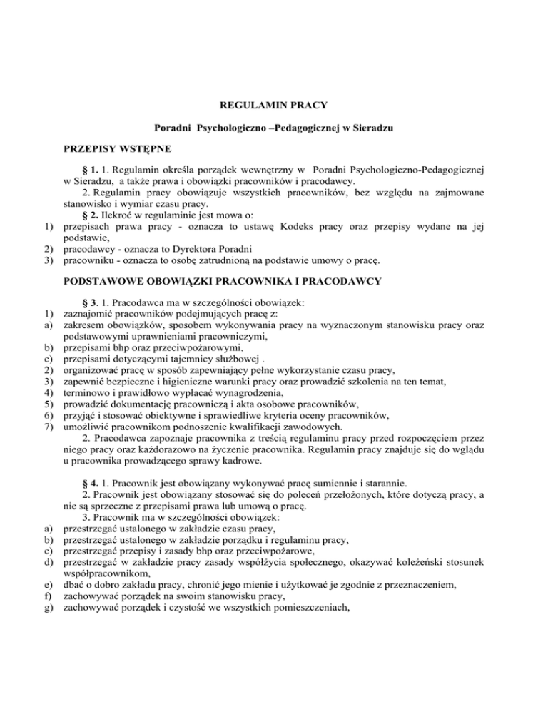REGULAMIN PRACY Poradni Psychologiczno –Pedagogicznej w Sieradzu PRZEPISY WSTĘPNE § 1. 1. Regulamin określa porządek wewnętrzny w Poradni Psychologiczno-Pedagogicznej w Sieradzu, a także prawa i obowiązki pracowników i pracodawcy. 2. Regulamin pracy obowiązuje wszystkich pracowników, bez względu na zajmowane stanowisko i wymiar czasu pracy. § 2. Ilekroć w regulaminie jest mowa o: 1) przepisach prawa pracy - oznacza to ustawę Kodeks pracy oraz przepisy wydane na jej podstawie, 2) pracodawcy - oznacza to Dyrektora Poradni 3) pracowniku - oznacza to osobę zatrudnioną na podstawie umowy o pracę. PODSTAWOWE OBOWIĄZKI PRACOWNIKA I PRACODAWCY 1) a) b) c) 2) 3) 4) 5) 6) 7) a) b) c) d) e) f) g) § 3. 1. Pracodawca ma w szczególności obowiązek: zaznajomić pracowników podejmujących pracę z: zakresem obowiązków, sposobem wykonywania pracy na wyznaczonym stanowisku pracy oraz podstawowymi uprawnieniami pracowniczymi, przepisami bhp oraz przeciwpożarowymi, przepisami dotyczącymi tajemnicy służbowej . organizować pracę w sposób zapewniający pełne wykorzystanie czasu pracy, zapewnić bezpieczne i higieniczne warunki pracy oraz prowadzić szkolenia na ten temat, terminowo i prawidłowo wypłacać wynagrodzenia, prowadzić dokumentację pracowniczą i akta osobowe pracowników, przyjąć i stosować obiektywne i sprawiedliwe kryteria oceny pracowników, umożliwić pracownikom podnoszenie kwalifikacji zawodowych. 2. Pracodawca zapoznaje pracownika z treścią regulaminu pracy przed rozpoczęciem przez niego pracy oraz każdorazowo na życzenie pracownika. Regulamin pracy znajduje się do wglądu u pracownika prowadzącego sprawy kadrowe. § 4. 1. Pracownik jest obowiązany wykonywać pracę sumiennie i starannie. 2. Pracownik jest obowiązany stosować się do poleceń przełożonych, które dotyczą pracy, a nie są sprzeczne z przepisami prawa lub umową o pracę. 3. Pracownik ma w szczególności obowiązek: przestrzegać ustalonego w zakładzie czasu pracy, przestrzegać ustalonego w zakładzie porządku i regulaminu pracy, przestrzegać przepisy i zasady bhp oraz przeciwpożarowe, przestrzegać w zakładzie pracy zasady współżycia społecznego, okazywać koleżeński stosunek współpracownikom, dbać o dobro zakładu pracy, chronić jego mienie i użytkować je zgodnie z przeznaczeniem, zachowywać porządek na swoim stanowisku pracy, zachowywać porządek i czystość we wszystkich pomieszczeniach, h) zachowywać w tajemnicy informacje, których ujawnienie mogłoby narazić pracodawcę na szkodę, a w szczególności: przechowywać dokumenty (narzędzia i materiały) w miejscu do tego przeznaczonym, po zakończeniu pracy odpowiednio zabezpieczyć dokumenty, narzędzia i materiały. CZAS PRACY § 5. 1. Czasem pracy jest czas, w którym pracownik pozostaje do dyspozycji pracodawcy w siedzibie zakładu lub w innym miejscu wyznaczonym przez pracodawcę. 2. Czas pracy wynosi 40 godzin tygodniowo dla pracowników administracyjnych i obsługi, a 20 godz. tygodniowo dla pracowników pedagogicznych. 3. W zakładzie obowiązują następujące godziny rozpoczynania i kończenia pracy: od poniedziałku do piątku od godziny. 8,00 do godziny 18,00. Dyrektor placówki uszczegółowi tygodniowy harmonogram pracy poszczególnych pracowników. 4. Do czasu pracy wlicza się 15-minutową przerwę na spożycie posiłku. 5. Czas pracy osób zatrudnionych w niepełnym wymiarze godzin ustala indywidualnie dla każdego pracownika Dyrektor Poradni. § 6. 1. Pracownikowi, który na polecenie pracodawcy wykonywał pracę w dniu wolnym od pracy, przysługuje w zamian dzień wolny od pracy w innym terminie - w ciągu miesiąca. 2. Pracą w godzinach nadliczbowych, ponadwymiarowych jest praca ponad obowiązujące w zakładzie dobowe i tygodniowe normy czasu, czyli ponad 8 lub 5 godz. na dobę oraz ponad 40 lub 20 godz. w tygodniu. Praca w godzinach nadliczbowych jest dopuszczalna tylko w przypadku: a) konieczności prowadzenia akcji ratunkowej dla ochrony życia lub zdrowia ludzkiego, dla ochrony mienia lub usunięcia awarii, b) szczególnych potrzeb pracodawcy. Godziny nadliczbowe nie mogą przekraczać 4 godzin na dobę i 150 godzin w roku kalendarzowym. 3. Za pracę w godzinach nadliczbowych przysługuje dodatkowe wynagrodzenie w wysokości: 50% wynagrodzenia - za pracę w dwóch pierwszych godzinach nadliczbowych i 100% wynagrodzenia - za pracę w dalszych godzinach nadliczbowych oraz w godzinach nadliczbowych przypadających w nocy, niedziele i święta. 4. Pracownicy zarządzający zakładem pracy w imieniu pracodawcy, główny księgowy, kierownicy wyodrębnionych komórek organizacyjnych zakładu - oraz zastępcy tych osób - w razie konieczności wykonują pracę poza normalnymi godzinami pracy, bez prawa do dodatkowego wynagrodzenia. OBECNOŚĆ W PRACY, USPRAWIEDLIWIANIE NIEOBECNOŚCI I SPÓŹNIEŃ § 7. Pracownik potwierdza przybycie do zakładu na liście obecności, znajdującej się w sekretariacie. § 8. Opuszczenie pracy lub spóźnienie do pracy usprawiedliwiają ważne przyczyny, a w szczególności: a) niezdolność do pracy z powodu choroby pracownika, b) odsunięcie od pracy na podstawie decyzji lekarza lub inspektora sanitarnego, jeżeli nie można zatrudnić pracownika przy innej pracy, odpowiedniej do jego stanu zdrowia, c) choroba członka rodziny pracownika, wymagająca osobistej opieki pracownika nad chorym, d) konieczność sprawowania osobistej opieki nad zdrowym dzieckiem w wieku do 8 lat, e) konieczność wypoczynku po nocnej podróży służbowej - w granicach 8 godzin od zakończenia podróży - jeżeli pracownik podróżował w warunkach uniemożliwiających nocny wypoczynek. § 9. 1. Jeżeli pracownik nie może stawić się do pracy z przyczyny z góry wiadomej, ma obowiązek uprzedzić o tym pracodawcę, przynajmniej dzień wcześniej. 2. W razie nieobecności w pracy w innych okolicznościach niż określone w ust. 1, pracownik ma obowiązek zawiadomi