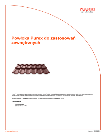 more with metals Powłoka Purex do zastosowań zewnętrznych Purex™ to nowoczesna powłoka opracowana przez firmę Ruukki, zapewniająca elegancką i trwałą powłokę kolorową blach budowlanych. Strukturalne, matowe wykończenie stanowi stylową alternatywę dla pokryć dachowych i ochronnych obróbek blacharskich. Arkusze stalowe z powłokami organicznymi są produkowane zgodnie z normą EN 10169. Zastosowanie: l l Płyty dachowe Obróbki blacharskie www.ruukki.com Version 19.06.2012 Powłoka Purex do zastosowań zewnętrznych more with metals Właściwości Właściwości techniczne powłoki Purex oferują doskonałą możliwość produkowania trwałych produktów budowlanych. Grubość i skład powłoki zostały tak zoptymalizowane, aby zapewniała ona doskonałą formowalność i odporność na korozję. Powłoka ta ma również dobrą odporność na zarysowania oraz doskonałą trwałość koloru i wyglądu. Version 19.06.2012 Purex Nominalna grubość powłoki µm: 26 Powłoka wierzchnia µm: 20 Warstwa podkładowa µm: 6 Wzór powłoki: Lekko wytłaczana Połysk, Gardner 60º: 7 Najwyższa temperatura użytkowania °C: 100 Najniższa temperatura użytkowania °C: 60 Najniższa temperatura formowania °C: 15 Min. dopuszczalny promień gięcia: 1 x grubość arkusza Współczynnik UV: RUV 3 Klasa korozyjności: RC4 Odporność na zarysowania: ≥ 2500g Odporność na plamy: Dobra 2 Powłoka Purex do zastosowań zewnętrznych more with metals Kolory Standardowe kolory dla powłoki Purex przedstawiono poniżej. Inne kolory dostępne są na zamówienie. RR 11 Ciemnozielony RR 23 Grafitowy RR 29 Czerwony Version 19.06.2012 RR 750 Ceglasty RR 887 Chocolate brown Pural Matt 3 RR 32 Ciemnobrązowy RR 33 Czarny Powłoka Purex do zastosowań zewnętrznych more with metals Powlekanie obustronne Jeśli zostało to osobno uzgodnione, powłoki Purex można nanieść z obu stron arkusza i określić różne kolory dla każdej ze stron. Powłoki ochronne Powłoka spodnia Dwuwarstwowa powłoka spodnia jest zwykle powłoką zabezpieczającą, która chroni powłokę wierzchnią przed zabrudzeniem w trakcie procesu powlekania i transportu, a także zmniejsza tworzenie się białej rdzy. Jeśli w zamówieniu nie ma stosownej informacji, producent sam dobiera typ i kolor farby. Najczęściej stosowaną powłoką spodnią jest szara farba epoksydowa. Arkusze stalowe mogą być dostarczane również w wersji z powłoką wierzchnią z obu stron. Epoksydowa powłoka spodnia dobrze znosi formowanie. Norma EN 101691 nie określa żadnych wymagań dla epoksydowej powłoki spodniej. Jeśli farba używana do powłoki wierzchniej zostanie użyta również do powłoki spodniej, system powlekania jest zgodny z normą. Właściwości techniczne powłoki spodniej Nominalna grubość powłoki µm: 12 Warstwa podkładowa μm: 5 Powłoka wierzchnia µm: 7 Najwyższa temperatura użytkowania °C: 110 Najniższa temperatura użytkowania °C: 60 Najniższa temperatura formowania °C: 10 Min. dopuszczalny promień gięcia: 5 x grubość arkusza Kolory powłoki spodniej O ile nie uzgodniono inaczej, standardowym kolorem dla epoksydowych powłok spodnich jest kolor Ruukki RR013 szary. Typowe zastosowania dla powłoki spodniej Version 19.06.2012 Spodnia strona jest zwykle malowana w celu zabezpieczenia wierzchniej warstwy przed zabrudzeniem w trakcie procesu powlekania kolorem oraz w trakcie transportu, a także w celu zabezpieczenia przed powstawaniem białej rdzy. Przywieranie powłok wierzchnich i klejów do epoksydu jest zwykle dobre, ale np. w produkcji płyt warstwowych, należy wcześniej sprawdzić przywieranie poliuretanu lub kleju do powierzchni epoksydu. Jeśli zostanie to oddzielnie uzgodnione, arkusze mogą być dostarczane także pomalowane epoksydem z obu stron w celu późniejszej obróbki powierzchniowej. Jeśli określi się specjalne wymogi techniczne lub estetyczne dla spodniej strony, należy odpowiednio dobrać farbę. 4 Powłoka Purex do zastosowań zewnętrznych more with metals Warstwy podkładowe Warstwy podkładowe na bazie epoksydu i poliestru są niezbędnym elementem systemu powlekania. Stosuje się je jako cienkie warstwy polepszające odporność na korozję i przywieranie powłoki wierzchniej. W połączeniu z powłoką wierzchnią, warstwy podkładowe tworzą system powlekania charakteryzujący się dobrą odpornością na formowanie. Norma EN 101691 nie określa żadnych specyficznych wymagań dla warstw podkładowych. Ogólna warstwa podkładowa Warstwa podkładowa do powłok spodnich Grubość nominalna μm1) 5 – 12 4 – 7 Substancja wiążąca Zmodyfikowany poliester Zmodyfikowany epoksyd RoHS – – Najwyższa temperatura użytkowania °C: 110 110 Najniższa temperatura formowania °C: 60 60 Minimalny dopuszczalny promień gięcia Zależy od powłoki wierzchniej Zależy od powłoki wierzchniej 1) Nominalna grubość zależy od powłoki. Kolory warstw podkładowych Powyższa tabela przedstawia kolory różnych warstw podkładowych, dla których nie ma dokładnych definicji odcieni. To producent dobiera typ i kolor warstwy podkładowej. Typowe zastosowania dla warstw podkładowych Version 19.06.2012 Warstwa podkładowa jest składnikiem systemu powlekania. Warstwy podkładowe powłok do zastosowań na zewnątrz budynków zawierają pigmenty antykorozyjne, które polepszają odporność produktu na korozję. Warstwy podkładowe stosowane na produktach z branży elektrycznej i elektronicznej spełniają wymagania dyrektywy RoHS. Ponadto warstwy podkładowe polepszają przywieranie powłoki do blachy stalowej. Powłoki wierzchnie dobrze przywierają do warstw podkładowych. Kręgi i arkusze mogą być dostarczane także w wersji do późniejszej obróbki powierzchniowej, tylko z warstwą podkładową. 5 Powłoka Purex do zastosowań zewnętrznych more with metals Instrukcje Zalecenia dotyczące zastosowań w budownictwie Podczas wyboru powłoki organicznej do konstrukcji i części b
