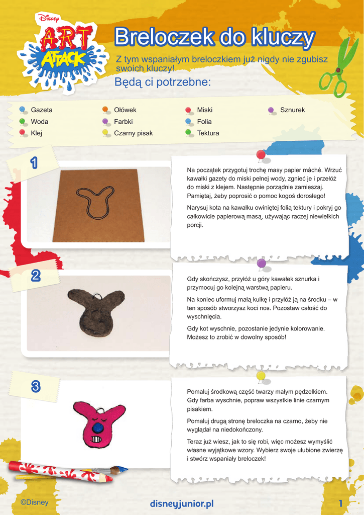 Breloczek do kluczy Z tym wspaniałym breloczkiem już nigdy nie zgubisz swoich kluczy! Będą ci potrzebne: • Gazeta • Ołówek • Miski • Woda • Farbki • Folia • Klej • Czarny pisak • Tektura 1 • Sznurek Na początek przygotuj trochę masy papier mâché. Wrzuć kawałki gazety do miski pełnej wody, zgnieć je i przełóż do miski z klejem. Następnie porządnie zamieszaj. Pamiętaj, żeby poprosić o pomoc kogoś dorosłego! Narysuj kota na kawałku owiniętej folią tektury i pokryj go całkowicie papierową masą, używając raczej niewielkich porcji. 2 Gdy skończysz, przyłóż u góry kawałek sznurka i przymocuj go kolejną warstwą papieru. Na koniec uformuj małą kulkę i przyłóż ją na środku – w ten sposób stworzysz koci nos. Pozostaw całość do wyschnięcia. Gdy kot wyschnie, pozostanie jedynie kolorowanie. Możesz to zrobić w dowolny sposób! 3 Pomaluj środkową część twarzy małym pędzelkiem. Gdy farba wyschnie, popraw wszystkie linie czarnym pisakiem. Pomaluj drugą stronę breloczka na czarno, żeby nie wyglądał na niedokończony. Teraz już wiesz, jak to się robi, więc możesz wymyślić własne wyjątkowe wzory. Wybierz swoje ulubione zwierzę i stwórz wspaniały breloczek! ©Disney disneyjunior.pl 1