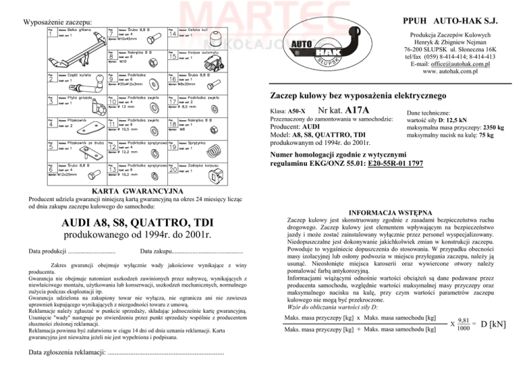 PPUH AUTO-HAK S.J. WyposaŜenie zaczepu: Produkcja Zaczepów Kulowych Henryk & Zbigniew Nejman 76-200 SŁUPSK ul. Słoneczna 16K tel/fax (059) 8-414-414; 8-414-413 E-mail: [email protected] www. autohak.com.pl Zaczep kulowy bez wyposaŜenia elektrycznego A17A Klasa: A50-X Nr kat. Przeznaczony do zamontowania w samochodzie: Producent: AUDI Model: A8, S8, QUATTRO, TDI produkowanym od 1994r. do 2001r. Dane techniczne: wartość siły D: 12,5 kN maksymalna masa przyczepy: 2350 kg maksymalny nacisk na kulę: 75 kg Numer homologacji zgodnie z wytycznymi regulaminu EKG/ONZ 55.01: E20-55R-01 1797 KARTA GWARANCYJNA Producent udziela gwarancji niniejszą kartą gwarancyjną na okres 24 miesięcy licząc od dnia zakupu zaczepu kulowego do samochodu: INFORMACJA WSTĘPNA AUDI A8, S8, QUATTRO, TDI produkowanego od 1994r. do 2001r. Data produkcji .............................. Data zakupu............................................. Zakres gwarancji obejmuje wyłącznie wady jakościowe wynikające z winy producenta. Gwarancja nie obejmuje natomiast uszkodzeń zawinionych przez nabywcę, wynikających z niewłaściwego montaŜu, uŜytkowania lub konserwacji, uszkodzeń mechanicznych, normalnego zuŜycia podczas eksploatacji itp. Gwarancja udzielona na zakupiony towar nie wyłącza, nie ogranicza ani nie zawiesza uprawnień kupującego wynikających z niezgodności towaru z umową. Reklamacje naleŜy zgłaszać w punkcie sprzedaŜy, składając jednocześnie kartę gwarancyjną. Usunięcie "wady" następuje po stwierdzeniu przez punkt sprzedaŜy wspólnie z producentem słuszności złoŜonej reklamacji. Reklamacja powinna być załatwiona w ciągu 14 dni od dnia uznania reklamacji. Karta gwarancyjna jest niewaŜna jeŜeli nie jest wypełniona i podpisana. Data zgłoszenia reklamacji: ................................................................... Zaczep kulowy jest skonstruowany zgodnie z zasadami bezpieczeństwa ruchu drogowego. Zaczep kulowy jest elementem wpływającym na bezpieczeństwo jazdy i moŜe zostać zainstalowany wyłącznie przez personel wyspecjalizowany. Niedopuszczalne jest dokonywanie jakichkolwiek zmian w konstrukcji zaczepu. Powoduje to wygaśniecie dopuszczenia do stosowania. W przypadku obecności masy izolacyjnej lub osłony podwozia w miejscu przylegania zaczepu, naleŜy ją usunąć. Nieosłonięte miejsca karoserii oraz wywiercone otwory naleŜy pomalować farbą antykorozyjną. Informacjami wiąŜącymi odnośnie wartości obciąŜeń są dane podawane przez producenta samochodu, względnie wartości maksymalnej masy przyczepy oraz maksymalnego nacisku na kulę, przy czym wartości parametrów zaczepu kulowego nie mogą być przekroczone. Wzór do obliczania wartości siły D: Maks. masa przyczepy [kg] x Maks. masa samochodu [kg] Maks. masa przyczepy [kg] + Maks. masa samochodu [kg] X 9,81 = 1000 D [kN] INSTRUKCJA MontaŜu i eksploatacji zaczepu kulowego Oznaczenie zacisku wg ISO PN 1 L 2 + 3 31 4 R 5 58R 6 54 7 58L Łączenie przewodów Do świateł kierunku jazdy lewych Tylne światła przeciwmgłowe Do masy pojazdu Do świateł kierunku jazdy prawych Do świateł pozycyjnych prawych Do świateł hamowania Do świateł pozycyjnych lewych 7 5 A Kolejność czynności przy montaŜu 7 śruba istniejąca w samochodzie 10 4 1 17 18 B 19 6 4 15 2 16 3 Zaczep kulowy przeznaczony jest do zamontowania w samochodzie: AUDI A8, S8, QUATTRO, TDI, produkowanym od 1994r. do 2001r., nr katalogowy A17A i słuŜy do ciągnięcia przyczep o masie całkowitej 2350 kg i nacisku na kulę max 75 kg. 1. Zdjąć zderzak. 2. Odkręcić ucho holownicze z tyłu samochodu, prawa strona (nie będzie ponownie montowane). 3. Odkręcić tylny wspornik mocowania tłumika. 4. Odkręcić wspornik mocowania zderzaka (lewa strona), wsunąć śrubę na wysięgniku (poz. 5) (umieścić ją w fabrycznym otworze w analogicznym miejscu do śruby juŜ istniejącej fabrycznie na wysięgniku (pozycja A) (prawa strona). 5. PrzyłoŜyć hak do podwozia tak, aby otwory zaczepu pokryły się z otworami w podwoziu samochodu, a następnie skręcić jak pokazano na rys. (uŜyj podkładek poz. 10). 6. Przykręcić wspornik mocowania tłumika po uprzednim odszlifowaniu i usunięciu od niego śruby, co umoŜliwi przykręcenie w/w do śruby pozycja B. 7. Przykręcić zderzak. 8. Przykręcić korpus automatu (poz. 15) śrubami M12x25mm (poz. 6). Zamocować kulę zgodnie z instrukcją dołączaną do zaczepu z końcówką szybkodemontowalną. 9. Przykręcić blachę pod gniazdo (poz. 3) zgodnie z rysunkiem. 10. Dokręcić wszystkie śruby z momentem, jak pokazano w tabeli. 11. Podłączyć przewody z gniazdka 7 – bieg. do instalacji elektrycznej zgodnie z instrukcją fabryczną samochodu (zaleca się wykonanie w ASO). 12. Uzupełnić ewentualne ubytki powłoki malarskiej zaczepu powstałe w trakcie montaŜu. Zalecany moment skręcający dla śrub i nakrętek 8,8: M 8 - 25 Nm M 10 - 55 Nm M 12 - 85 Nm M 14 - 135 Nm OD PRODUCENTA Dziękujemy za wybór produkowanego przez naszą firmę zaczepu kulowego. Jego niezawodność została potwierdzona licznymi testami oraz opiniami zadowolonych klientów. JednakŜe niezawodność zaczepów kulowych jest zaleŜna równieŜ od prawidłowego montaŜu oraz prawidłowej eksploatacji. Z tego powodu prosimy Państwa o staranne przeczytanie niniejszej instrukcji montaŜu oraz przestrzeganie właściwych wskazówek. Zaczep naleŜy zamontować w miejscach do tego celu przeznaczonych przez producenta samochodu. UWAGA Po zamontowaniu zaczepu kulowego naleŜy uzyskać wpis w dowodzie rejestracyjnym pojazdu na „stacji kontroli pojazdów” właściwej dla miejsca zamieszkania. Samochód powinien być wyposaŜony w : -kierunkowskazy boczne -lusterka boczne o rozstawie co najmniej szerokości przyczepy Sprawdzać śruby mocujące zaczepu kulowego po około 1 000 km przebiegu eksploatacji. Kula zaczepu musi być utrzymana w czystości i konserwowana smarem stałym