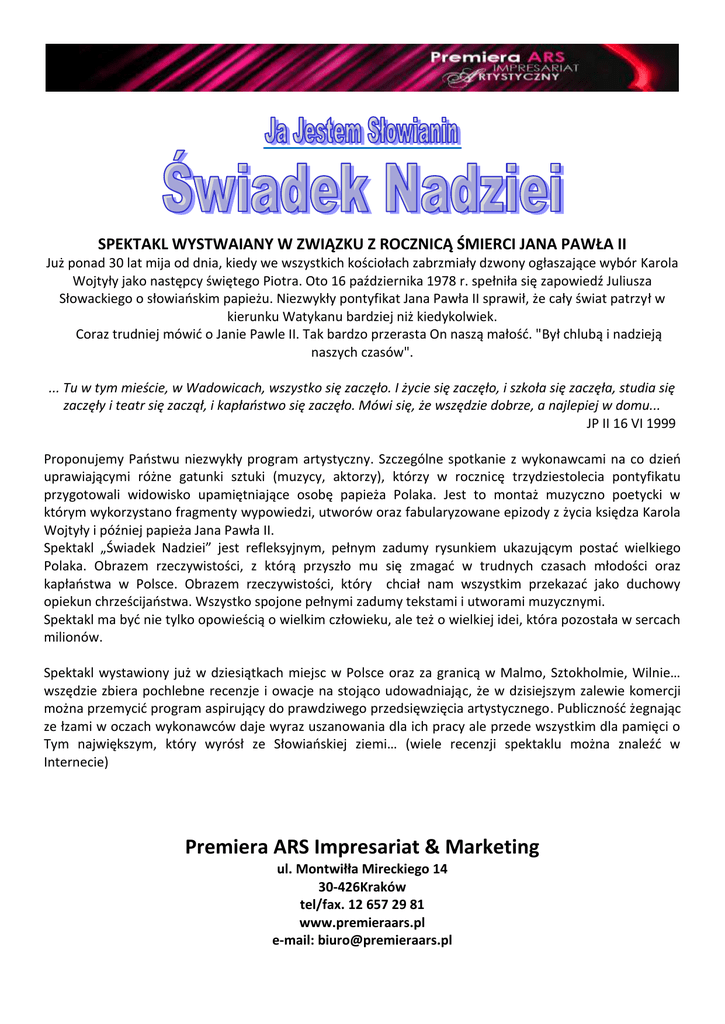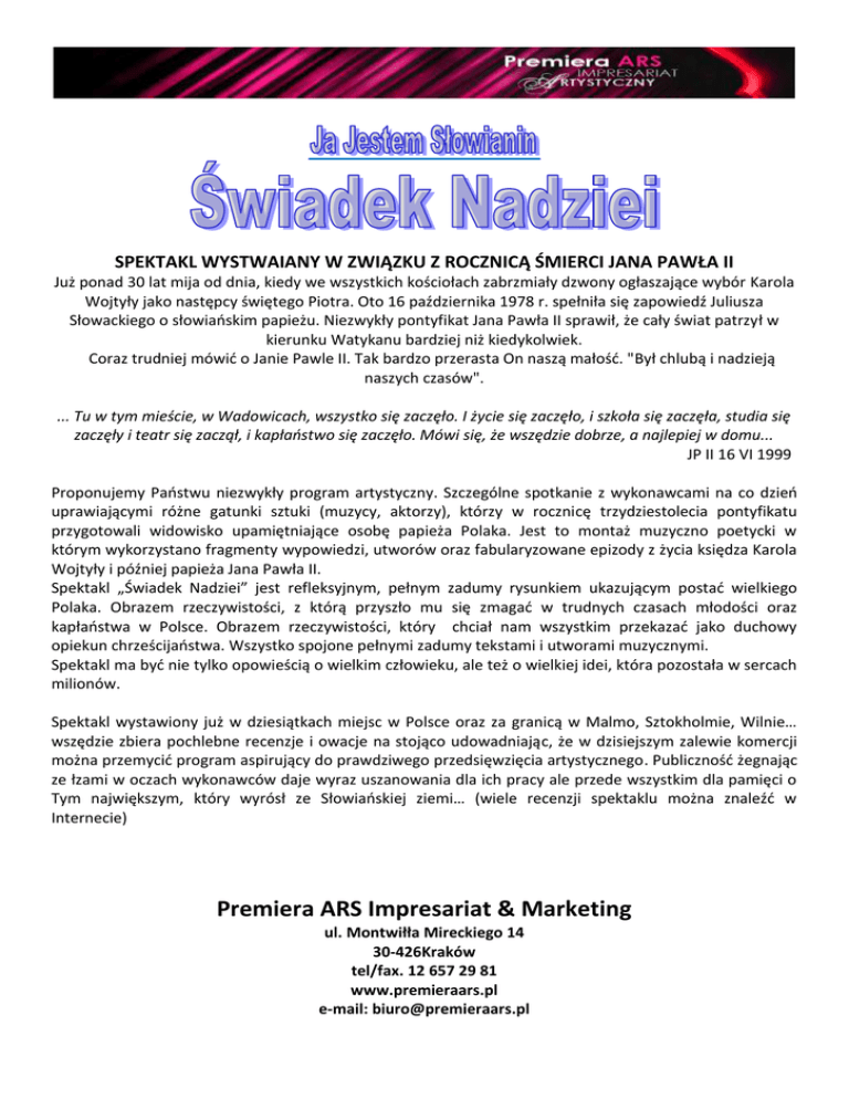 SPEKTAKL WYSTWAIANY W ZWIĄZKU Z ROCZNICĄ ŚMIERCI JANA PAWŁA II Już ponad 30 lat mija od dnia, kiedy we wszystkich kościołach zabrzmiały dzwony ogłaszające wybór Karola Wojtyły jako następcy świętego Piotra. Oto 16 października 1978 r. spełniła się zapowiedź Juliusza Słowackiego o słowiaoskim papieżu. Niezwykły pontyfikat Jana Pawła II sprawił, że cały świat patrzył w kierunku Watykanu bardziej niż kiedykolwiek. Coraz trudniej mówid o Janie Pawle II. Tak bardzo przerasta On naszą małośd. "Był chlubą i nadzieją naszych czasów". ... Tu w tym mieście, w Wadowicach, wszystko się zaczęło. I życie się zaczęło, i szkoła się zaczęła, studia się zaczęły i teatr się zaczął, i kapłaostwo się zaczęło. Mówi się, że wszędzie dobrze, a najlepiej w domu... JP II 16 VI 1999 Proponujemy Paostwu niezwykły program artystyczny. Szczególne spotkanie z wykonawcami na co dzieo uprawiającymi różne gatunki sztuki (muzycy, aktorzy), którzy w rocznicę trzydziestolecia pontyfikatu przygotowali widowisko upamiętniające osobę papieża Polaka. Jest to montaż muzyczno poetycki w którym wykorzystano fragmenty wypowiedzi, utworów oraz fabularyzowane epizody z życia księdza Karola Wojtyły i później papieża Jana Pawła II. Spektakl „Świadek Nadziei” jest refleksyjnym, pełnym zadumy rysunkiem ukazującym postad wielkiego Polaka. Obrazem rzeczywistości, z którą przyszło mu się zmagad w trudnych czasach młodości oraz kapłaostwa w Polsce. Obrazem rzeczywistości, który chciał nam wszystkim przekazad jako duchowy opiekun chrześcijaostwa. Wszystko spojone pełnymi zadumy tekstami i utworami muzycznymi. Spektakl ma byd nie tylko opowieścią o wielkim człowieku, ale też o wielkiej idei, która pozostała w sercach milionów. Spektakl wystawiony już w dziesiątkach miejsc w Polsce oraz za granicą w Malmo, Sztokholmie, Wilnie… wszędzie zbiera pochlebne recenzje i owacje na stojąco udowadniając, że w dzisiejszym zalewie komercji można przemycid program aspirujący do prawdziwego przedsięwzięcia artystycznego. Publicznośd żegnając ze łzami w oczach wykonawców daje wyraz uszanowania dla ich pracy ale przede wszystkim dla pamięci o Tym największym, który wyrósł ze Słowiaoskiej ziemi… (wiele recenzji spektaklu można znaleźd w Internecie) Premiera ARS Impresariat & Marketing ul. Montwiłła Mireckiego 14 30-426Kraków tel/fax. 12 657 29 81 www.premieraars.pl e-mail: [email protected] Wykonawcy: Alicja Kubaszewska Robert Nowak Natalia Krupowczyk Yanoosh Baran Monika Gębala Barbara Guc Czas trwania spektaklu: 70 minut informacje Spektakl zrealizowany w formie teatralno muzycznej. Ukazane są tutaj w inscenizacjach przełomowe momenty z życia Karola Wojtyły, które dodatkowo wzbogacone są prezentacją nawiązujących do nich utworów bądź wypowiedzi Ojca Świętego. Częśd muzyczna przeplata się ze scenami, wykonywane są tutaj najbardziej znane utwory kojarzone z Janem Pawłem II np. Barka czy Góralu czy ci nie żal? Wszyscy wykonawcy są artystami śpiewającymi więc wokalnie program prezentuje wysoki poziom. Całośd odbywa się w inscenizacji multimedialnej, w trakcie programu na ekranie wyświetlane są zdjęcia stanowiące swoiste tło spektaklu. Wykonawcy: Alicja Kubaszewska Aktorka teatralna, w latach osiemdziesiątych występowała w teatrach Poznania później w krakowskim Maszkaronie, Teatrze STU, obecnie współpracuje z Theatrum Mundi (Teatralne Centrum Wartości i Pojednania im. Mieczysława Kotlarczyka), którego spektakle wystawiane są w całej Europie. W 1993 roku zagrała w filmie Lista Schindlera. Znana również z telewizyjnego Spotkania z Balladą. Yanoosh Baran Artysta wszechstronny. Wokalista, multiinstrumentalista, autor tekstów. Brał udział w wielu projektach muzycznych od bluesa po jazz. Kreował wiele ról w muzycznych spektaklach min. u Anny Osławskiej. Na co dzieo wokalista krakowskiej formacji YanooshBaranBand, grupy Siedem Kotów, Jazzowej Piwnicy Pod Baranami prowadzonej przez Marka Michalaka. Natalia Krupowczyk Wspaniała wokalistka biorąca udział w wielu krakowskich przedsięwzięciach muzycznych. Współpracuje z czołowymi muzykami Krakowa doskonale odnajdując się w różnych stylach muzycznych od jazzu po muzykę rozrywkową. Od 2008 roku występuje w zespole ANWAR. Monika Gębala Aktorka, wokalistka, współpracuje z grupą Siedem Kotów Katarzyny Cygan. Liderka zespołu K3 powstałego z inicjatywy znanego muzyka Janusza Blecharza. Występuje również w Piwnicy pod Baranami. Robert Nowak Muzyk, wokalista, aranżer. Zdobywca pierwszego miejsca podczas Festiwalu Piosenki w Kołobrzegu w 1990 roku. W połowie lat dziewięddziesiątych wystąpił w Szansie na Sukces i po występie podpisał wieloletni kontrakt, dzięki któremu przez dziesięd lat występował i mieszkał w Zjednoczonych Emiratach Arabskich. Po powrocie założył grupę ANWAR – jedyny w naszej części europy zespół wykonujący na żywo przeboje muzyki arabskiej. Barbara Guc Pochodząca z Nowego Sącza utalentowana aktorka i wokalistka. Od roku występuje w spektaklu Świadek Nadziei wcześniej min. w programie „Drogi do wolności”.