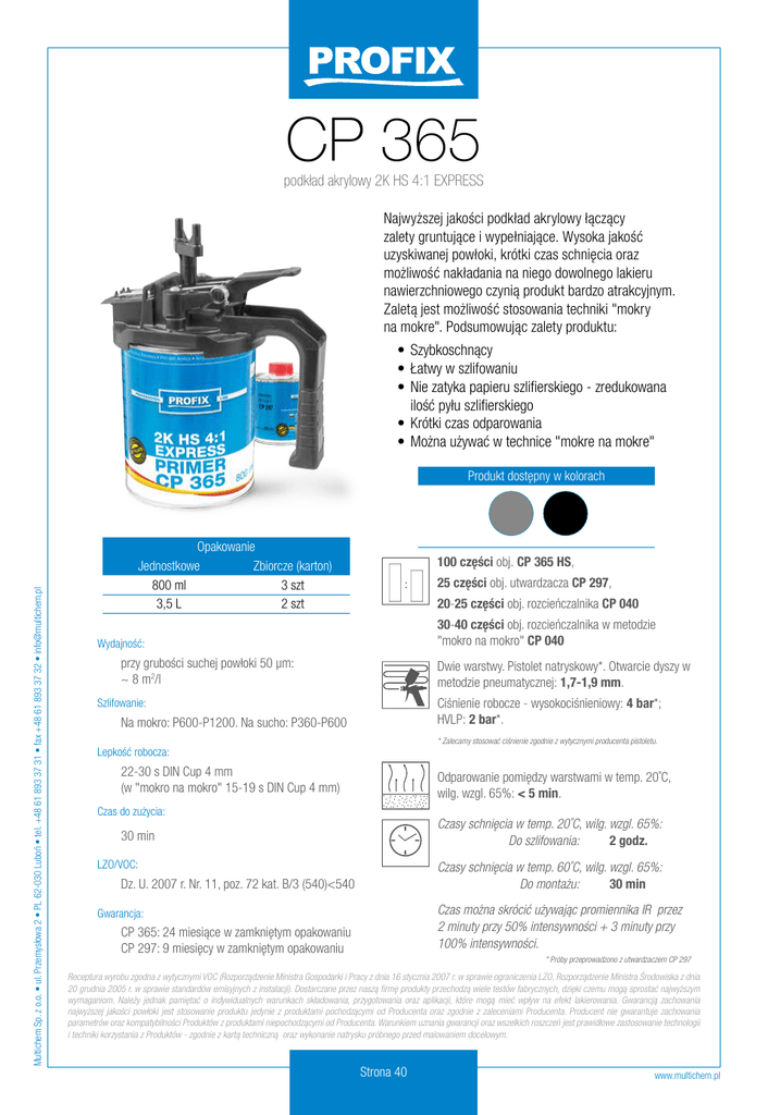 CP 365 podkład akrylowy 2K HS 4:1 EXPRESS Najwyższej jakości podkład akrylowy łączący zalety gruntujące i wypełniające. Wysoka jakość uzyskiwanej powłoki, krótki czas schnięcia oraz możliwość nakładania na niego dowolnego lakieru nawierzchniowego czynią produkt bardzo atrakcyjnym. Zaletą jest możliwość stosowania techniki "mokry na mokre". Podsumowując zalety produktu: • Szybkoschnący • Łatwy w szlifowaniu • Nie zatyka papieru szlifierskiego - zredukowana ilość pyłu szlifierskiego • Krótki czas odparowania • Można używać w technice "mokre na mokre" Multichem Sp. z o.o. • ul. Przemysłowa 2 • PL 62-030 Luboń • tel. +48 61 893 37 31 • fax +48 61 893 37 32 • [email protected] Produkt dostępny w kolorach Opakowanie Jednostkowe Zbiorcze (karton) 800 ml 3 szt 3,5 L 2 szt 100 części obj. CP 365 HS, 25 części obj. utwardzacza CP 297, 20-25 części obj. rozcieńczalnika CP 040 30-40 części obj. rozcieńczalnika w metodzie "mokro na mokro" CP 040 Wydajność: przy grubości suchej powłoki 50 μm: ~ 8 m2/l Dwie warstwy. Pistolet natryskowy*. Otwarcie dyszy w metodzie pneumatycznej: 1,7-1,9 mm. Ciśnienie robocze - wysokociśnieniowy: 4 bar*; HVLP: 2 bar*. Szlifowanie: Na mokro: P600-P1200. Na sucho: P360-P600 * Zalecamy stosować ciśnienie zgodnie z wytycznymi producenta pistoletu. Lepkość robocza: 22-30 s DIN Cup 4 mm (w "mokro na mokro" 15-19 s DIN Cup 4 mm) Odparowanie pomiędzy warstwami w temp. 20˚C, wilg. wzgl. 65%: < 5 min. Czas do zużycia: Czasy schnięcia w temp. 20˚C, wilg. wzgl. 65%: Do szlifowania: 2 godz. 30 min LZO/VOC: Czasy schnięcia w temp. 60˚C, wilg. wzgl. 65%: Do montażu: 30 min Dz. U. 2007 r. Nr. 11, poz. 72 kat. B/3 (540)<540 Czas można skrócić używając promiennika IR przez 2 minuty przy 50% intensywności + 3 minuty przy 100% intensywności. Gwarancja: CP 365: 24 miesiące w zamkniętym opakowaniu CP 297: 9 miesięcy w zamkniętym opakowaniu * Próby przeprowadzono z utwardzaczem CP 297 Receptura wyrobu zgodna z wytycznymi VOC (Rozporządzenie Ministra Gospodarki i Pracy z dnia 16 stycznia 2007 r. w sprawie ograniczenia LZO, Rozporządzenie Ministra Środowiska z dnia 20 grudnia 2005 r. w sprawie standardów emisyjnych z instalacji). Dostarczane przez naszą firmę produkty przechodzą wiele testów fabrycznych, dzięki czemu mogą sprostać najwyższym wymaganiom. Należy jednak pamiętać o indywidualnych warunkach składowania, przygotowania oraz aplikacji, które mogą mieć wpływ na efekt lakierowania. Gwarancją zachowania najwyższej jakości powłoki jest stosowanie produktu jedynie z produktami pochodzącymi od Producenta oraz zgodnie z zaleceniami Producenta. Producent nie gwarantuje zachowania parametrów oraz kompatybilności Produktów z produktami niepochodzącymi od Producenta. Warunkiem uznania gwarancji oraz wszelkich roszczeń jest prawidłowe zastosowanie technologii i techniki korzystania z Produktów - zgodnie z kartą techniczną oraz wykonanie natrysku próbnego przed malowaniem docelowym. Strona 40 www.multichem.pl