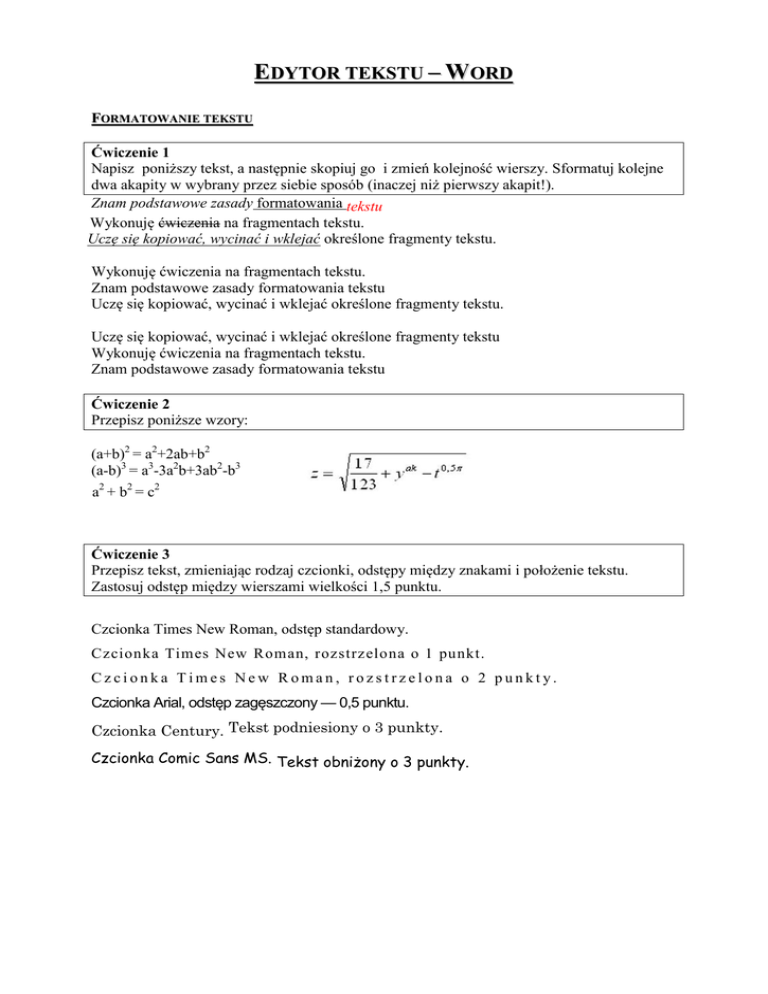EDYTOR TEKSTU – WORD FORMATOWANIE TEKSTU Ćwiczenie 1 Napisz poniższy tekst, a następnie skopiuj go i zmień kolejność wierszy. Sformatuj kolejne dwa akapity w wybrany przez siebie sposób (inaczej niż pierwszy akapit!). Znam podstawowe zasady formatowania tekstu Wykonuję ćwiczenia na fragmentach tekstu. Uczę się kopiować, wycinać i wklejać określone fragmenty tekstu. Wykonuję ćwiczenia na fragmentach tekstu. Znam podstawowe zasady formatowania tekstu Uczę się kopiować, wycinać i wklejać określone fragmenty tekstu. Uczę się kopiować, wycinać i wklejać określone fragmenty tekstu Wykonuję ćwiczenia na fragmentach tekstu. Znam podstawowe zasady formatowania tekstu Ćwiczenie 2 Przepisz poniższe wzory: (a+b)2 = a2+2ab+b2 (a-b)3 = a3-3a2b+3ab2-b3 a2 + b2 = c2 Ćwiczenie 3 Przepisz tekst, zmieniając rodzaj czcionki, odstępy między znakami i położenie tekstu. Zastosuj odstęp między wierszami wielkości 1,5 punktu. Czcionka Times New Roman, odstęp standardowy. Czcionka Times New Roman, rozstrzelona o 1 punkt. Czcionka Times New Roman, rozstrzelona o 2 punkty. Czcionka Arial, odstęp zagęszczony — 0,5 punktu. Czcionka Century. Tekst podniesiony o 3 punkty. Czcionka Comic Sans MS. Tekst obniżony o 3 punkty. ZNAKI WYLICZANIA Ćwiczenie 1 Zastosuj niestandardowe znaki wyliczania. Praca z akapitami. Wstawianie znaków wodnych. Używanie funktorów graficznych. Zastosowanie tabulatorów Ćwiczenie Przepisz w dokumencie tekstowym Word listę, jak poniżej z zachowaniem tabulatorów TEKST W KOLUMNACH Ćwiczenie Przepisz poniższy tekst i rozmieść go w jednej, dwóch a następnie trzech kolumnach tak, jak poniżej. Sformatuj tekst: czcionka Times New Roman ,12, pierwszy akapit - kursywa, wyrównanie do lewej drugi - pogrubienie, wyjustowany trzeci – kapitaliki, wyśrodkowany Wraz z rozwojem nauki, techniki, kultury przeobraża się również świadomość społeczna ludzi. Każdy z nas ma określone potrzeby, oczekiwania, pragnienia i dążenia. To one są wyznacznikami naszej aktywności. Kierunek zaś naszych dążeń wyznaczają wartości, które dla jednych są bardziej ważne, a dla drugich mniej ważne. Trudno mówić o występowaniu pojedynczych wartości. Tworzą one hierarchię. Dla jednych wartością nadrzędną jest zdrowie i życie ludzkie, które uważane są za wartości ponadczasowe, dla innych władza i chęć posiadania. Dla każdej jednostki ludzkiej jest to swoisty układ nazywany hierarchią wartości. Postępowanie człowieka zgodne z własnymi przekonaniami, kierowanie się własnymi celami i wartościami tworzą określony pogląd na świat. Wraz z rozwojem nauki, techniki, kultury przeobraża się również świadomość społeczna ludzi. Każdy z nas ma określone potrzeby, oczekiwania, pragnienia i dążenia. To one są wyznacznikami naszej aktywności. Kierunek zaś naszych dążeń wyznaczają wartości, które dla jednych są bardziej ważne, a dla drugich mniej ważne. Trudno mówić o występowaniu pojedynczych wartości. Tworzą one hierarchię. Dla jednych wartością WRAZ Z ROZWOJEM NAUKI, TECHNIKI, KULTURY PRZEOBRAŻA SIĘ RÓWNIEŻ ŚWIADOMOŚĆ SPOŁECZNA LUDZI. KAŻDY Z NAS MA OKREŚLONE POTRZEBY, OCZEKIWANIA, PRAGNIENIA I DĄŻENIA. TO ONE SĄ WYZNACZNIKAMI NASZEJ AKTYWNOŚCI. KIERUNEK ZAŚ NASZYCH DĄŻEŃ WYZNACZAJĄ WARTOŚCI, KTÓRE DLA JEDNYCH SĄ nadrzędną jest zdrowie i życie ludzkie, które uważane są za wartości ponadczasowe, dla innych władza i chęć posiadania. Dla każdej jednostki ludzkiej jest to swoisty układ nazywany hierarchią wartości. Postępowanie człowieka zgodne z własnymi przekonaniami, kierowanie się własnymi celami i wartościami tworzą określony pogląd na świat. BARDZIEJ WAŻNE, A DLA DRUGICH MNIEJ WAŻNE. TRUDNO MÓWIĆ O WYSTĘPOWANIU POJEDYNCZYCH WARTOŚCI. TWORZĄ ONE HIERARCHIĘ. DLA JEDNYCH WARTOŚCIĄ NADRZĘDNĄ JEST ZDROWIE I ŻYCIE LUDZKIE, KTÓRE UWAŻANE SĄ ZA WARTOŚCI PONADCZASOWE, DLA INNYCH WŁADZA I CHĘĆ POSIADANIA. DLA KAŻDEJ JEDNOSTKI LUDZKIEJ JEST TO SWOISTY UKŁAD NAZYWANY HIERARCHIĄ WARTOŚCI. POSTĘPOWANIE CZŁOWIEKA ZGODNE Z WŁASNYMI PRZEKONANIAMI, KIEROWANIE SIĘ WŁASNYMI CELAMI I WARTOŚCIAMI TWORZĄ OKREŚLONY POGLĄD NA ŚWIAT. INICJAŁY Przepisz tekst i wstaw odpowiednie autokształty (Objaśnienia). Sformatuj dokument jak poniżej (czcionka –np. Book Antiqua 14, kolory, kursywa, akapit - wyjustowany). Umieść w środku pierwszego akapitu dowolny rysunek (odpowiednio go sformatuj /ppm -Formatuj obraz – Układ). P itagoras z Samos (572 p.n.e. - 497 p.n.e.) żył w czasach, gdy w Indiach nauczał Budda, a w Chinach Konfucjusz. Założył Związek Pitagorejski – bractwo religijnopolityczne, które prowadziło także działalność naukową. Pitagorejczycy uważali, że świat można opisać za pomocą liczb. Ich celem było poszukiwanie harmonii w świecie. Odkryli np. jakie długości powinny mieć dwie struny, by razem pięknie brzmiały. T wierdzenie zw. twierdzeniem Pitagorasa, używane było już wcześniej przez Babilończyków, Egipcjan i Hindusów. Od pitagorejczyków pochodzi prawdopodobnie dowód i nazwa twierdzenia. „Jeśli trójkąt jest prostokątny, to suma kwadratów długości przyprostokątnych jest równa kwadratowi długości przeciwprostokątnej” a2+b2=c2 c a a, b – przyprostokątne c - przeciwprostokątna T b ales z Miletu (ok. 640 – 546 p.n.e.) jest uważany za jednego z siedmiu najwybitniejszych mędrców starożytności. Był nie tylko filozofem, ale także matematykiem i astronomem. Potrafił podobno przewidywać zaćmienia Słońca i Księżyca. rawdopodobnie to Tales jako pierwszy ustalił, że rok trwa 365 dni. Oprócz twierdzenia zw. tw. Talesa, odkrył także, że kąt wpisany oparty na średnicy okręgu jest kątem prostym. P Ćw. Wykorzystując WordArta, autokształty, symbole oraz indeks dolny i górny wykonaj: H2SO4 – kwas siarkowy H2O – woda (a+b)2=a2+2ab+b2 kwadrat sumy dwóch wyrażeń 