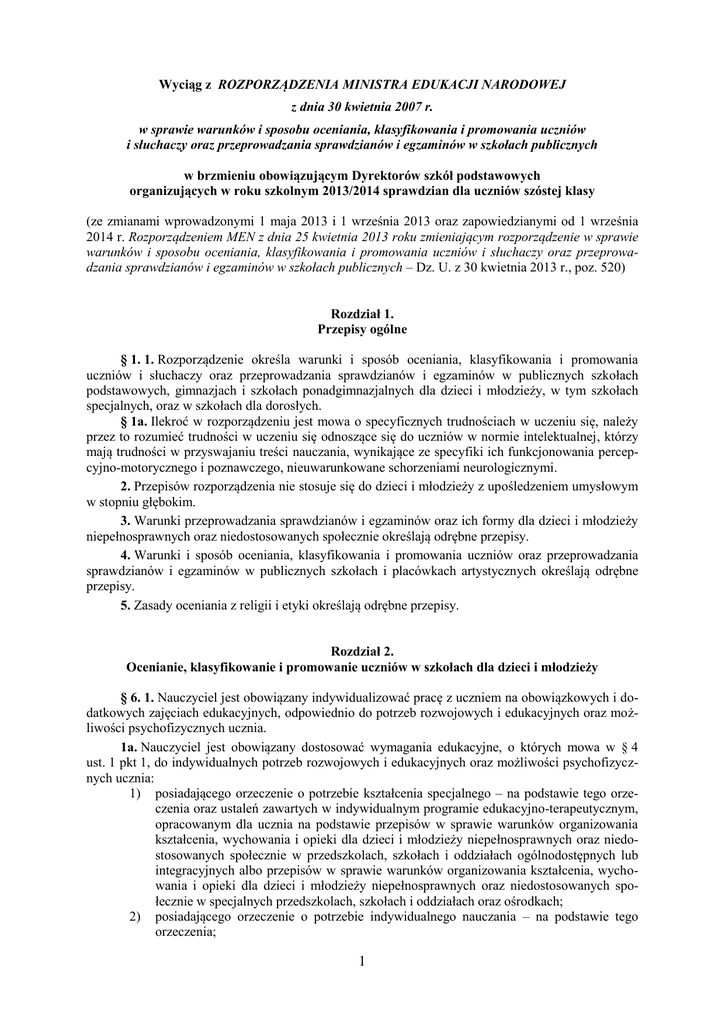 Wyciąg z ROZPORZĄDZENIA MINISTRA EDUKACJI NARODOWEJ z dnia 30 kwietnia 2007 r. w sprawie warunków i sposobu oceniania, klasyfikowania i promowania uczniów i słuchaczy oraz przeprowadzania sprawdzianów i egzaminów w szkołach publicznych w brzmieniu obowiązującym Dyrektorów szkół podstawowych organizujących w roku szkolnym 2013/2014 sprawdzian dla uczniów szóstej klasy (ze zmianami wprowadzonymi 1 maja 2013 i 1 września 2013 oraz zapowiedzianymi od 1 września 2014 r. Rozporządzeniem MEN z dnia 25 kwietnia 2013 roku zmieniającym rozporządzenie w sprawie warunków i sposobu oceniania, klasyfikowania i promowania uczniów i słuchaczy oraz przeprowadzania sprawdzianów i egzaminów w szkołach publicznych – Dz. U. z 30 kwietnia 2013 r., poz. 520) Rozdział 1. Przepisy ogólne § 1. 1. Rozporządzenie określa warunki i sposób oceniania, klasyfikowania i promowania uczniów i słuchaczy oraz przeprowadzania sprawdzianów i egzaminów w publicznych szkołach podstawowych, gimnazjach i szkołach ponadgimnazjalnych dla dzieci i młodzieży, w tym szkołach specjalnych, oraz w szkołach dla dorosłych. § 1a. Ilekroć w rozporządzeniu jest mowa o specyficznych trudnościach w uczeniu się, należy przez to rozumieć trudności w uczeniu się odnoszące się do uczniów w normie intelektualnej, którzy mają trudności w przyswajaniu treści nauczania, wynikające ze specyfiki ich funkcjonowania percepcyjno-motorycznego i poznawczego, nieuwarunkowane schorzeniami neurologicznymi. 2. Przepisów rozporządzenia nie stosuje się do dzieci i młodzieży z upośledzeniem umysłowym w stopniu głębokim. 3. Warunki przeprowadzania sprawdzianów i egzaminów oraz ich formy dla dzieci i młodzieży niepełnosprawnych oraz niedostosowanych społecznie określają odrębne przepisy. 4. Warunki i sposób oceniania, klasyfikowania i promowania uczniów oraz przeprowadzania sprawdzianów i egzaminów w publicznych szkołach i placówkach artystycznych określają odrębne przepisy. 5. Zasady oceniania z religii i etyki określają odrębne przepisy. Rozdział 2. Ocenianie, klasyfikowanie i promowanie uczniów w szkołach dla dzieci i młodzieży § 6. 1. Nauczyciel jest obowiązany indywidualizować pracę z uczniem na obowiązkowych i dodatkowych zajęciach edukacyjnych, odpowiednio do potrzeb rozwojowych i edukacyjnych oraz możliwości psychofizycznych ucznia. 1a. Nauczyciel jest obowiązany dostosować wymagania edukacyjne, o których mowa w § 4 ust. 1 pkt 1, do indywidualnych potrzeb rozwojowych i edukacyjnych oraz możliwości psychofizycznych ucznia: 1) posiadającego orzeczenie o potrzebie kształcenia specjalnego – na podstawie tego orzeczenia oraz ustaleń zawartych w indywidualnym programie edukacyjno-terapeutycznym, opracowanym dla ucznia na podstawie przepisów w sprawie warunków organizowania kształcenia, wychowania i opieki dla dzieci i młodzieży niepełnosprawnych oraz niedostosowanych społecznie w przedszkolach, szkołach i oddziałach ogólnodostępnych lub integracyjnych albo przepisów w sprawie warunków organizowania kształcenia, wychowania i opieki dla dzieci i młodzieży niepełnosprawnych oraz niedostosowanych społecznie w specjalnych przedszkolach, szkołach i oddziałach oraz ośrodkach; 2) posiadającego orzeczenie o potrzebie indywidualnego nauczania – na podstawie tego orzeczenia; 1 3) 4) posiadającego opinię poradni psychologiczno-pedagogicznej, w tym poradni specjalistycznej, o specyficznych trudnościach w uczeniu się lub inną opinię poradni psychologiczno-pedagogicznej, w tym poradni specjalistycznej – na podstawie tej opinii; nieposiadającego orzeczenia lub opinii wymienionych w pkt 1–3, który objęty jest pomocą psychologiczno-pedagogiczną w szkole – na podstawie rozpoznania indywidualnych potrzeb rozwojowych i edukacyjnych oraz indywidualnych możliwości psychofizycznych ucznia dokonanego przez nauczycieli i specjalistów, o którym mowa w przepisach w sprawie zasad udzielania i organizacji pomocy psychologiczno-pedagogicznej w publicznych przedszkolach, szkołach i placówkach. § 6a. 1. Opinia poradni psychologiczno-pedagogicznej, w tym poradni specjalistycznej, o specyficznych trudnościach w uczeniu się może być wydana uczniowi nie wcześniej niż po ukończeniu trzeciej klasy szkoły podstawowej i nie później niż do ukończenia szkoły podstawowej. 2. Na wniosek nauczyciela lub specjalisty wykonującego w szkole zadania z zakresu pomocy psychologiczno-pedagogicznej, prowadzących zajęcia z uczniem w szkole, i po uzyskaniu zgody rodziców (prawnych opiekunów) albo pełnoletniego ucznia lub na wniosek rodziców (prawnych opiekunów) albo pełnoletniego ucznia, opinia, o której mowa w ust. 1, może być wydana także uczniowi gimnazjum i szkoły ponadgimnazjalnej. 3. Wniosek, o którym mowa w ust. 2, wraz z uzasadnieniem składa się do dyrektora szkoły. Dyrektor szkoły, po zasięgnięciu opinii rady pedagogicznej, przekazuje wniosek wraz z uzasadnieniem oraz opinią rady pedagogicznej do poradni psychologiczno-pedagogicznej, w tym poradni specjalistycznej, i informuje o tym rodziców (prawnych opiekunów) lub pełnoletniego ucznia. Rozdział 4. Sprawdzian przeprowadzany w ostatnim roku nauki w szkole podstawowej i egzamin przeprowadzany w ostatnim roku nauki w gimnazjum § 32. 1. W klasie VI szkoły podstawowej jest przeprowadzany sprawdzian poziomu opanowania umiejętności ustalonych w standardach wymagań będących podstawą przeprowadzania sprawdzianu w ostatnim roku nauki w szkole podstawowej, określonych w odrębnych przepisach, zwany dalej „sprawdzianem”. Od 1 września 2014 r.: § 32. 1. W klasie VI szkoły podstawowej jest przeprowadzany sprawdzian obejmujący wymagania ustalone w podstawie programowej kształcenia ogólnego, określonej w przepisach w sprawie podstawy programowej wychowania przedszkolnego oraz kształcenia ogólnego w poszczególnych typach szkół, zwany dalej „sprawdziane