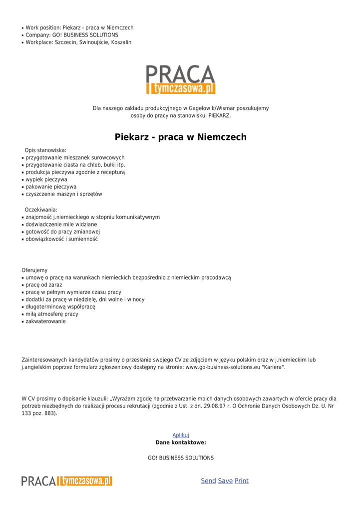 ● ● ● Work position: Piekarz - praca w Niemczech Company: GO! BUSINESS SOLUTIONS Workplace: Szczecin, Świnoujście, Koszalin Dla naszego zakładu produkcyjnego w Gagelow k/Wismar poszukujemy osoby do pracy na stanowisku: PIEKARZ. Piekarz - praca w Niemczech ■ ■ ■ ■ ■ ■ ■ ■ ■ ■ Opis stanowiska: przygotowanie mieszanek surowcowych przygotowanie ciasta na chleb, bułki itp. produkcja pieczywa zgodnie z recepturą wypiek pieczywa pakowanie pieczywa czyszczenie maszyn i sprzętów Oczekiwania: znajomość j.niemieckiego w stopniu komunikatywnym doświadczenie mile widziane gotowość do pracy zmianowej obowiązkowość i sumienność Oferujemy umowę o pracę na warunkach niemieckich bezpośrednio z niemieckim pracodawcą pracę od zaraz pracę w pełnym wymiarze czasu pracy dodatki za pracę w niedzielę, dni wolne i w nocy długoterminową współpracę miłą atmosferę pracy zakwaterowanie ■ ■ ■ ■ ■ ■ ■ Zainteresowanych kandydatów prosimy o przesłanie swojego CV ze zdjęciem w języku polskim oraz w j.niemieckim lub j.angielskim poprzez formularz zgłoszeniowy dostępny na stronie: www.go-business-solutions.eu "Kariera". W CV prosimy o dopisanie klauzuli: „Wyrażam zgodę na przetwarzanie moich danych osobowych zawartych w ofercie pracy dla potrzeb niezbędnych do realizacji procesu rekrutacji (zgodnie z Ust. z dn. 29.08.97 r. O Ochronie Danych Osobowych Dz. U. Nr 133 poz. 883). Aplikuj Dane kontaktowe: GO! BUSINESS SOLUTIONS Send Save Print Tweet