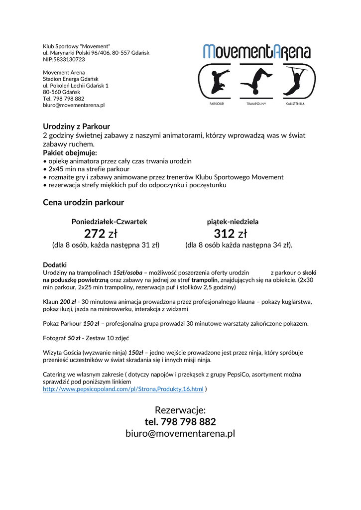 Klub Sportowy "Movement" ul. Marynarki Polski 96/406, 80-557 Gdańsk NIP:5833130723 Movement Arena Stadion Energa Gdańsk ul. Pokoleń Lechii Gdańsk 1 80-560 Gdańsk Tel. 798 798 882 [email protected] Urodziny z Parkour 2 godziny świetnej zabawy z naszymi animatorami, którzy wprowadzą was w świat zabawy ruchem. Pakiet obejmuje: • opiekę animatora przez cały czas trwania urodzin • 2x45 min na strefie parkour • rozmaite gry i zabawy animowane przez trenerów Klubu Sportowego Movement • rezerwacja strefy miękkich puf do odpoczynku i poczęstunku Cena urodzin parkour Poniedziałek-Czwartek 272 zł piątek-niedziela 312 zł (dla 8 osób, każda następna 31 zł) (dla 8 osób każda następna 34 zł). Dodatki Urodziny na trampolinach 15zł/osoba – możliwość poszerzenia oferty urodzin z parkour o skoki na poduszkę powietrzną oraz zabawy na jednej ze stref trampolin, znajdujących się na obiekcie. (2x30 min parkour, 2x25 min trampoliny, rezerwacja puf i stolików 2,5 godziny) Klaun 200 zł - 30 minutowa animacja prowadzona przez profesjonalnego klauna – pokazy kuglarstwa, pokaz iluzji, jazda na minirowerku, interakcja z widzami Pokaz Parkour 150 zł – profesjonalna grupa prowadzi 30 minutowe warsztaty zakończone pokazem. Fotograf 50 zł - Zestaw 10 zdjęć Wizyta Gościa (wyzwanie ninja) 150zł – jedno wejście prowadzone jest przez ninja, który spróbuje przenieść uczestników w świat skradania się i innych misji ninja. Catering we własnym zakresie ( dotyczy napojów i przekąsek z grupy PepsiCo, asortyment można sprawdzić pod poniższym linkiem http://www.pepsicopoland.com/pl/Strona,Produkty,16.html ) Rezerwacje: tel. 798 798 882 [email protected]