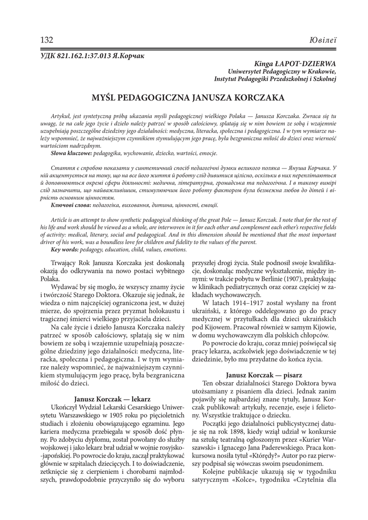132 Ювілеї УДК 821.162.1:37.013 Я.Корчак Kinga ŁAPOT-DZIERWA Uniwersytet Pedagogiczny w Krakowie, Instytut Pedagogiki Przedszkolnej i Szkolnej MYŚL PEDAGOGICZNA JANUSZA KORCZAKA Artykuł, jest syntetyczną próbą ukazania myśli pedagogicznej wielkiego Polaka — Janusza Korczaka. Zwraca się tu uwagę, że na całe jego życie i dzieło należy patrzeć w sposób całościowy, splatają się w nim bowiem ze sobą i wzajemnie uzupełniają poszczególne dziedziny jego działalności: medyczna, literacka, społeczna i pedagogiczna. I w tym wymiarze należy wspomnieć, że najważniejszym czynnikiem stymulującym jego pracę, była bezgraniczna miłość do dzieci oraz wierność wartościom nadrzędnym. Słowa kluczowe: pedagogika, wychowanie, dziecko, wartości, emocje. Стаття є спробою показати у синтетичний спосіб педагогічні думки великого поляка — Януша Корчака. У ній акцентується на тому, що на все його життя й роботу слід дивитися цілісно, оскільки в них переплітаються й доповнюються окремі сфери діяльності: медична, літературна, громадська та педагогічна. І в такому вимірі слід зазначити, що найважливішим, стимулюючим його роботу фактором була безмежна любов до дітей і вірність основним цінностям. Ключові слова: педагогіка, виховання, дитина, цінності, емоції. Article is an attempt to show synthetic pedagogical thinking of the great Pole — Janusz Korczak. I note that for the rest of his life and work should be viewed as a whole, are interwoven in it for each other and complement each other’s respective fields of activity: medical, literary, social and pedagogical. And in this dimension should be mentioned that the most important driver of his work, was a boundless love for children and fidelity to the values of the parent. Key words: pedagogy, education, child, values, emotions. Trwający Rok Janusza Korczaka jest doskonałą okazją do odkrywania na nowo postaci wybitnego Polaka. Wydawać by się mogło, że wszyscy znamy życie i twórczość Starego Doktora. Okazuje się jednak, że wiedza o nim najczęściej ograniczona jest, w dużej mierze, do spojrzenia przez pryzmat holokaustu i tragicznej śmierci wielkiego przyjaciela dzieci. Na całe życie i dzieło Janusza Korczaka należy patrzeć w sposób całościowy, splatają się w nim bowiem ze sobą i wzajemnie uzupełniają poszczególne dziedziny jego działalności: medyczna, literacka, społeczna i pedagogiczna. I w tym wymiarze należy wspomnieć, że najważniejszym czynnikiem stymulującym jego pracę, była bezgraniczna miłość do dzieci. Janusz Korczak — lekarz Ukończył Wydział Lekarski Cesarskiego Uniwersytetu Warszawskiego w 1905 roku po pięcioletnich studiach i złożeniu obowiązującego egzaminu. Jego kariera medyczna przebiegała w sposób dość płynny. Po zdobyciu dyplomu, został powołany do służby wojskowej i jako lekarz brał udział w wojnie rosyjsko-japońskiej. Po powrocie do kraju, zaczął praktykować głównie w szpitalach dziecięcych. I to doświadczenie, zetknięcie się z cierpieniem i chorobami najmłodszych, prawdopodobnie przyczyniło się do wyboru przyszłej drogi życia. Stale podnosił swoje kwalifikacje, doskonaląc medyczne wykształcenie, między innymi: w trakcie pobytu w Berlinie (1907), praktykując w klinikach pediatrycznych oraz coraz częściej w zakładach wychowawczych. W latach 1914–1917 został wysłany na front ukraiński, z którego oddelegowano go do pracy medycznej w przytułkach dla dzieci ukraińskich pod Kijowem. Pracował również w samym Kijowie, w domu wychowawczym dla polskich chłopców. Po powrocie do kraju, coraz mniej poświęcał się pracy lekarza, aczkolwiek jego doświadczenie w tej dziedzinie, było mu przydatne do końca życia. Janusz Korczak — pisarz Ten obszar działalności Starego Doktora bywa utożsamiany z pisaniem dla dzieci. Jednak zanim pojawiły się najbardziej znane tytuły, Janusz Korczak publikował: artykuły, recenzje, eseje i felietony. Wszystkie traktujące o dziecku. Początki jego działalności publicystycznej datuje się na rok 1898, kiedy wziął udział w konkursie na sztukę teatralną ogłoszonym przez «Kurier Warszawski» i Ignacego Jana Paderewskiego. Praca konkursowa nosiła tytuł «Którędy?» Autor po raz pierwszy podpisał się wówczas swoim pseudonimem. Kolejne publikacje ukazują się w tygodniku satyrycznym «Kolce», tygodniku «Czytelnia dla Київські полоністичні студії. ТОМ XХІІ wszystkich», czasopiśmie «Głos» oraz «Przeglądzie Społecznym». Światowy rozgłos przyniosła Korczakowi powieść pod tytułem «Dzieci Salonu», która ukazała się w wersji książkowej w roku 1906, po wcześniejszych publikacjach w odcinakach na łamach «Głosu». Jak już wspomniałam, oddzielne miejsce w jego twórczości zajmują książki dla dzieci: «Król Maciuś I» (1922), «Król Maciuś I na wyspie bezludnej» (1923), «Bankructwo małego Dżeka» (1924) i «Kajtuś Czarodziej» (1934). Wszystkie wymienione utwory opowiadają o dzieciach, ale czy są przeznaczone dla dzieci? Spróbujmy poszukać odpowiedzi na to trudne pytanie. W każdej książce pojawia się mały chłopiec, dziecięcy bohater. Odnajdziemy w nich portrety dzieci: króla, wygnańca, maga, błazna, a nawet socjalistę. Pisze o nich, w swoim artykule pt. «Niespokojni chłopcy Korczaka», Małgorzata Chrobak [2]. Autorka szczegółowo opisuje postaci korczakowskich bohaterów. W tej samej publikacji odnajdujemy również liczne porównania do innych dziecięcych b