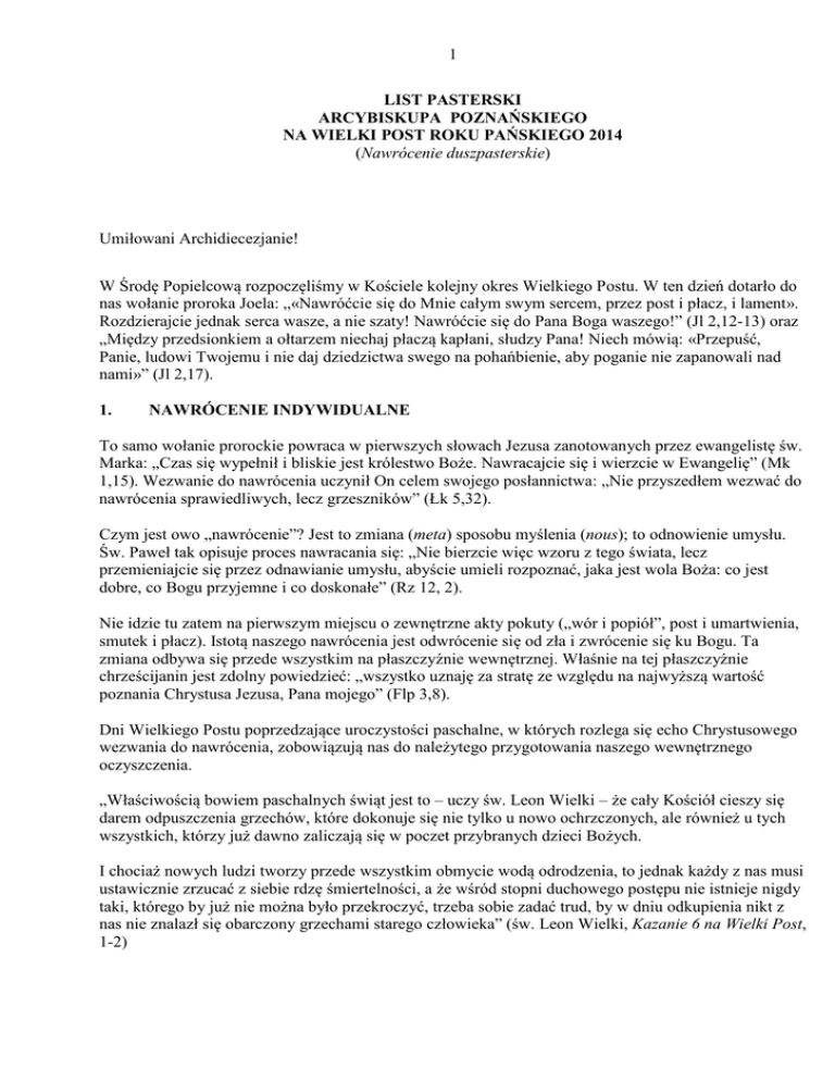 1 LIST PASTERSKI ARCYBISKUPA POZNAŃSKIEGO NA WIELKI POST ROKU PAŃSKIEGO 2014 (Nawrócenie duszpasterskie) Umiłowani Archidiecezjanie! W Środę Popielcową rozpoczęliśmy w Kościele kolejny okres Wielkiego Postu. W ten dzień dotarło do nas wołanie proroka Joela: „«Nawróćcie się do Mnie całym swym sercem, przez post i płacz, i lament». Rozdzierajcie jednak serca wasze, a nie szaty! Nawróćcie się do Pana Boga waszego!” (Jl 2,12-13) oraz „Między przedsionkiem a ołtarzem niechaj płaczą kapłani, słudzy Pana! Niech mówią: «Przepuść, Panie, ludowi Twojemu i nie daj dziedzictwa swego na pohańbienie, aby poganie nie zapanowali nad nami»” (Jl 2,17). 1. NAWRÓCENIE INDYWIDUALNE To samo wołanie prorockie powraca w pierwszych słowach Jezusa zanotowanych przez ewangelistę św. Marka: „Czas się wypełnił i bliskie jest królestwo Boże. Nawracajcie się i wierzcie w Ewangelię” (Mk 1,15). Wezwanie do nawrócenia uczynił On celem swojego posłannictwa: „Nie przyszedłem wezwać do nawrócenia sprawiedliwych, lecz grzeszników” (Łk 5,32). Czym jest owo „nawrócenie”? Jest to zmiana (meta) sposobu myślenia (nous); to odnowienie umysłu. Św. Paweł tak opisuje proces nawracania się: „Nie bierzcie więc wzoru z tego świata, lecz przemieniajcie się przez odnawianie umysłu, abyście umieli rozpoznać, jaka jest wola Boża: co jest dobre, co Bogu przyjemne i co doskonałe” (Rz 12, 2). Nie idzie tu zatem na pierwszym miejscu o zewnętrzne akty pokuty („wór i popiół”, post i umartwienia, smutek i płacz). Istotą naszego nawrócenia jest odwrócenie się od zła i zwrócenie się ku Bogu. Ta zmiana odbywa się przede wszystkim na płaszczyźnie wewnętrznej. Właśnie na tej płaszczyźnie chrześcijanin jest zdolny powiedzieć: „wszystko uznaję za stratę ze względu na najwyższą wartość poznania Chrystusa Jezusa, Pana mojego” (Flp 3,8). Dni Wielkiego Postu poprzedzające uroczystości paschalne, w których rozlega się echo Chrystusowego wezwania do nawrócenia, zobowiązują nas do należytego przygotowania naszego wewnętrznego oczyszczenia. „Właściwością bowiem paschalnych świąt jest to – uczy św. Leon Wielki – że cały Kościół cieszy się darem odpuszczenia grzechów, które dokonuje się nie tylko u nowo ochrzczonych, ale również u tych wszystkich, którzy już dawno zaliczają się w poczet przybranych dzieci Bożych. I chociaż nowych ludzi tworzy przede wszystkim obmycie wodą odrodzenia, to jednak każdy z nas musi ustawicznie zrzucać z siebie rdzę śmiertelności, a że wśród stopni duchowego postępu nie istnieje nigdy taki, którego by już nie można było przekroczyć, trzeba sobie zadać trud, by w dniu odkupienia nikt z nas nie znalazł się obarczony grzechami starego człowieka” (św. Leon Wielki, Kazanie 6 na Wielki Post, 1-2) 2 Konieczność nawrócenia to nie tylko sprawa indywidualna, to także dzieło wspólnotowe. Porównując idealny obraz Kościoła, jakiego pragnął Chrystus – jako swoją świętą i nieskalaną Oblubienicę (por. Ef 5,27) – z tą rzeczywistością, z jaką mamy dzisiaj do czynienia w Kościele, rodzi się pragnienie odnowy. 2. NAWRÓCENIE DUSZPASTERSKIE Z pragnienia odnowy – jeśli jest autentyczne – wypływa aktywność misyjna Kościoła; pierwsze i największe kościelne wyzwanie (Redemptoris missio, 34). Tę myśl podjął Ojciec Święty Franciszek stwierdzając, że nie możemy dłużej pozostawać w biernym oczekiwaniu. Koniecznie trzeba dokonać przejścia od duszpasterstwa zachowawczego do zdecydowanie misyjnego. Nie można pozostawić rzeczy w takim stanie, w jakim są. Bardziej niż zwyczajnego administrowania, Kościołowi potrzeba dzisiaj ustawicznej misji (por. Evangelii gaudium,15.25). Medytując w tym miejscu nad przesłaniem adhortacji apostolskiej papieża Franciszka, chciałbym zwrócić Waszą, Drodzy Diecezjanie, uwagę na kilka prostych, wielkopostnych myśli, związanych z duszpasterskim nawróceniem Kościoła. a. Po pierwsze, Kościół jest wezwany do misyjnego wyjścia ku drugim. Kościół koniecznie musi dzisiaj wyjść, głosząc Ewangelię wszystkim ludziom, w każdym miejscu, przy każdej okazji, nie zwlekając i bez obaw (por. Evangelii gaudium, 23). Wszyscy jesteśmy zaproszeni do wyjścia z własnej wygody i zdobycia się na odwagę, by dotrzeć na „peryferie” potrzebujące światła Ewangelii (por. Evangelii gaudium, 20). To misyjne wyjście na zewnątrz zaczyna się od reformy wspólnoty Kościoła. Chrystus wzywa wspólnotę kościelną do nieustannej reformy, której Kościół – rozumiany jako instytucja ludzka i ziemska – wciąż potrzebuje (por. Unitatis redintegratio, 6). Tego rodzaju odnowa jest w stanie przemienić zwyczaje, style, rozkład zajęć, język w ten sposób, by wszystkie struktury kościelne stały się odpowiedniejszą drogą ewangelizowania współczesnego świata. Te struktury winny stać się bardziej misyjne, aby duszpasterstwo zwyczajne – we wszystkich swych formach – było bardziej ekspansywne i otwarte (por. Evangelii gaudium, 27). Działalność misyjna Kościoła ma być cierpliwa i wytrwała. Nie traci ona spokoju z powodu pojawienia się kąkolu. Ewangelizatorzy umieją nawet ofiarować całe swoje życie i ryzykować nim aż po męczeństwo. Jednocześnie nie idzie o to, by przysporzyć sobie nieprzyjaciół, ile raczej, aby Słowo zostało przyjęte i ukazało swoją wyzwalającą i odnawiającą moc (por. Evangelii gaudium, 24). b. Rozbudzenie powszechnego zaangażowania misyjnego wszystkich wiernych jest najpierw obowiązkiem biskupa diecezji. W mojej misji krzewienia dynamicznej, otwartej i misyjnej komunii jestem zobowiązany do pobudzania ducha misyjnego w Was, troszcząc się o dotarcie do wszystkich (por. Evangelii gaudium, 31). Do takiej ewangelizacji i misyjnego ukierunkowania wezwana jest też diecezja. Także nasza diecezja winna dokonać w sposób zdecydow