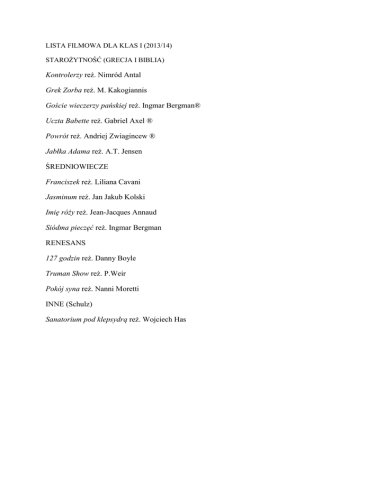 LISTA FILMOWA DLA KLAS I (2013/14) STAROŻYTNOŚĆ (GRECJA I BIBLIA) Kontrolerzy reż. Nimród Antal Grek Zorba reż. M. Kakogiannis Goście wieczerzy pańskiej reż. Ingmar Bergman® Uczta Babette reż. Gabriel Axel ® Powrót reż. Andriej Zwiagincew ® Jabłka Adama reż. A.T. Jensen ŚREDNIOWIECZE Franciszek reż. Liliana Cavani Jasminum reż. Jan Jakub Kolski Imię róży reż. Jean-Jacques Annaud Siódma pieczęć reż. Ingmar Bergman RENESANS 127 godzin reż. Danny Boyle Truman Show reż. P.Weir Pokój syna reż. Nanni Moretti INNE (Schulz) Sanatorium pod klepsydrą reż. Wojciech Has LISTA FILMOWA DLA KLAS I Grek Zorba (1964)reż. M. Kakogiannis Uczta Babette reż. Gabriel Axel Powrót reż. Zwagincew Jabłka Adama reż. A.T. Jensen / Dania 2005 / 96’ Imię róży reż. Jean-Jacques Annaud Goście wieczerzy pańskiej reż. Ingmar Bergman Siódma pieczęć reż. Ingmar Bergman Sanatorium pod klepsydrą reż. Wojciech Hass Kontrolerzy Opis filmu gREK Starożytność Konfrontacja dionizyjskiego króla życia i analfabety – Greka Zorby z apollińskim racjonalistą i pisarzem – Basilem żyjącym w kręgu Biblioteki. Wyraziste por-trety kobiece: tragizm czarnej wdowy i starzejącej się kurtyzany. Poszukiwanie sensu i celu życia, wolności oraz harmonii duszy i ciała. Obrazy archaicznej Grecji. Wątki z prelekcji film jako udana adaptacja powieści Nikosa Kazantzakisa konfrontacja dwóch różnych postaw życiowych – pochwała przyjaźni jednostka w sytuacji tragicznego wyboru (czarna wdowa) dramat starości i samotności (madame Hortensja) rola tańca i muzyki jako form wyrazu osobowości człowieka Pojęcia kluczowe apollińskość dionizyjskość tragizm Opis filmu JABŁKA ADAMA Starożytność Utrzymana w postmodernistycznej konwencji walka dobra ze złem, upostaciowanych w osobach prowadzącego ośrodek pastora (współczesnego Hioba) i poddawanego resocjalizacji neonazisty, Adama. Atrakcyjnie i przystępnie ukazana problematyka teodycei i reinterpretacji Księgi Hioba. Wątki z prelekcji gra znaczeń w tytule filmu (czy jabłko oznacza zawsze zło?) plebania jako miejsce resocjalizacji pastor-idealista jako współczesny Hiob jak walczyć ze złem w człowieku? reinterpretacja Księgi Hioba postmodernistyczna poetyka filmu Pojęcia kluczowe teodycea reinterpretacja postmodernizm