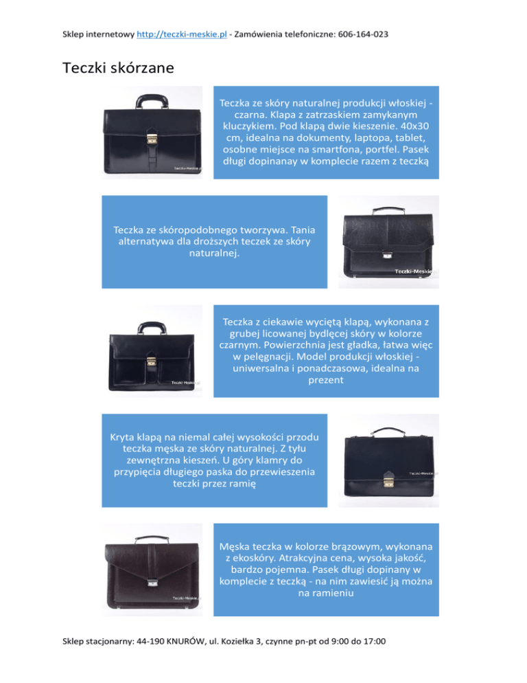 Sklep internetowy http://teczki-meskie.pl - Zamówienia telefoniczne: 606-164-023 Teczki skórzane Teczka ze skóry naturalnej produkcji włoskiej czarna. Klapa z zatrzaskiem zamykanym kluczykiem. Pod klapą dwie kieszenie. 40x30 cm, idealna na dokumenty, laptopa, tablet, osobne miejsce na smartfona, portfel. Pasek długi dopinanay w komplecie razem z teczką Teczka ze skóropodobnego tworzywa. Tania alternatywa dla droższych teczek ze skóry naturalnej. Teczka z ciekawie wyciętą klapą, wykonana z grubej licowanej bydlęcej skóry w kolorze czarnym. Powierzchnia jest gładka, łatwa więc w pelęgnacji. Model produkcji włoskiej uniwersalna i ponadczasowa, idealna na prezent Kryta klapą na niemal całej wysokości przodu teczka męska ze skóry naturalnej. Z tyłu zewnętrzna kieszeń. U góry klamry do przypięcia długiego paska do przewieszenia teczki przez ramię Męska teczka w kolorze brązowym, wykonana z ekoskóry. Atrakcyjna cena, wysoka jakość, bardzo pojemna. Pasek długi dopinany w komplecie z teczką - na nim zawiesić ją można na ramieniu Sklep stacjonarny: 44-190 KNURÓW, ul. Koziełka 3, czynne pn-pt od 9:00 do 17:00 Sklep internetowy http://teczki-meskie.pl - Zamówienia telefoniczne: 606-164-023 TORBY MĘSKIE Torba męska prostokątna do noszenia na ramieniu - czarna marki Pierre Cardin. Wykonana z wysokiej jakości skóry ekologicznej Duża torba z klapą, pasek regulowany o długości maksymalnej 165 cm. Markowa torba David Jones dla eleganckich Panów Oryginalna torba Pierre Cardin. Kieszeń z przodu zamykana suwakiem. Pasek regulowanej dlugości. Czarna pojemna raportówka, idealna na prezent. Zmieścisz w niej dokumenty, teczkę A4, tablet Sklep stacjonarny: 44-190 KNURÓW, ul. Koziełka 3, czynne pn-pt od 9:00 do 17:00 Sklep internetowy http://teczki-meskie.pl - Zamówienia telefoniczne: 606-164-023 SASZETKI MĘSKIE Oferta sklepu Teczki-Meskie.pl to również saszetki męskie ze skóry (klasyczne) oraz nowoczesne, do noszenia na ramieniu tzw przewieszki. Saszetka męska do noszenia na ramieniu marki Pierre Cardin w kolorze czarnym. Zmieści się w niej portfel z dokumentami, klucze, smartfon Nowoczesna saszetka męska/przewieszka marki David Jones. Kieszeń zewnętrzna z przodu. Długi pasek z szerokim zakresem regulacji. Mała torebeczka na klucze, dokumenty, portfel, smartfona Klasyczna saszetka produkcji włoskiej. Wykonana w całości ze skóry naturalnej. Torebka męska z klapą do noszenia w ręku na krótkim pasku (pętla), który zakłada się na nadgarstek. Elegancki wygląd, gruba wytrzymała skóra, wysoka jakość wykonania Sklep stacjonarny: 44-190 KNURÓW, ul. Koziełka 3, czynne pn-pt od 9:00 do 17:00