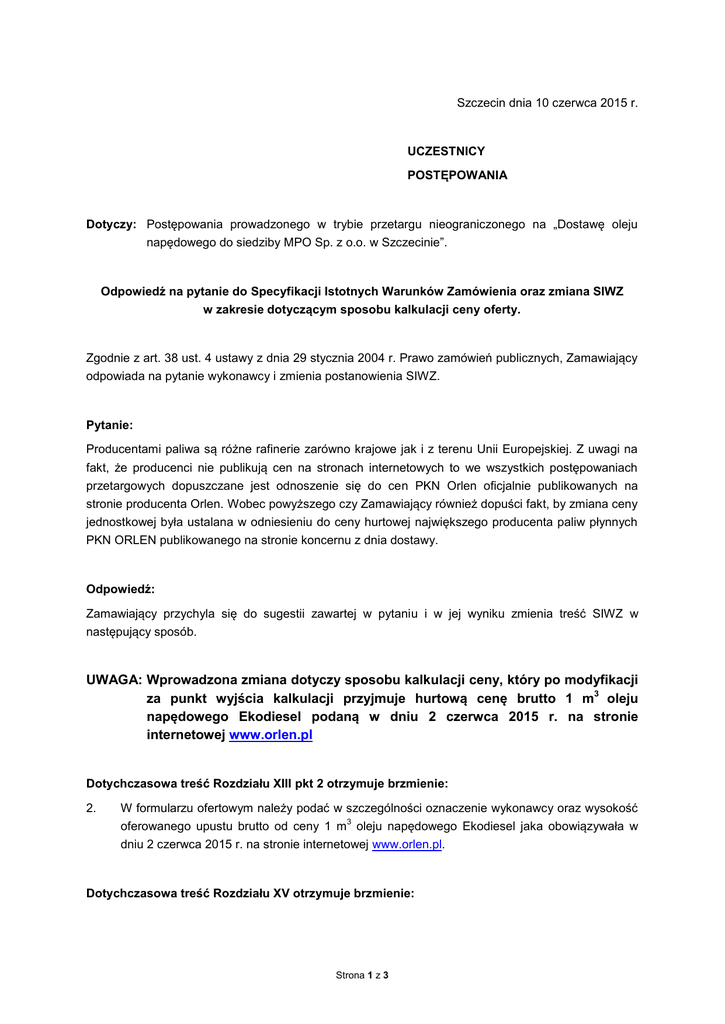 Szczecin dnia 10 czerwca 2015 r. UCZESTNICY POSTĘPOWANIA Dotyczy: Postępowania prowadzonego w trybie przetargu nieograniczonego na „Dostawę oleju napędowego do siedziby MPO Sp. z o.o. w Szczecinie”. Odpowiedź na pytanie do Specyfikacji Istotnych Warunków Zamówienia oraz zmiana SIWZ w zakresie dotyczącym sposobu kalkulacji ceny oferty. Zgodnie z art. 38 ust. 4 ustawy z dnia 29 stycznia 2004 r. Prawo zamówień publicznych, Zamawiający odpowiada na pytanie wykonawcy i zmienia postanowienia SIWZ. Pytanie: Producentami paliwa są różne rafinerie zarówno krajowe jak i z terenu Unii Europejskiej. Z uwagi na fakt, że producenci nie publikują cen na stronach internetowych to we wszystkich postępowaniach przetargowych dopuszczane jest odnoszenie się do cen PKN Orlen oficjalnie publikowanych na stronie producenta Orlen. Wobec powyższego czy Zamawiający również dopuści fakt, by zmiana ceny jednostkowej była ustalana w odniesieniu do ceny hurtowej największego producenta paliw płynnych PKN ORLEN publikowanego na stronie koncernu z dnia dostawy. Odpowiedź: Zamawiający przychyla się do sugestii zawartej w pytaniu i w jej wyniku zmienia treść SIWZ w następujący sposób. UWAGA: Wprowadzona zmiana dotyczy sposobu kalkulacji ceny, który po modyfikacji za punkt wyjścia kalkulacji przyjmuje hurtową cenę brutto 1 m3 oleju napędowego Ekodiesel podaną w dniu 2 czerwca 2015 r. na stronie internetowej www.orlen.pl Dotychczasowa treść Rozdziału XIII pkt 2 otrzymuje brzmienie: 2. W formularzu ofertowym należy podać w szczególności oznaczenie wykonawcy oraz wysokość 3 oferowanego upustu brutto od ceny 1 m oleju napędowego Ekodiesel jaka obowiązywała w dniu 2 czerwca 2015 r. na stronie internetowej www.orlen.pl. Dotychczasowa treść Rozdziału XV otrzymuje brzmienie: Strona 1 z 3 1. Za najkorzystniejszą ofertę uznana zostanie oferta, która uzyska największą liczbę punktów w przyjętym kryterium oceny ofert. 2. Wykonawca obowiązany jest przedłożyć ofertę cenową na załączniku nr 1 do SIWZ. 3. Cena oferty (wysokość upustu brutto) winna być wyrażona w złotych polskich z dokładnością do dwóch miejsc po przecinku. 4. W swojej ofercie cenowej Wykonawca winien zaoferować stały (tj. obowiązujący przez 3 cały czas trwania umowy) upust od ceny brutto 1 m oleju napędowego obliczony od hurtowej ceny brutto oleju napędowego Ekodiesel z dnia 2 czerwca 2015 r. (data publikacji SIWZ) opublikowanej na stronie internetowej www.orlen.pl. Wyjściowa cena hurtowa do kalkulacji wynosi dla wszystkich wykonawców 4.622,34 zł brutto za 1 m3 oleju napędowego. 5. Tak skalkulowana cena rozumiana jako wysokość upustu zostanie przyjęta na potrzeby wyboru najkorzystniejszej oferty. 6. Zaoferowana cena winna obejmować wszelkie rabaty, upusty, zniżki itp. 7. Jeżeli Wykonawcy złożą oferty, których wybór prowadziłby do powstania obowiązku podatkowego Zamawiającego zgodnie z przepisami o podatku od towarów i usług w zakresie dotyczącym wewnątrzwspólnotowego nabycia towarów, Zamawiający w celu oceny takich ofert doliczy do przedstawionych w nich cen podatek od towarów i usług, który miałby obowiązek wpłacić zgodnie z obowiązującymi przepisami. Dotychczasowa treść Rozdziału XVII pkt 2 otrzymuje brzmienie: 2. Zamawiający wybierze jako najkorzystniejszą ofertę Wykonawcy, który zaoferował najwyższy upust od ceny brutto 1 m 3 oleju napędowego, obowiązującej na stronie internetowej www.orlen.pl w dniu 2 czerwca 2015 r. Cena hurtowa brutto z tego dnia wynosiła 4.622,34 zł brutto za 1 m3 oleju napędowego. W § 4 ust. 2 wzoru umowy otrzymuje brzmienie: 2. 3 Strony umowy ustalają, że cena brutto 1 m dostarczonego paliwa ustalana będzie wg następującego wzoru, zgodnie z ofertą Wykonawcy: X = H – wysokość rabatu brutto zaoferowanego w złożonej ofercie , o której mowa w § 8 ust. 4 pkt. 1 ) Umowy gdzie: X H- 3 - cena brutto 1 m paliwa w dniu dostawy z dokładnością do dwóch miejsc po przecinku cena hurtowa brutto 1m³/1000 l oleju napędowego (Ekodiesel) lub oleju napędowego o polepszonych właściwościach niskotemperaturowych (w okresie zimowym) publikowana na stronie internetowej www.orlen.pl wg notowania na dzień dostawy oleju napędowego (podana z dokładnością do dwóch miejsc po przecinku). Strona 2 z 3 Powyższe zmiany stają się częścią SIWZ i są wiążące dla Wykonawców. Wykonawcy zobowiązani są uwzględnić powyższe zmiany przy przygotowaniu ofert. ……………………………………… Załącznik: Nowy wzór formularza ofertowego (Załącznik nr 1 do SIWZ). Proszę o zwrotne potwierdzenie otrzymania niniejszego pisma na nr faksu: 91 462 31 18 Potwierdzam otrzymanie ........... stron pisma w dniu …… czerwca 2015 r. o godz. ……….. …………………………………………..… podpis osoby przyjmującej korespondencję Strona 3 z 3