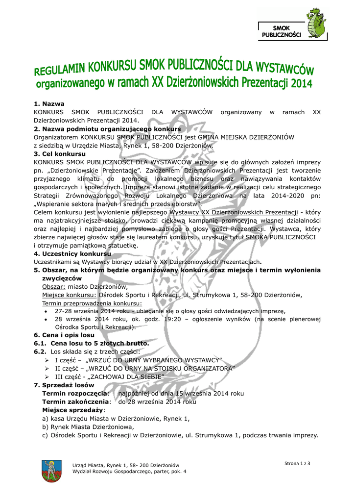 1. Nazwa KONKURS SMOK PUBLICZNOŚCI DLA WYSTAWCÓW organizowany w ramach XX Dzierżoniowskich Prezentacji 2014. 2. Nazwa podmiotu organizującego konkurs Organizatorem KONKURSU SMOK PUBLICZNOŚCI jest GMINA MIEJSKA DZIERŻONIÓW z siedzibą w Urzędzie Miasta, Rynek 1, 58-200 Dzierżoniów. 3. Cel konkursu KONKURS SMOK PUBLICZNOŚCI DLA WYSTAWCÓW wpisuje się do głównych założeń imprezy pn. „Dzierżoniowskie Prezentacje”. Założeniem Dzierżoniowskich Prezentacji jest tworzenie przyjaznego klimatu do promocji lokalnego biznesu oraz nawiązywania kontaktów gospodarczych i społecznych. Impreza stanowi istotne zadanie w realizacji celu strategicznego Strategii Zrównoważonego Rozwoju Lokalnego Dzierżoniowa na lata 2014-2020 pn: „Wspieranie sektora małych i średnich przedsiębiorstw”. Celem konkursu jest wyłonienie najlepszego Wystawcy XX Dzierżoniowskich Prezentacji - który ma najatrakcyjniejsze stoisko, prowadzi ciekawą kampanię promocyjną własnej działalności oraz najlepiej i najbardziej pomysłowo zabiega o głosy gości Prezentacji. Wystawca, który zbierze najwięcej głosów staje się laureatem konkursu, uzyskuje tytuł SMOKA PUBLICZNOŚCI i otrzymuje pamiątkową statuetkę. 4. Uczestnicy konkursu Uczestnikami są Wystawcy biorący udział w XX Dzierżoniowskich Prezentacjach. 5. Obszar, na którym będzie organizowany konkurs oraz miejsce i termin wyłonienia zwycięzców Obszar: miasto Dzierżoniów, Miejsce konkursu: Ośrodek Sportu i Rekreacji, ul. Strumykowa 1, 58-200 Dzierżoniów, Termin przeprowadzenia konkursu: 27-28 września 2014 roku - ubieganie się o głosy gości odwiedzających imprezę, 28 września 2014 roku, ok. godz. 19:20 – ogłoszenie wyników (na scenie plenerowej Ośrodka Sportu i Rekreacji). 6. Cena i opis losu 6.1. Cena losu to 5 złotych brutto. 6.2. Los składa się z trzech części: I część – „WRZUĆ DO URNY WYBRANEGO WYSTAWCY” II część – „WRZUĆ DO URNY NA STOISKU ORGANIZATORA” III część - „ZACHOWAJ DLA SIEBIE” 7. Sprzedaż losów Termin rozpoczęcia: najpóźniej od dnia 15 września 2014 roku Termin zakończenia: do 28 września 2014 roku Miejsce sprzedaży: a) kasa Urzędu Miasta w Dzierżoniowie, Rynek 1, b) Rynek Miasta Dzierżoniowa, c) Ośrodek Sportu i Rekreacji w Dzierżoniowie, ul. Strumykowa 1, podczas trwania imprezy. Urząd Miasta, Rynek 1, 58- 200 Dzierżoniów Wydział Rozwoju Gospodarczego, parter, pok. 4 Strona 1 z 3 8. Sposób przeprowadzenia konkursu 8.1. Wystawcy Dzierżoniowskich Prezentacji posiadają na swoich stoiskach urny, do których osoby odwiedzające imprezę mogą wrzucać swoje głosy (część „WRZUĆ DO URNY WYBRANEGO WYSTAWCY”). 8.2. Jeden los to jeden głos (tj. część losu „WRZUĆ DO URNY WYBRANEGO WYSTAWCY” sprzedawanego przez Organizatora). 8.3. Nie dopuszcza się by kilku Wystawców miało jedną wspólną urnę. 8.4. Wystawcy zabiegając o głosy publiczności mogą organizować na swoich stoiskach, zgodnie z obowiązującymi przepisami prawa, różne konkursy, czy zabawy. Jeśli będą to konkursy, zabawy z nagrodami to proponuje się by koszt jednej nagrody nie przekroczył kwoty 500 zł brutto. Ostateczna decyzja należy do Wystawcy. 8.5. Wystawca nie może przekazywać zebranych przez siebie głosów innemu Wystawcy. 8.6. Wystawca przekazuje Komisji Konkursowej urnę w celu przeliczenia oddanych głosów. 8.7. Przekazanie urn odbywa się w niedzielę (28.09.2014 r.), w godz. 17:30 – 18:30. Wystawcy przynoszą swoje urny do biura Ośrodka Sportu i Rekreacji. 8.8. Po przekazaniu urn Komisji Konkursowej przy obecności przedstawiciela Wystawcy odbywa się liczenie głosów. Do zliczania głosów przedstawiciele Komisji będą mieli przygotowane formularze. 8.9. Zliczane są wszystkie głosy oddane na Wystawcę, tj. losy– część „WRZUĆ DO URNY WYBRANEGO WYSTAWCY”. 8.10. Po zliczeniu wszystkich głosów przedstawiciel Wystawcy potwierdza na formularzu liczbę oddanych głosów poprzez złożenie podpisu. 8.11. Po zliczeniu głosów oddanych na wszystkich Wystawców, którzy przynieśli swoje urny: Komisja Konkursowa analizuje formularze w celu wyłonienia Wystawcy, który otrzymał największą liczbę głosów, głosy oddane w formie losów przechowuje przedstawiciel Komisji Konkursowej i przekazuje po imprezie do zniszczenia Komisji Konkursowej. 8.12. Około godz. 19:20 na scenie plenerowej zostaje podana do publicznej wiadomości nazwa Wystawcy, laureata tytułu SMOK PUBLICZNOŚCI wraz z podaniem liczby oddanych głosów. 8.13. Laureat tytułu zapraszany jest na scenę, gdzie wręczana jest mu statuetka SMOKA PUBLICZNOŚCI. 9. Udział w konkursie Udział w konkursie jest równoznaczny z: akceptacją REGULAMINU KONKURSU SMOK PUBLICZNOŚCI DLA WYSTAWCÓW, zobowiązaniem do przestrzegania zawartych w nim zasad, wyrażeniem zgody na przetwarzanie danych osobowych oraz danych firmy, w celu opublikowania przez Organizatora wizerunku uczestników oraz zwycięzcy konkursu. 10.SSposób i termin ogłaszania wyników konkursu SMOK PUBLICZNOŚCI DLA WYSTAWCÓW 1. Wynik konkursu i wręczenie statuetki SMOK PUBLICZNOŚCI 2014 nastąpi w dniu 28 września 2014 roku ok. godz. 19:20 na scenie plenerowej, zlokalizowanej na terenie Ośrodka Sportu i Rekreacji w Dzierżoniowie, ul. Strumykowa 1. 2. Wyniki konkursu zostaną zamieszczone na stronie internetowej Urzędu Miasta w Dzierżoniowie (www.dzierzoniow.pl) oraz w mediach. Urząd Miasta, Rynek 1, 58- 200 Dzierżoniów Wydział Rozwoju Gospodarczego, parter, pok. 4 Strona 2 z 3 11. Postanowienia końcowe 1. Regulamin Konkursu SMOK PUBLICZNOŚCI DLA WYSTAWCÓW w ramach XX Dzierżoniowskich Prezentacji 2014 będzie dostępny: w siedzibie Organizatora, o której mowa w punkcie 2 Regulaminu, na stronie internetowej Urzędu Miasta w Dzierżoniowie (www.dzierzoniow.pl w zakładce „Gospodarka” – podzakładce „Dzierżoniowskie Prezentacje”), na terenie Ośrodka Sportu i Rekreacji w Dzierżoniowie, 