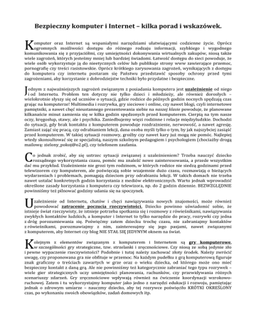 Bezpieczny komputer i Internet – kilka porad i wskazówek. K omputer oraz Internet są wspaniałymi narzędziami ułatwiającymi codzienne życie. Oprócz ogromnych możliwości dostępu do różnego rodzaju informacji, szybkiego i wygodnego komunikowania się z przyjaciółmi, czy umiejętności dokonywania wirtualnych zakupów, niosą także wiele zagrożeń, których jesteśmy mniej lub bardziej świadomi. Łatwość dostępu do sieci powoduje, że wiele osób wykorzystuje ją do nieetycznych celów lub publikuje strony www zawierające przemoc, pornografię czy treści rasistowskie. Oprócz krótkiego zarysowania zagrożeń, wynikających z dostępu do komputera czy internetu postaram się Państwu przedstawić sposoby ochrony przed tymi zagrożeniami, aby korzystanie z dobrodziejstw techniki było przydatne i bezpieczne. z najważniejszych zagrożeń związanym z posiadania komputera jest uzależnienie od niego Jednym i od Internetu. Problem ten dotyczy nie tylko dzieci i młodzieży, ale również dorosłych – wielokrotnie słyszy się od uczniów o sytuacji, gdzie rodzice do późnych godzin nocnych spędzają czas grając na komputerze! Multimedia i rozrywka, gry sieciowe i online, czy nawet blogi, czyli internetowe pamiętniki, a nawet chęć nieustannego prezentowania siebie na naszej klasie powoduje, że planowane kilkanaście minut zamienia się w kilka godzin spędzonych przed komputerem. Cierpią na tym nasze oczy, kręgosłup, stawy, ale i psychika. Zaniedbujemy więzi rodzinne i relacje międzyludzkie. Dochodzi do sytuacji, gdy brak kontaktu z komputerem powoduje rozdrażnienie, nerwowość, a nawet agresję. Zamiast zająć się pracą, czy odrabianiem lekcji, dana osoba myśli tylko o tym, by jak najszybciej zasiąść przed komputerem. W takiej sytuacji rozmowy, groźby czy nawet kary już mogą nie pomóc. Najlepiej wtedy skonsultować się ze specjalistą, naszym szkolnym pedagogiem i psychologiem (chociażby drogą mailową: [email protected]), czy telefonem zaufania. C o jednak zrobić, aby się ustrzec sytuacji związanej z uzależnieniem? Trzeba nauczyć dziecko rozsądnego wykorzystania czasu, pomóc mu znaleźć nowe zainteresowania, a przede wszystkim dać mu przykład. Uzależnienie nie grozi tym rodzinom, w których rodzice nie siedzą godzinami przed telewizorem czy komputerem, ale poświęcają sobie wzajemnie dużo czasu, rozmawiają o bieżących wydarzeniach i problemach, pomagają dzieciom przy odrabianiu lekcji. W takich domach nie trzeba nawet ustalać konkretnych godzin korzystania z mediów elektronicznych. Warto jednak wprowadzić określone zasady korzystania z komputera czy telewizora, np. do 2 godzin dziennie. BEZWZGLĘDNIE powinniśmy też pilnować godziny udania się na spoczynek. U zależnienie od Internetu, chatów i chęci nawiązywania nowych znajomości, może również powodować zatracenie poczucia rzeczywistości. Dziecko powinno uświadomić sobie, że istnieje świat rzeczywisty, że istnieje potrzeba spotkania się i rozmowy z rówieśnikami, nawiązywania zwykłych kontaktów ludzkich, a komputer i Internet to tylko narzędzie do pracy, rozrywki czy jedna z dróg porozumiewania się. Poświęćmy zatem dziecku trochę czasu, nie zabraniajmy kontaktów z rówieśnikami, porozmawiajmy z nim, zainteresujmy się jego pasjami, nawet związanymi z komputerem, aby Internet czy blog NIE STAŁ SIĘ JEDYNYM oknem na świat. K olejnym z elementów związanym z komputerem i Internetem są gry komputerowe, w szczególności gry strategiczne, tzw. strzelanki i zręcznościowe. Czy niosą ze sobą jedynie zło i pewne wypaczenie rzeczywistości? Podobnie i tutaj należy zachować złoty środek. Należy zwrócić uwagę, czy proponowana gra nie obfituje w przemoc. Na każdym pudełku z grą komputerową figuruje znak graficzny o treściach zawartych w grze oraz o wieku dziecka, od którego może ono mieć bezpieczny kontakt z daną grą. Ale nie powinniśmy też kategorycznie zabraniać tego typu rozrywek – wiele gier strategicznych uczy umiejętności planowania, rachunków, czy przewidywania różnych scenariuszy zdarzeń. Gry zręcznościowe wpływają również na ćwiczenie koordynacji wzrokoworuchowej. Zatem i tu wykorzystajmy komputer jako jedno z narzędzi edukacji i rozwoju, pamiętając jednak o zdrowym umiarze – nauczmy dziecko, aby tej rozrywce poświęciło KRÓTKI OKREŚLONY czas, po wykonaniu swoich obowiązków, zadań domowych itp. I nternet jest również składnicą wszelkiego rodzaju informacji i treści. Nie możemy definitywnie stwierdzić, że Internet jest zły, ani też, że dobry, bo każdą rzecz można wykorzystać w sposób właściwy lub niewłaściwy. Można tu pisać o dostępie do różnych materiałów przydatnych do edukacji, poszerzaniu swojej wiedzy na dany temat, doskonaleniu swego warsztatu pracy. Można tak wymieniać wiele zalet. Ale – dmuchając na zimne – ustrzeżmy dziecko przed nadmierną ciekawością, niewłaściwymi treściami, jak chociażby pornografia, erotyka, narkotyki czy sekty. W jaki sposób to zrobić? Przede wszystkim, przy najczęściej instalowanym w domu systemie Windows XP, utwórzmy dla dziecka osobne konto z ograniczeniami: Start Panel Sterowania Konta użytkowników. Hasło konta dziecko skonsultujmy z nim. Aby wprowadzone zabezpieczenia miały sens, dla siebie utwórzmy zabezpieczone hasłem konto administratora. W systemie Windows Vista wraz z kontem mamy możliwość ustawienia kontroli rodzicielskiej takie jak: filtr sieci Web, limity czasu, dostęp do określonych gier i programów. Zainteresowanych odsyłam do adresu www umieszczonego pod artykułem. System WidowsXP takich możliwości nie oferuje. Musimy samodzielnie zaopatrzyć się w programy filtrujące. Na portalu www.dobreprogramy.pl w dziale Programy Bezpieczeństwo Kontrola rodzicielska mogą Państwo pobrać programy filtrujące treści oraz blokujące strony i chaty zawierające w/w treści. Darmową al