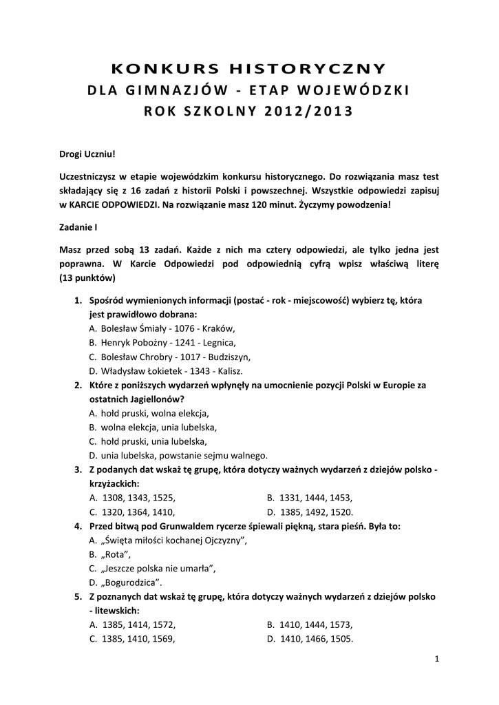 KONKURS HISTORYCZNY DLA GIMNAZJÓW - ETAP WOJEWÓDZKI ROK SZKOLNY 2012/2013 Drogi Uczniu! Uczestniczysz w etapie wojewódzkim konkursu historycznego. Do rozwiązania masz test składający się z 16 zadań z historii Polski i powszechnej. Wszystkie odpowiedzi zapisuj w KARCIE ODPOWIEDZI. Na rozwiązanie masz 120 minut. Życzymy powodzenia! Zadanie I Masz przed sobą 13 zadań. Każde z nich ma cztery odpowiedzi, ale tylko jedna jest poprawna. W Karcie Odpowiedzi pod odpowiednią cyfrą wpisz właściwą literę (13 punktów) 1. Spośród wymienionych informacji (postać - rok - miejscowość) wybierz tę, która jest prawidłowo dobrana: A. Bolesław Śmiały - 1076 - Kraków, B. Henryk Pobożny - 1241 - Legnica, C. Bolesław Chrobry - 1017 - Budziszyn, D. Władysław Łokietek - 1343 - Kalisz. 2. Które z poniższych wydarzeń wpłynęły na umocnienie pozycji Polski w Europie za ostatnich Jagiellonów? A. hołd pruski, wolna elekcja, B. wolna elekcja, unia lubelska, C. hołd pruski, unia lubelska, D. unia lubelska, powstanie sejmu walnego. 3. Z podanych dat wskaż tę grupę, która dotyczy ważnych wydarzeń z dziejów polsko krzyżackich: A. 1308, 1343, 1525, B. 1331, 1444, 1453, C. 1320, 1364, 1410, D. 1385, 1492, 1520. 4. Przed bitwą pod Grunwaldem rycerze śpiewali piękną, stara pieśń. Była to: A. „Święta miłości kochanej Ojczyzny”, B. „Rota”, C. „Jeszcze polska nie umarła”, D. „Bogurodzica”. 5. Z poznanych dat wskaż tę grupę, która dotyczy ważnych wydarzeń z dziejów polsko - litewskich: A. 1385, 1414, 1572, B. 1410, 1444, 1573, C. 1385, 1410, 1569, D. 1410, 1466, 1505. 1 6. Po unii lubelskiej terytorium Rzeczypospolitej Obojga Narodów w stosunku do dzisiejszej Polski było większe: A. dwa razy, B. trzy razy, C. cztery razy, D. pięć razy. 7. Które z podanych przekładów piśmiennictwa nie są typowe dla średniowiecza? A. żywoty świętych i legendy o nich, B. kroniki i hymny religijne, C. roczniki i eposy rycerskie, D. utwory dramatyczne i broszury polityczne. 8. Spośród podanych informacji (osoba - wydarzenie - data - zabór) wybierz tę, która jest prawidłowo zestawiona: A. Tadeusz Kościuszko - bitwa pod Maciejowicami - 10.12.1794 - zabór pruski, B. Piotr Wysocki - obrona Warszawy - 15.08.1831 - zabór rosyjski, C. Edward Dembowski - rabacja galicyjska - 22.02.1846 - zabór austriacki, D. Józef Bem - bitwa pod Ostrołęką - 26.05.1831 - zabór rosyjski. 9. Wybitny Polski malarz przedstawił bardzo realistycznie bohaterstwo Polaków z lat 1861 - 1864. Był to: A. Jan Matejko, B. Juliusz Kossak, C. Artur Grottger, D. Józef Chełmoński. 10. W czasach Rzeczypospolitej szlacheckiej sejm walny składał się z: A. króla, przedstawicieli szlachty i mieszczan, B. króla i przedstawicieli sejmików ziemskich, C. króla, senatu i izby poselskiej, D. króla, przedstawicieli szlachty Polski i Litwy. 11. Który ciąg nazw tego samego państwa jest dobrany poprawnie i chronologicznie? A. Prusy Królewskie - Prusy Zakonne - Królestwo Pruskie, B. Prusy Zakonne - Prusy Książęce - Prusy Krzyżackie, C. Prusy Książęce - Królestwo Pruskie - Prusy Królewskie, D. Prusy Zakonne - Prusy Książęce - Królestwo Pruskie. 12. Do trwałych efektów bitwy pod Grunwaldem zaliczamy: A. odzyskanie przez Polskę ziemi chełmińskiej, B. uzyskanie przez Litwę Żmudzi, C. zniszczenie potęgi militarnej Zakonu, D. terytorialny podział państwa krzyżackiego. 13. Sejmy ratyfikujące rozbiory Polski odbywały się w: A. Piotrkowie, Grodnie, B. Radomiu, Warszawie, C. Warszawie, Lublinie, D. Warszawie, Grodnie. 2 Zadanie II Które z podanych zdarzeń i pojęć są związane z czasami panowania wymienionych władców. W Karcie Odpowiedzi pod odpowiednią cyfrą wpisz właściwą literę, którą oznaczono panującego władcę (14 punktów) Panujący władcy: A. B. C. D. Jadwiga, Władysław Jagiełło, Władysław Warneńczyk, Kazimierz Jagiellończyk, E. Zygmunt Stary, F. Zygmunt August, G. Stefan Batory. Zdarzenia i pojęcia: 1. 2. 3. 4. 5. 6. 7. 8. 9. 10. 11. 12. 13. 14. Hołd lenny księcia Kurlandii Gotarda Kettlera. Ugoda sandomierska. Bitwa pod Orszą. Związek Pruski. Utworzenie Związku Jaszczurczego. Piechota wybraniecka. Zawarcie unii polsko - węgierskiej. Elekcja vivente rege. Flota kaperska. Układ jagiellońsko - habsburski w Wiedniu. Konflikt ze zbuntowanym Gdańskiem. Wojsko kwarciane. Rozejm w Jamie Zapolskim. Unia w Krewie. Zadanie III Które ze stwierdzeń charakteryzujących sarmatyzm są prawdziwe, a które fałszywe? W Karcie Odpowiedzi pod odpowiednimi cyframi wpisz literę „P” (stwierdzenie prawdziwe), literę „F” (stwierdzenie fałszywe) (13 punktów) Sarmatyzm to szlachecki system wartości i styl życia oparty na: 1. 2. 3. 4. 5. 6. 7. naśladowaniu mody włoskiej i francuskiej, teorii starożytnego pochodzenia szlachty polskiej, litewskiej i ruskiej, niechęci do obcych obyczajów i religii innych od katolickiej, idealizowaniu cech monarchii absolutnej, przyswajaniu i rozpowszechnianiu zachodnich wzorców gospodarczych, przywiązaniu do tradycji rodzinnej (model szlachcica ziemianina), rozumieniu znaczenia oświaty i dążeniu do jej szerzenia, 3 8. 9. 10. 11. 12. 13. gościnności, wojowniczości i zaściankowości, dążeniu do równości stanu szlacheckiego i mieszczańskiego, przekonaniu, że szlachta polska jest najlepsza, najsilniejsza i najmądrzejsza, gloryfikacji przywilejów szlacheckich i ustroju Rzeczpospolitej, całkowitym akceptowaniu (zwłaszcza w XVII w.) wyznań wyrosłych z reformacji, przekonaniu o posłannictwie dziejowym narodu szlacheckiego (obrońcy katolickiego świata). Zadanie IV Jakie miejscowości zaznaczono na mapie konturowej podanymi na niej cyframi? W tabelce w Karcie Odpowiedzi obok podanych nazw miejscowości wpisz właściwą cyfrę (21 punktów). Źródło mapy konturowej: S. Jurczak, Historia. Zeszyt ćwiczeń. Kl. II gimnazjum, Toruń 2012. 4 Zadanie V Podanym datom (poza jedną - 1