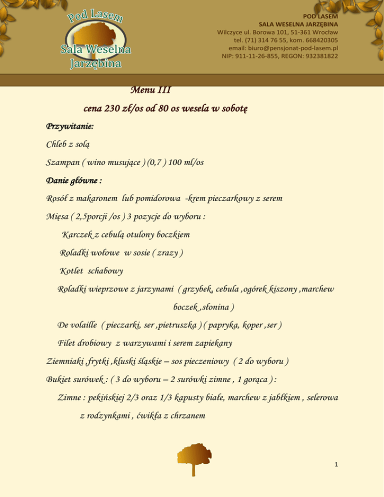 POD LASEM SALA WESELNA JARZĘBINA Wilczyce ul. Borowa 101, 51-361 Wrocław tel. (71) 314 76 55, kom. 668420305 email: [email protected] NIP: 911-11-26-855, REGON: 932381822 Menu III cena 230 zł/os od 80 os wesela w sobotę Przywitanie: Chleb z solą Szampan ( wino musujące ) (0,7 ) 100 ml/os Danie główne : Rosół z makaronem lub pomidorowa -krem pieczarkowy z serem Mięsa ( 2,5porcji /os ) 3 pozycje do wyboru : Karczek z cebulą otulony boczkiem Roladki wołowe w sosie ( zrazy ) Kotlet schabowy Roladki wieprzowe z jarzynami ( grzybek, cebula ,ogórek kiszony ,marchew boczek ,słonina ) De volaille ( pieczarki, ser ,pietruszka ) ( papryka, koper ,ser ) Filet drobiowy z warzywami i serem zapiekany Ziemniaki ,frytki ,kluski śląskie – sos pieczeniowy ( 2 do wyboru ) Bukiet surówek : ( 3 do wyboru – 2 surówki zimne , 1 gorąca ) : Zimne : pekińskiej 2/3 oraz 1/3 kapusty białe, marchew z jabłkiem , selerowa z rodzynkami , ćwikła z chrzanem 1 POD LASEM SALA WESELNA JARZĘBINA Wilczyce ul. Borowa 101, 51-361 Wrocław tel. (71) 314 76 55, kom. 668420305 email: [email protected] NIP: 911-11-26-855, REGON: 932381822 Gorąca: kapusta zasmażana , marchewka z groszkiem ,buraczki zasmażane , w sezonie fasola szparagowa i kalafior Przekąski zimne : Pieczywo Półmisek mięs pieczonych i wędlin Śledź w oleju Ryba po grecku Galaretki wieprzowe lub drobiowe Sałatka z wędzonego kurczaka ,selera, papryki Deska serów Pasztet pieczony oblany galaretką w sosie żurawinowym Kiełbaski w cieście francuskim Schab po warszawsku (jajko , chrzan ,majonez ) Pieczarki nadziewane serkiem czosnkowym Dania gorące : ( 3 pozycje do wyboru ) Barszcz czerwony z pasztecikiem (kapusta ,grzyby ) ( kapusta ,mięso ) lub rożek z ciasta francuskiego z fetą i szynką Beef Strogonow z bagietką Flaczki 2 POD LASEM SALA WESELNA JARZĘBINA Wilczyce ul. Borowa 101, 51-361 Wrocław tel. (71) 314 76 55, kom. 668420305 email: [email protected] NIP: 911-11-26-855, REGON: 932381822 Bigos lub gołąbki Udziec wieprzowy płonący +danie gorące gratis ( bigos lub gulaszowa ) Dodatki : woda niegazowana z cytryną, sok ,napoje gazowane (coca-cola ,sprite) ,kawa ,herbata bez ograniczeń Pokrowce białe na krzesła-gratis Istnieje możliwość poszerzenia pakietu menu: Dodatkowa porcja mięsa do obiadu – 14 zł/os Dodatkowe danie gorące -16 zł/os Strogonow, roladki wołowe – 20 zł/os Ryba z pieca – 20 zł/os Mięsa ,ryby – jako przekąski zimne- 14 zł/os Dania z łososia ( przekąski )-12 zł/os Dodatkowa przekąska zimna, sałatka – 8 zł/os Dodatkowa porcja surówki – 6 zł/os Kawa ,herbata ,ciasto serwowane są na stole kawowym. 3