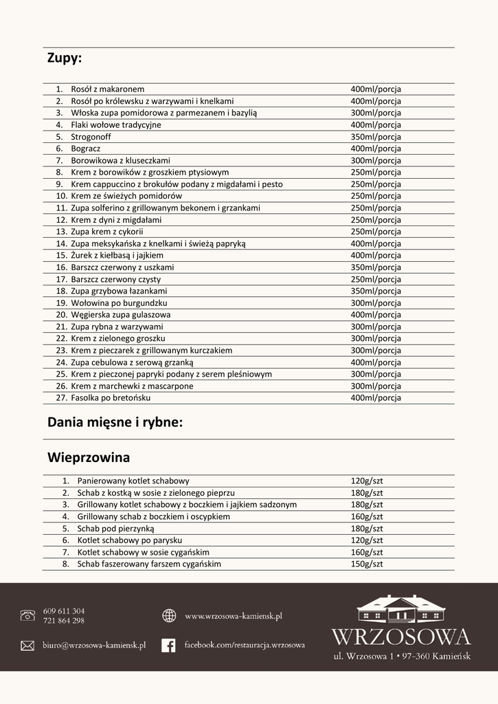 Zupy: 1. 2. 3. 4. 5. 6. 7. 8. 9. 10. 11. 12. 13. 14. 15. 16. 17. 18. 19. 20. 21. 22. 23. 24. 25. 26. 27. Rosół z makaronem Rosół po królewsku z warzywami i knelkami Włoska zupa pomidorowa z parmezanem i bazylią Flaki wołowe tradycyjne Strogonoff Bogracz Borowikowa z kluseczkami Krem z borowików z groszkiem ptysiowym Krem cappuccino z brokułów podany z migdałami i pesto Krem ze świeżych pomidorów Zupa solferino z grillowanym bekonem i grzankami Krem z dyni z migdałami Zupa krem z cykorii Zupa meksykańska z knelkami i świeżą papryką Żurek z kiełbasą i jajkiem Barszcz czerwony z uszkami Barszcz czerwony czysty Zupa grzybowa łazankami Wołowina po burgundzku Węgierska zupa gulaszowa Zupa rybna z warzywami Krem z zielonego groszku Krem z pieczarek z grillowanym kurczakiem Zupa cebulowa z serową grzanką Krem z pieczonej papryki podany z serem pleśniowym Krem z marchewki z mascarpone Fasolka po bretońsku 400ml/porcja 400ml/porcja 300ml/porcja 400ml/porcja 350ml/porcja 400ml/porcja 300ml/porcja 250ml/porcja 250ml/porcja 250ml/porcja 250ml/porcja 250ml/porcja 250ml/porcja 400ml/porcja 400ml/porcja 350ml/porcja 250ml/porcja 350ml/porcja 300ml/porcja 400ml/porcja 300ml/porcja 300ml/porcja 300ml/porcja 400ml/porcja 300ml/porcja 300ml/porcja 400ml/porcja Dania mięsne i rybne: Wieprzowina 1. 2. 3. 4. 5. 6. 7. 8. Panierowany kotlet schabowy Schab z kostką w sosie z zielonego pieprzu Grillowany kotlet schabowy z boczkiem i jajkiem sadzonym Grillowany schab z boczkiem i oscypkiem Schab pod pierzynką Kotlet schabowy po parysku Kotlet schabowy w sosie cygańskim Schab faszerowany farszem cygańskim 120g/szt 180g/szt 180g/szt 160g/szt 180g/szt 120g/szt 160g/szt 150g/szt Strona 1 z 6 9. 10. 11. 12. 13. 14. 15. 16. 17. 18. 19. 20. 21. 22. 23. 24. 25. 26. 27. 28. 29. 30. 31. 32. 33. 34. Pieczona golonka po bawarsku Gotowana golonka z warzywami po zbójnicku Żeberko pieczone w polewie miodowo winnej Żeberko duszone w sosie Pieczeń z karczku w sosie własnym Pieczeń z karczku w sosie grzybowym Karczek grillowany Kotlet mielony z pieczarką Kotlet mielony z mozzarellą Kebab na patyku Sakiewka ze schabu faszerowana warzywami Sakiewka ze schabu z farszem pieczarkowo serowym Polędwiczki wieprzowe w sosie borowikowym Polędwiczki wieprzowe w sosie cztery sery Warkocz z polędwiczki wieprzowej w sosie kurkowym Szaszłyk wieprzowy Zraz wieprzowy w sosie pieczeniowym Eskalopki w sosie Rumsztyk z duszoną cebulką Tornado z polędwiczki wieprzowej z bekonem duszone w czerwonym winie Sznycel z polędwiczki wieprzowej z sałatką wiosenną Polędwiczka wieprzowa faszerowana gorgonzolą w sosie tymiankowym Eskalopki z polędwiczki wieprzowej w sosie z zielonego pieprzu Udziec wieprzowy pieczony w całości Bigos staropolski Gołąbki w sosie pomidorowym 100g/wg 100g/wg 100g/wg 100g/wg 180g/szt 180g/szt 150g/szt 130g/szt 130g/szt 130g/szt 140g/szt t. 140g/sz. 180g/sz. 180g/sz. 200g/sz. 180g/sz. 180g/sz. 160g/sz. 140g/sz. 180g/szt. 180g/szt. 140g/szt. 180g/szt. 180g/szt. 180g/szt. 1 kg/wg Drób 1. 2. 3. 4. 5. 6. 7. 8. 9. 10. 11. 12. 13. 14. 15. Duszone płatki kurczaka w kwaśnej śmietanie i kurkach Filet z kurczaka po parysku Filet panierowany z kurczaka Filet grillowany z masłem czosnkowym Filet grillowany w sosie Indyk faszerowany pieczony w całości Filet faszerowany warzywami z sosie Filet faszerowany mozzarellą i suszonymi pomidorami z sosie Filet faszerowany szpinakiem i fetą z sosem Filet faszerowany twarożkiem z rzodkiewką i szczypiorkiem Devolay z serem i masłem Devolay z masłem i koperkiem Roladka z fetą i brokułem Szaszłyk drobiowy Eskalopki drobiowe zapiekane z ananasem i serem 250g/porcja 130g/porcja 130g/porcja 150g/porcja 180g/porcja 1 kg/wg 180g/porcja 180g/porcja 180g/porcja 180g/porcja 140g/porcja 140g/porcja 140g/porcja 180g/porcja 160g/porcja Strona 2 z 6 16. 17. 18. 19. 20. 21. 22. Kurczak pieczony w piwie Udko pieczone Udko faszerowane mięsem Cordon blue z indyka Filet z indyka panierowany w sezamie Filet faszerowany łososiem Kaczka pieczona podana w sosie owocowym sosy do drobiu – tymiankowy, cztery sery, paprykowy, kaparowy, Pesto, beszamelowy, grzybowy, malinowy, morelowy. beszamelowy, grzybowy, malinowy, morelowy. 100g/wg 100g/wg 100g/wg 150g/porcja 150g/porcja 150g/porcja 100g/wg Wołowina 1. 2. 3. 4. Zraz wołowy w sosie pieczeniowym Rumsztyk wołowy z cebulą Bitki wołowe w sosie grzybowym Gulasz wołowy 180g/porcja 160g/porcja 180g/porcja 250g/porcja Ryby 1. 2. 3. 4. 5. 6. 7. 8. 9. 10. 11. 12. Pstrąg pieczony w piecu z masłem czosnkowym Pieczony sandacz podany na puree z brokułów Sandacz z sosem porowym Sola podana na maśle czosnkowym Pieczony karp dzwonko Łosoś pod pierzynką szpinakową Łosoś w sosie cytrynowym podany na szpinaku i suszonych pomidorach Łosoś z sosem śmietanowo – serowym Łosoś z sosem kaparowym lub kurkowym Łosoś pod kruszonką ziołową Pieczona miruna w cieście naleśnikowym Śledź w cieście w zalewie octowej 100g/wg 100g/wg 100g/wg 100g/wg 100g/wg 100g/wg 100g/wg 100g/wg 100g/wg 100g/wg 100g/wg 100g/wg Dania mączne 1. 2. 3. 4. 5. 6. 7. 8. 9. 10. Pierogi z kapustą i grzybami Pierogi z mięsem Pierogi z kaszą gryczaną i twarogiem Pierogi ze szpinakiem i fetą Pierogi ruskie Pierogi z serem Pierogi włoskie mozzarella, bazylia świeża, szynka, parmezan, pomidory suszone. Krokiety z kapustą i grzybami Krokiety z mięsem 1kg/wg 1kg/wg 1kg/wg 1kg/wg 1kg/wg 1kg/wg 350g/porcja 1kg/wg 1kg/wg 1kg/wg Strona 3 z 6 11. 12. 13. 14. 15. Krokiety z pieczarką i żółtym serem Paszteciki z mięsem Pierożki drożdżowe z kapustą i grzybami Pierożki drożdżowe z mięsem Uszka z kapustą i grzybami 1kg/wg 1kg/wg 1kg/wg 1kg/wg 1kg/wg Dodatki 1. 2. 3. 4. 5. 6. 7. 8. 9. 10. 11. Ziemniaki z wody z koprem Ziemniaki zapiekane Frytki Kluski śląskie Kopytka Kluski półfrancuskie Ryż Ryż z warzywami Makaron pene Kasza gryczana Kasza jaglana Sosy na zimno do dodatków: tatarski, czosnkowy, tzatziki, chrzanowy, ż