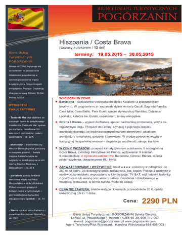 Rozwiązania informatyczne Hiszpania / Costa Brava (wczasy autokarem / 12 dni) B iu r o Us ł ug T ur ys t yc zn yc h terminy: 19.05.2015 – 30.05.2015 PO G Ó RZ A NI N Istnieje od 15 lat, legitymuje się zezwoleniem na prowadzenie działalności gospodarczej w zakresie prowadzenia imprez turystycznych w Polsce i krajach europejskich. Posiada Gwarancję Ubezpieczeniową SIGNAL IDUNA Polska TU S.A. WYCIECZKI W CENIE: Barcelona – całodzienna wycieczka do stolicy Katalonii (z przewodnikiem WYCIECZKI lokalnym). W programie m.in. wspaniałe dzieła Antonia Gaudi: Sagrada Familia, F AK U L T A T Y W N E : Casa Mila, Casa Batllo, Park Guell; spacer słynną ulicą Ramblas, Dzielnica - Tossa de Mar rejs statkiem ze Łacińska, katedra św. Eulalii, oceanarium, tereny olimpijskie. szklanym dnem do zabytkowego Girona i Blanes – wyjazd do Blanes, spacer nadmorską promenadą, wizyta na miasteczka Tossa de Mar, spacer regionalnym targu. Przejazd do Girony, słynącej z pięknego zespołu po starówce, zwiedzanie XVwiecznych pozostałości pałacu architektonicznego, ze średniowiecznymi murami obronnymi i obiektami gubernatora – ok. 22 € architektury romańskiej, gotyckiej i barokowej. W drodze powrotnej wizyta w tradycyjnej hiszpańskiej winiarni – degustacja, możliwość zakupu trunków. - Montserrat – średniowieczny klasztor Benedyktynów, położony w masywie górskim - święte miejsce Katalończyków ze względu na znajdującą się w nim W CENIE WCZASÓW: przejazd klimatyzowanym autokarem, 9 noclegów na Costa Brava, 2 noclegi tranzytowe we Francji, wyżywienie: 9 śniadań, 9 obiadokolacji, 2 wycieczki autokarowe: Barcelona, Girona i Blanes, opieka pilota-rezydenta, ubezpieczenie KL i NNW rzeźbę Czarnej Madonny z Dzieciątkiem – ok. 25 € - Barcelona (pokaz fontann) wieczorna wizyta na Placu Hiszpańskim w stolicy Katalonii. Pokaz słynnych grających fontann, które w rytm muzyki i przy świetle laserów tworzą niezapomniany spektakl – ok. 10 € ZAKWATEROWANIE I WYŻYWIENIE: hotel ★★★★, położony w odległości do 250 m od plaży. Do dyspozycji gości; restauracja, bar, basen. Pokoje 2-osobowe z możliwością dostawki, wyposażone w klimatyzację, TV-SAT, sejf, telefon, łazienkę z prysznicem lub wanną oraz własny balkon. Śniadania i obiadokolacje w hotelowej restauracji, w formie bufetu, woda do kolacji. CENA NIE ZAWIERA: biletów wstępu i lokalnych przewodników 23 €, opłaty klimatycznej 0,5 € / 1 doba. Cena: 2290 PLN - Siesta – pokaz tańca flamenco i prawdziwa hiszpańska biesiada – ok. 39 € Biuro Usług Turystycznych POGÓRZANIN Sylwia Cierpisz Łańcut, ul. Piłsudskiego 4, telefon 17/255-69-38, 606-710-007 e-mail: [email protected] www.pogorzanin.com Agent Terenowy/Pilot Wycieczek : Karolina Wiśniowska 694-436-003