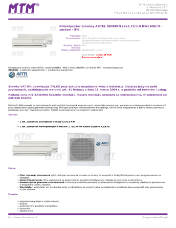 MTM Dariusz Seferyński ul. Młodnicka 52 C 04-239 Warszawa +48 22 353-11-11, 353-22-22, fax. 879-83-83 Klimatyzator ścienny ARTEL SKM9RN (2x2,75/3,0 KW) MULTI zestaw - 8% Producent: Artel Zastosowanie: Biuro,Dom,Firma,Hala produkcyjna,Lokale usługowe,Mieszkanie,Pomieszczenia inne,Pomieszczenia socjalne,Pracownia,Warsztat Wysyłka / termin 24h realizacji: Rodzaj urządzenia: Klimatyzator ścienny Cena brutto: 2 625,48 PLN Cena promocyjna Klimatyzator ścienny marki ARTEL, model SKM9RN - MULTI DUAL ON/OFF; (2,75/3,00 KW) - chłodzenie/grzanie. ZESTAW - 2 jednostki wewnętrzne + 1 jednostka zewnętrzna. Stawka VAT 8% obowiązuje TYLKO przy zakupie urządzenia wraz z instalacją. Dotyczy jedynie osób prywatnych, spełniających warunki art. 41 Ustawy z dnia 11 marca 2004 r. o podatku od towarów i usług. Podana cena NIE ZAWIERA kosztów montażu. Koszty montażu ustalane są indywidualnie, w zależności od potrzeb Klienta. Multisplit SKM pozwala na zainstalowanie wiekszej ilości jednostek wewnętrznych z jednostką zewnętrzną - pozwala na schładzanie dwóch pomieszczeń przy zastosowaniu jednej jednostki zewnętrznej. SKM jest idealnym klimatyzatorem dla każdego, kto nie chce zrezygnować z dobrej jakości powietrza, posiadając przy tym oryginalny produkt. Dodaje wystrojowi wnętrza elegancji i osobowości. Zestaw: 1 szt. jednostka zewnętrzna o mocy 5,5/6,0 KW 2 szt. jednostek wewnętrznych o mocach 2,75/3,0 KW każda (łącznie 5,5/6,0) Cechy: Pilot zdalnego sterowania: pilot zdalnego sterowania pozwala na dostęp do wszystkich funkcji klimatyzatora oraz programowanie na odległość. Łatwa konserwacja: filtry usytuowane są pod przednim panelem klimatyzatora i dlatego są one łatwe w demontażu. Automatyczne ponowne uruchamianie: ta funkcja umożliwia ponowne uruchamianie klimatyzatora z wcześniej ustalonymi parametrami w przypadku spadku napięcia. Wentylator: wentylator ten jest bardzo cichy w odniesieniu do innych typów wentylatorów i umożliwia dużą wydajność przy ograniczonej liczbie obrotów. Funkcje: optymalna regulacja w trybie nocnym grzanie automatyczna prędkość wentylatora osuszanie odszranianie http://www.firmamtm.pl Program AptusShop6 MTM Dariusz Seferyński ul. Młodnicka 52 C 04-239 Warszawa +48 22 353-11-11, 353-22-22, fax. 879-83-83 programator czasowy chłodzenie automatyczne wyłączanie i włączanie automatyczna temperatura i wilgotność nawiew wahadłowy potrójna prędkość wentylatora DANE TECHNICZNE MODELU ARTEL SKM9RN Moc chłodnicza 5491 W Moc grzewcza 6003 W Efektywność energetyczna chłodzenie EER 3,02 Efektywność energetyczna grzanie COP 3,41 Kondensat 1,2 x 2 l/h Przepływ powietrza (maks.) 450 m3/h Poziom hałasu jednostka wewnętrzna - maksymalny 37 dB Poziom hałasu jednostka zewnętrzna - maksmalny 57 dB Zasilanie 220~240V/50Hz Pobór mocy chłodzenie 1818 W Pobór mocy grzanie 1760 W Wymiary jednostka wewnętrzna (szer. x wys. x gł.) 770 x 250 x 180 mm Wymiary jednostka zewnętrzna (szer.x wys. x gł.) 1000 x 700 x 340 mm Waga jednostka wewnętrzna 8,5 kg Waga jednostka zewnętrzna 65 kg Czynnik chłodniczy R407 NA TERENIE WARSZAWY PROMOCYJNE CENY NA MONTAŻ KLIMATYZACJI Montaż podstawowy tylko 800 zł. netto!!! ZADZWOŃ I UMÓW SIĘ NA OGLĘDZINY Z TECHNIKIEM. http://www.firmamtm.pl Powered by TCPDF (www.tcpdf.org) Program AptusShop6