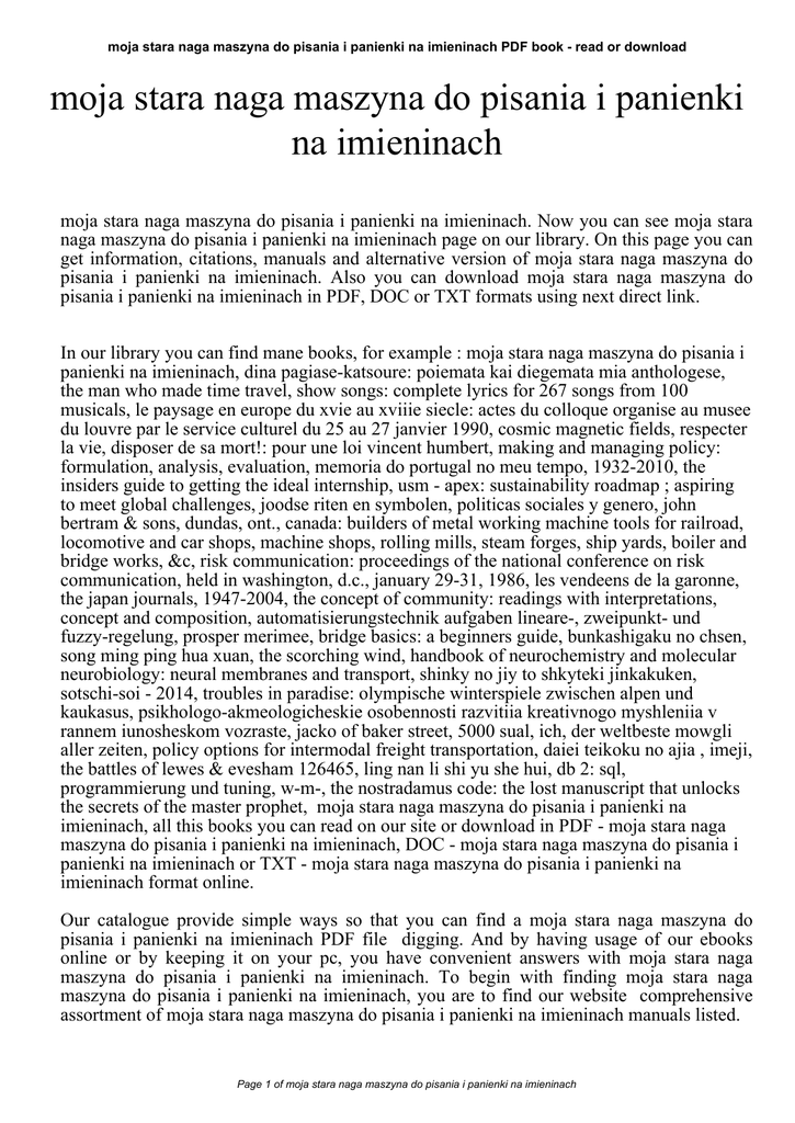 moja stara naga maszyna do pisania i panienki na imieninach PDF book - read or download moja stara naga maszyna do pisania i panienki na imieninach moja stara naga maszyna do pisania i panienki na imieninach. Now you can see moja stara naga maszyna do pisania i panienki na imieninach page on our library. On this page you can get information, citations, manuals and alternative version of moja stara naga maszyna do pisania i panienki na imieninach. Also you can download moja stara naga maszyna do pisania i panienki na imieninach in PDF, DOC or TXT formats using next direct link. In our library you can find mane books, for example : moja stara naga maszyna do pisania i panienki na imieninach, dina pagiase-katsoure: poiemata kai diegemata mia anthologese, the man who made time travel, show songs: complete lyrics for 267 songs from 100 musicals, le paysage en europe du xvie au xviiie siecle: actes du colloque organise au musee du louvre par le service culturel du 25 au 27 janvier 1990, cosmic magnetic fields, respecter la vie, disposer de sa mort!: pour une loi vincent humbert, making and managing policy: formulation, analysis, evaluation, memoria do portugal no meu tempo, 1932-2010, the insiders guide to getting the ideal internship, usm - apex: sustainability roadmap ; aspiring to meet global challenges, joodse riten en symbolen, politicas sociales y genero, john bertram & sons, dundas, ont., canada: builders of metal working machine tools for railroad, locomotive and car shops, machine shops, rolling mills, steam forges, ship yards, boiler and bridge works, &c, risk communication: proceedings of the national conference on risk communication, held in washington, d.c., january 29-31, 1986, les vendeens de la garonne, the japan journals, 1947-2004, the concept of community: readings with interpretations, concept and composition, automatisierungstechnik aufgaben lineare-, zweipunkt- und fuzzy-regelung, prosper merimee, bridge basics: a beginners guide, bunkashigaku no chsen, song ming ping hua xuan, the scorching wind, handbook of neurochemistry and molecular neurobiology: neural membranes and transport, shinky no jiy to shkyteki jinkakuken, sotschi-soi - 2014, troubles in paradise: olympische winterspiele zwischen alpen und kaukasus, psikhologo-akmeologicheskie osobennosti razvitiia kreativnogo myshleniia v rannem iunosheskom vozraste, jacko of baker street, 5000 sual, ich, der weltbeste mowgli aller zeiten, policy options for intermodal freight transportation, daiei teikoku no ajia , imeji, the battles of lewes & evesham 126465, ling nan li shi yu she hui, db 2: sql, programmierung und tuning, w-m-, the nostradamus code: the lost manuscript that unlocks the secrets of the master prophet, moja stara naga maszyna do pisania i panienki na imieninach, all this books you can read on our site or download in PDF - moja stara naga maszyna do pisania i panienki na imieninach, DOC - moja stara naga maszyna do pisania i panienki na imieninach or TXT - moja stara naga maszyna do pisania i panienki na imieninach format online. Our catalogue provide simple ways so that you can find a moja stara naga maszyna do pisania i panienki na imieninach PDF file digging. And by having usage of our ebooks online or by keeping it on your pc, you have convenient answers with moja stara naga maszyna do pisania i panienki na imieninach. To begin with finding moja stara naga maszyna do pisania i panienki na imieninach, you are to find our website comprehensive assortment of moja stara naga maszyna do pisania i panienki na imieninach manuals listed. Page 1 of moja stara naga maszyna do pisania i panienki na imieninach moja stara naga maszyna do pisania i panienki na imieninach PDF book - read or download These review site is the biggest of these that have hundreds of thousands of different literally products represented. So as to there are specific sites catered to different product also types or categories, niche categories or brands related to moja stara naga maszyna do pisania i panienki na imieninach. So depending on what exactly you are searching, you will be in a position to choose ebooks moja stara naga maszyna do pisania i panienki na imieninach to suit your own needs, moja stara naga maszyna do pisania i panienki na imieninach. Page 2 of moja stara naga maszyna do pisania i panienki na imieninach