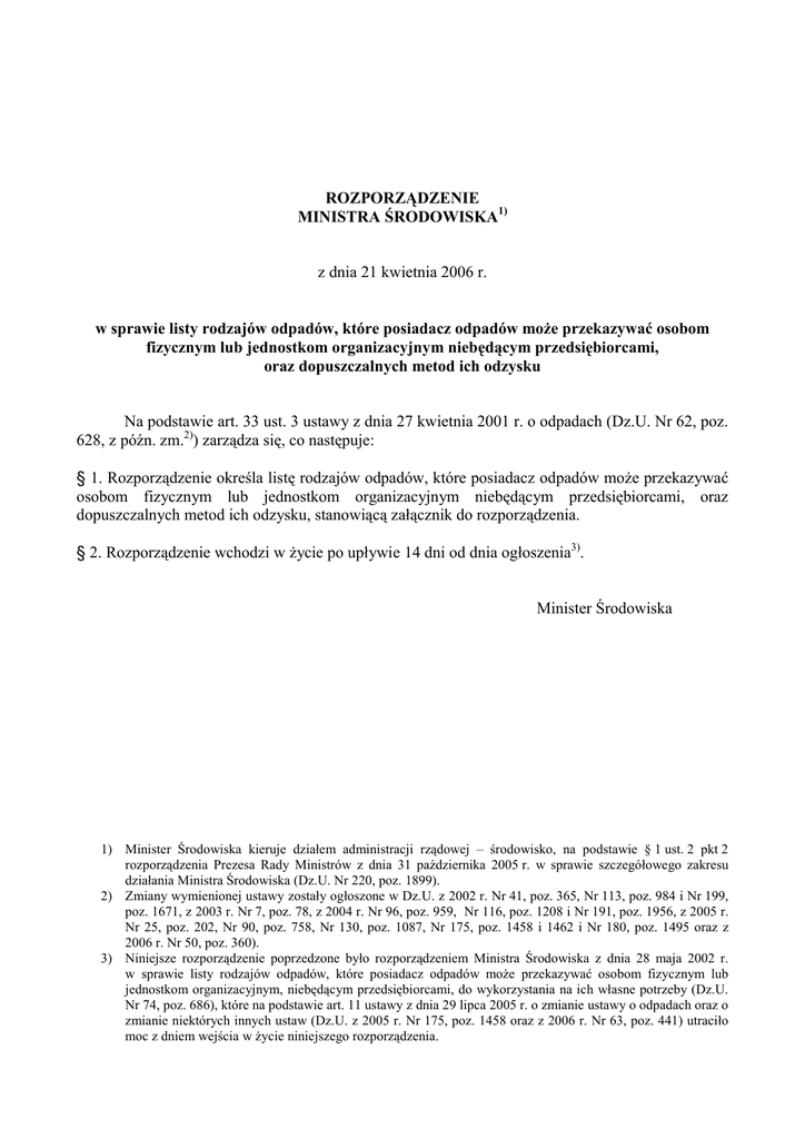 ROZPORZĄDZENIE MINISTRA ŚRODOWISKA1) z dnia 21 kwietnia 2006 r. w