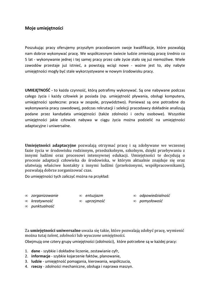 Moje umiejętności Poszukując pracy oferujemy przyszłym pracodawcom swoje kwalifikacje, które pozwalają nam dobrze wykonywać pracę. We współczesnym świecie ludzie zmieniają pracę średnio co 5 lat - wykonywanie jednej i tej samej pracy przez całe życie stało się już niemożliwe. Wiele zawodów przestaje już istnieć, a powstają wciąż nowe - ważne jest to, aby nabyte umiejętności mogły być stale wykorzystywane w nowym środowisku pracy. UMIEJĘTNOŚĆ - to każda czynność, którą potrafimy wykonywać. Są one nabywane podczas całego życia i każdy człowiek je posiada (np. umiejętność pływania, obsługi komputera, umiejętności społeczne: praca w zespole, przywództwo). Ponieważ są one potrzebne do wykonywania pracy zawodowej, podczas rekrutacji i selekcji pracodawcy dokładnie analizują podane przez kandydata umiejętności (także zdolności i cechy osobowe). Wszystkie umiejętności jakie człowiek nabywa w ciągu życia można podzielić na umiejętności adaptacyjne i uniwersalne. Umiejętności adaptacyjne pozwalają otrzymać pracę i są zdobywane we wczesnej fazie życia w środowisku rodzinnym, przedszkolnym, szkolnym, dzięki przebywaniu z innymi ludźmi oraz procesowi intensywnej edukacji. Umiejętności te decydują o procesie adaptacji człowieka do środowiska, w którym aktualnie znajduje się oraz ułatwiają właściwe kontakty z innymi ludźmi (przełożonymi, współpracownikami), pozwalają dobrze zorganizować czas. Do umiejętności tych zaliczyć można na przykład: • • • zorganizowanie kreatywność punktualność • • entuzjazm uprzejmość • • odpowiedzialność pomysłowość Za umiejętności uniwersalne uważa się takie, które pozwalają zdobyć pracę, wymienić można tutaj talent, zdolności lub wyuczone umiejętności. Obejmują one cztery grupy umiejętności (zdolności), które potrzebne są w każdej pracy: 1. 2. 3. 4. dane - szybkie i dokładne liczenie, zestawianie cyfr, informacje - szybkie kojarzenie faktów, planowanie, ludzie - umiejętność pomagania, kierowania, współczucia, rzeczy - zdolności mechaniczne, obsługa i naprawa maszyn. Przykłady umiejętności uniwersalnych: 1. szybkość i dokładność, 2. planowanie, 3. zdolności kierowania innymi, 4. umiejętności łatwego wysławiania się, 5. umiejętności obsługi i naprawy maszyn, 6. czytanie, pisanie, liczenie. ZDOLNOŚĆ - to możliwość szybkiego zdobycia umiejętności (np. obsługi komputera, itp.). Ludzie mają różne umiejętności i różne uzdolnienia. Osoby, które wykorzystują swoje umiejętności podczas poszukiwania pracy, mają większą pewność, że osiągną sukces. KWALIFIKACJE - zdobywane są w procesie uczenia się, są to umiejętności potwierdzone odpowiednim dyplomem, kwalifikującym do wykonywania konkretnej pracy - konkretnego zawodu. Często są unikatowe i przydatne tylko w jednej pracy. Przykłady kwalifikacji: znajomość anatomii, księgowość, gotowanie, pieczenie, marketing, obsługa konkretnego urządzenia, pilotaż wycieczek zagranicznych, ratownik. ĆWICZENIE : Spróbuj zakwalifikować się do jednej z sześciu różnych grup: (ludzie z tej grupy mają uzdolnienia sportowe lub zdolności manualne, lubią pracować mając do czynienia z przedmiotami, maszynami, narzędziami lub zwierzętami, roślinami lub wolą pracować na wolnym powietrzu). 2. SPOŁECZNA (ludzie z tej grupy lubią pracować z ludźmi, informować, wyjaśniać, pomagać, szkolić, wychowywać, uczyć, mają uzdolnienia związane z posługiwaniem się słowami) 3. BADAWCZA (ludzie z tej grupy lubią obserwować, uczyć się, badać, analizować, oceniać lub rozwiewać problemy) 1. REALISTYCZNA 4. PRZEDSIĘBIORCZA (ludzie z tej grupy lubią pracować z ludźmi - mieć wpływ na nich lubią występować publicznie, chcą być przywódcami lub chcą zarządzać dla osiągnięcia zysku lub celów wyznaczonych przez organizację) 5. ARTYSTYCZNA (ludzie z tej grupy mają uzdolnienia artystyczne, są innowacyjni i obdarzeni intuicją; lubią pracować w nieschematycznych sytuacjach, używają wyobraźni i możliwości twórczych) 6. KONWENCJONALNA (ludzie z tej grupy lubią mieć do czynienia z danymi lubią pisać lub obliczać, wykonywać prace zwracając uwagę na szczegóły, lub kierując się instrukcjami innych osób) Z każdą grupą związany jest odpowiedni typ osobowości, określony przez charakterystyczne dla niej cechy psychiczne. REALISTA (rzeczy) Typowi realistycznemu odpowiadają realistyczne zawody, takie jak: pilot, stolarz, technik, inżynier, operator radiowy, kreślarz, optyk, leśnik, mechanik samochodowy, rolnik, elektryk, kierowca, ślusarz, spawacz - często brakuje mu jednak umiejętności społecznych. Określany jest jako: prostolinijny Skromny praktyczny uczciwy naturalny nieśmiały trzeźwo myślący pokorny gospodarny szczery zasadniczy cierpliwy materialista wytrwały pracowity Osobę tę cechuje: niezależność, praktycyzm, sprawność fizyczna, przebojowość, konserwatyzm, fizyczna koordynacja, siła, logika, preferuje ona wykorzystywanie zmysłów wzroku i dotyku. Osoba ta lubi: napięcia, podejmowanie ryzyka, pracę na świeżym powietrzu, konkretne problemy, pieniądze, posługiwać się narzędziami i maszynami. TYP BADAWCZY (informacje) Typowi badawczemu odpowiadają takie zawody badawcze jak: biolog, fizyk, matematyk, geolog, meteorolog, agent ubezpieczeniowy, programista, ekonomista, laborant, lekarz często brakuje mu zdolności przyrodniczych. Określany jest jako: Niezwykły skromny ostrożny niezależny pesymista analityczny intelektualista dokładny złożony skierowany na siebie racjonalny krytyczny metodyczny odnoszący się z rezerwą Osobę te cechuje: niezależność, ciekawość świata, intelektualizm, chęć analizowania swoich myśli i uczuć, brak tradycjonalizmu. Osoba taka korzysta z zasobu informacji, posiada swoiste powiązania z ludźmi, rzeczami, stosuje przyr