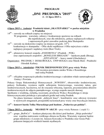 PROGRAM „DNI PRUDNIKA ’2015” 4 - 11 lipca 2015 r. 4 lipca 2015 r. (sobota) Prudnicki dzień „SKATEPARKU” w parku miejskim w Prudniku 00 14 – zawody na rolkach (zapisy na miejscu) W programie; warsztaty, zabawy i konkurencje sportowe na rolkach dla najmłodszych, oraz dla młodzieży, pokazy najlepszych rolkarzy i zaproszonych gości zawodów podczas dnia Skateparku 30 16 – zawody na deskorolce (zapisy na miejscu od godz. 1400) konkurencja w skateparku – Ollie skoki najdłuższe i Ollie najwyższe a także najlepszy przejazd i najdalszy trick (Best Trick). 1900 – plenerowy koncert zespołu „ENDORFINA” (Prudnik – POK) oraz zaproszonych zespołów: „BONELESS BRIGADE” – hardcore punk (Brzeg), „EPITAFIUM” – heavy matal (Głuchołazy) Organizator: PRUDNIK 3 DESKOROLKA, EWP-ROLKA oraz Marek Bień - Prudnicki Ośrodek Kultury. 5 lipca 2015 r. (niedziela) PIKNIK ŚREDNIOWIECZNY przy wieży Woka 760 rocznica powstania zamku Woka z Rosenberga nad rzeką Prudnik 1300 – oficjalne rozpoczęcie pikniku średniowiecznego z udziałem władz samorządowych Gminy i Powiatu. Pokazy Grupy Rekonstrukcji Historycznych „WIWERN”, obozowisko średniowieczne, pokazy fechtunku, wystawa replik uzbrojenia historycznego, warsztaty tańca, gier średniowiecznych, łucznictwa, tor do rzucania włócznią, toporem, przymierzalnia ubiorów średniowiecznych do zdjęcia pamiątkowego, występ zespołu muzyki dawnej. Spotkanie z wiedźmą, zielarką, rycerzami, przybycie Woka z Rosenberga w stroju historycznym,mini prelekcja o początkach grodu nad rzeką Prudnik. Na placu kiermasz zielarski „dobrych braci”- bonifratrów oraz zdrowej żywności w stylowych straganach, przejażdżki na koniach przy wieży oraz bryczką po mieście. 1800 – koncert barda Tolka Murackiego pod hasłem: „Nohavica po polsku”. 7 lipca 2015 r. (wtorek) MŁODZI W AKCJI – przy wieży Ratusza ( część I ) 1330 – grupa „BoPoCo” – konkurs plastyczny dla dzieci pod hasłem: „Moje podwórko” oraz wspólne malowanie wielkiego obrazu na Rynku. Warsztaty wspierać będzie grupa młodzieży z Liceum im. Janusza Korczaka w Prudniku oraz Gosia Ptak pokazem latających wielkich baniek mydlanych. 1530 – pokazy gry na bębnach afrykańskich dla dzieci, nauka gry oraz wspólne granie na prudnickim Rynku. 1700 – warsztaty Djambe - wspólna gra na bębnach afrykańskich prowadzona przez Stowarzyszenie Ludzi Twórczych, na zakończenie koncert na bębnach afrykańskich przy wieży Ratusza. 1800 – wykład historyczny w Muzeum Ziemi Prudnickiej poprowadzony przez dr Wojciecha Dominiaka – pod hasłem „Początki grodu nad rzeką Prudnik – najstarsze średniowieczne zabytki w zbiorach Muzeum Ziemi Prudnickiej” (od godz. 1700 możliwość bezpłatnego zwiedzenia wystawy „Trzy źródła – jedno miasto” w Muzeum Ziemi Prudnickiej). 8 lipca 2015 r. (środa) DZIEŃ TURYSTYCZNY ››aktywność - rekreacja – krajoznawstwo – regionalizm‹‹ 1600 – 1800 Zwiedzanie miasta z przewodnikiem - „ Szlakami historii miasta-rajd czterech wież” – zbiórka przy Wieży Woka. Trasa: Wieża Woka – wieża ratuszowa – wieża kościoła pw. Św. Michała Archanioła – Wieża Katowska (w grupach co 1/2 godz.) 1700 – 1900 „Rajd rowerowy po Ziemi Prudnickiej” - prowadzony przez Przodownika Turystyki Kolarskiej kol. Andrzeja Białopotockiego – zakończenie przy pałacu Fränkla 1700 – 1930 „Nordic Walking od pomnika Jana Pawła II do pomnika Stefana Wyszyńskiego” - marsz z kijami poprzedzony instruktażem techniki Nordinc Walking prowadzony przez Leszka Gapińskiego. Zbiórka przy kościele Miłosierdzia Bożego g. 17:00 – a zakończenie przy pałacu Fränkla. Wpisowe na rajd „czterech wież” - 5,00 zł zawiera: plakietkę okolicznościową, usługę przewodnicką. Zapisy osób chętnych do zwiedzania w biurze POK przy ul. Kościuszki 1 A do dnia 3 lipca 2015 r. 2000 – ogród POK – „Ciekawe miejsca wypraw prudnickich turystów” – prezentacja multimedialna przygotowana przez Instruktora Krajoznawstwa Regionu, Przodownika Turystyki Górskiej Józefa Hupkę oraz wspólne śpiewanie piosenek turystycznych z udziałem zaproszonych bardów piosenki turystycznej min. Marka Sołtysiaka z zespołem. 9 lipca 2015 r. (czwartek) 1700 – „Złoty wiek Prudnika” – wykład historyczny w Prudnickim Ośrodku Kultury z projekcją slajdów o ludziach, wydarzeniach, działalności ekonomicznej i altruistycznej, która doprowadziła do rozkwitu miasta i jego mieszkańców – prowadzony przez mgr Marcina Husaka. 10 – 11 lipca 2015 r. (piątek - sobota) DNI SPORTU 10 lipca 2015 r. (piątek) 1000 – siatkówka plażowa (basen odkryty) - organizator OSiR Prudnik 1000 – tenis ziemny single (park) - organizator OSiR Prudnik (początek zawodów) 10 lipca 2015 r. (piątek) MŁODZI W AKCJI – przy wieży Ratusza ( część II ) 1400 – „Jeam Session Prudnik” – otwarte zawody tańca hip hopu oraz break dance na prudnickim Rynku poprowadzone przez „Hip Hop Buda” – Krzysztofa Sorodnika, warsztaty taneczne. Otwarty pokaz parkour poprowadzony przez sekcję Parkour i Freerun Stowarzyszenia Sportowego Tigers oraz zawody Speed Contest (pokonanie wyznaczonej trasy z przeszkodami). 11 lipca 2015 r. (sobota) 1000 – „Streetbal” - koszykówka uliczna przy wieży Ratusza - organizator OSiR 1600 – turniej piłki nożnej „30 lat minęło” („Orlik” – park) - organizator OSiR Prudnik 11 lipca 2015 r. (sobota) „ŚWIĘTO MŁODOŚCI I MUZYKI” 1800 - Z.B.U.K.U. – koncert prudnickiego rapera Michała Buczka. 2000 - Enej - polski zespół wykonujący muzykę z pogranicza folku, ska i szeroko pojętej alternatywy. 00 22 - Sylwia Grzeszczak – wokalistka, kompozytorka i autorka tekstów wraz z zespołem Zakończenie imprezy około godz. 2330. Na prudnickim Rynku stanowiska gastronomiczne,garmażeryjne,rozrywkowe,handlowe itp.
