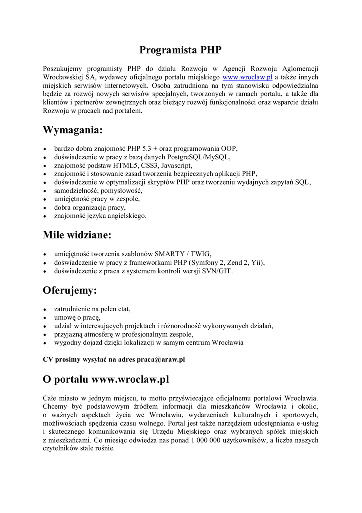 Programista PHP Poszukujemy programisty PHP do działu Rozwoju w Agencji Rozwoju Aglomeracji Wrocławskiej SA, wydawcy oficjalnego portalu miejskiego www.wroclaw.pl a także innych miejskich serwisów internetowych. Osoba zatrudniona na tym stanowisku odpowiedzialna będzie za rozwój nowych serwisów specjalnych, tworzonych w ramach portalu, a także dla klientów i partnerów zewnętrznych oraz bieżący rozwój funkcjonalności oraz wsparcie działu Rozwoju w pracach nad portalem. Wymagania: bardzo dobra znajomość PHP 5.3 + oraz programowania OOP, doświadczenie w pracy z bazą danych PostgreSQL/MySQL, znajomość podstaw HTML5, CSS3, Javascript, znajomość i stosowanie zasad tworzenia bezpiecznych aplikacji PHP, doświadczenie w optymalizacji skryptów PHP oraz tworzeniu wydajnych zapytań SQL, samodzielność, pomysłowość, umiejętność pracy w zespole, dobra organizacja pracy, znajomość języka angielskiego. Mile widziane: umiejętność tworzenia szablonów SMARTY / TWIG, doświadczenie w pracy z frameworkami PHP (Symfony 2, Zend 2, Yii), doświadczenie z praca z systemem kontroli wersji SVN/GIT. Oferujemy: zatrudnienie na pełen etat, umowę o pracę, udział w interesujących projektach i różnorodność wykonywanych działań, przyjazną atmosferę w profesjonalnym zespole, wygodny dojazd dzięki lokalizacji w samym centrum Wrocławia CV prosimy wysyłać na adres [email protected] O portalu www.wroclaw.pl Całe miasto w jednym miejscu, to motto przyświecające oficjalnemu portalowi Wrocławia. Chcemy być podstawowym źródłem informacji dla mieszkańców Wrocławia i okolic, o ważnych aspektach życia we Wrocławiu, wydarzeniach kulturalnych i sportowych, możliwościach spędzenia czasu wolnego. Portal jest także narzędziem udostępniania e-usług i skutecznego komunikowania się Urzędu Miejskiego oraz wybranych spółek miejskich z mieszkańcami. Co miesiąc odwiedza nas ponad 1 000 000 użytkowników, a liczba naszych czytelników stale rośnie.