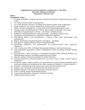 Zagadnienia na egzamin dyplomowy magisterski w roku 2016 Kierunek: Ochrona środowiska Specjalność: Ochrona wód Dział 1 Gospodarka wodna 1. W jakim przypadku występuje potrzeba uzyskania pozwolenia wodno-prawnego na pobór wody? 2. Co winien zawierać operat wodno-prawny? 3. Co winien zawierać wniosek o uzyskanie pozwolenia na pobór wody (załączniki)? 4. Kiedy wydaje się pozwolenie zintegrowane na korzystanie ze środowiska? 5. Kiedy i do kogo występuje się o wyznaczenie strefy bezpośredniej ujęcia wody? 6. Występowanie wód podziemnych w Polsce, główne piętra wodonośne i ich zasoby. 7. Zbiorniki wód podziemnych w Polsce – ich rodzaje i charakterystyka. 8. Podatność wód podziemnych na zanieczyszczenia – jej rodzaje i metody oceny. 9. Monitoring wód podziemnych w sąsiedztwie składowisk odpadów. 10. Klasyfikacja jakości wód podziemnych w Polsce, ocena stanu chemicznego wód podziemnych. 11. Wpływ eksploatacji wód podziemnych na ich jakość – przykłady. 12. Rola gleby w ochronie jakości zasobów wód podziemnych. 13. Specyficzna podatność wód podziemnych na zanieczyszczenie przez pestycydy organiczne. 14. Cele w horyzoncie 2025r. II Polityki Ekologicznej Państwa w zakresie ilościowym. 15. Cele strategiczne gospodarki wodnej w perspektywie 2030 wg projektu Polityki Wodnej Państwa. 16. Retencja koryt i dolin rzecznych w rozumieniu Programu Małej Retencji Wodnej woj. Dolnośląskiego (pojęcie i przykłady programowanych zadań). 17. Sposoby ochrony wód przed azotanami ze źródeł rolniczych. 18. Ochrona jakościowa wód powierzchniowych wg Ustawy Prawo wodne i Prawo ochrony środowiska. 19. Przedstaw zakazy i nakazy możliwe do wprowadzenia w strefie ochrony pośredniej ujęcia wód powierzchniowych pobieranych do celów zaopatrzenia ludności w wodę do spożycia. 20. Wymień i scharakteryzuj strefy samooczyszczania wód powierzchniowych. 21. Rodzaje susz i wskaźniki, na podstawie których określa się susze. 22. Rodzaje zabiegów i ich wpływ na zdolności retencyjne zlewni. 23. Formy i rodzaje retencji wg Mioduszewskiego. 24. Typy małych zbiorników wodnych i źródła ich zasilania. 25. Funkcje małej retencji wodnej. 1 Dział 2 Gospodarka ściekowa 1. Wpływ temperatury i czasu na wartości BZT. 2. Charakterystyka osadników występujących w oczyszczalniach miejskich. 3. Rola piaskowników w procesie oczyszczania ścieków. 4. Komory napowietrzanie ścieków. 5. Oczyszczalnie tlenowo-beztlenowe (SBR). 6. Złoża biologiczne. 7. Oczyszczanie ścieków w stawach ściekowych. 8. Oczyszczalnie roślinno-gruntowe. 9. Oczyszczalnie roślinno-glebowe. 10. Wpływ wprowadzenia wód zanieczyszczonych na odbiornik. Linia tlenowa. 11. Kontenerowe oczyszczalnie ścieków − charakterystyka przynajmniej trzech takich oczyszczalni. 12. Ocena skuteczności oczyszczania ścieków w różnych typach oczyszczalni. 13. Charakterystyka jakościowa ścieków bytowych, przemysłowych i wód opadowych. 14. W jakim przypadku występuje potrzeba uzyskania pozwolenia wodno-prawnego na zrzut ścieków? 15. Kiedy wymagane jest pozwolenie na budowę a kiedy pozwolenie wodno-prawne? 16. Co winien zawierać wniosek o uzyskanie pozwolenia na rzut ścieków(załączniki)? 17. Ogólna charakterystyka głównych procesów migracji zanieczyszczeń. 18. Sanacja terenów zanieczyszczonych – metody hydrauliczne. 19. Sanacja terenów zanieczyszczonych – metody biologiczne. 20. Rodzaje zanieczyszczeń wód podziemnych – kryteria podziału, przykłady. 21. Wymagania w zakresie konstrukcji składowisk odpadów w aspekcie ochrony wód podziemnych. 22. Porównaj stawy karpiowe i pstrągowe. 23. Rozmieszczenie i charakterystyka stawów hodowlanych w Polsce. 24. Zagrożenia dla środowiska związane z gospodarką rybacką oraz sposoby minimalizacji. 25. Wymogi prawne związane z budowa stawu rybnego. 2