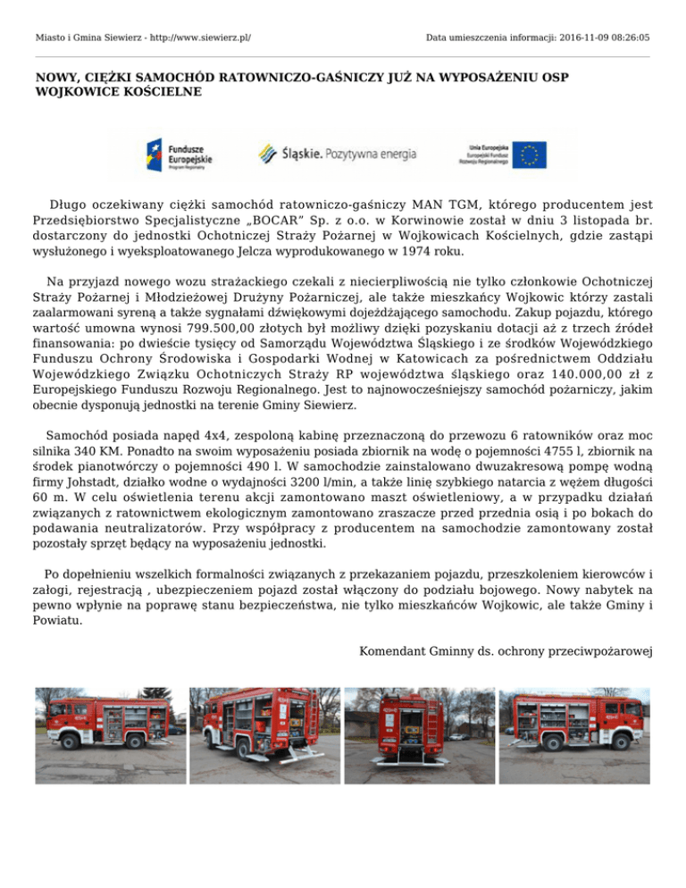 Miasto i Gmina Siewierz - http://www.siewierz.pl/ Data umieszczenia informacji: 2016-11-09 08:26:05 NOWY, CIĘŻKI SAMOCHÓD RATOWNICZO-GAŚNICZY JUŻ NA WYPOSAŻENIU OSP WOJKOWICE KOŚCIELNE Długo oczekiwany ciężki samochód ratowniczo-gaśniczy MAN TGM, którego producentem jest Przedsiębiorstwo Specjalistyczne „BOCAR” Sp. z o.o. w Korwinowie został w dniu 3 listopada br. dostarczony do jednostki Ochotniczej Straży Pożarnej w Wojkowicach Kościelnych, gdzie zastąpi wysłużonego i wyeksploatowanego Jelcza wyprodukowanego w 1974 roku. Na przyjazd nowego wozu strażackiego czekali z niecierpliwością nie tylko członkowie Ochotniczej Straży Pożarnej i Młodzieżowej Drużyny Pożarniczej, ale także mieszkańcy Wojkowic którzy zastali zaalarmowani syreną a także sygnałami dźwiękowymi dojeżdżającego samochodu. Zakup pojazdu, którego wartość umowna wynosi 799.500,00 złotych był możliwy dzięki pozyskaniu dotacji aż z trzech źródeł finansowania: po dwieście tysięcy od Samorządu Województwa Śląskiego i ze środków Wojewódzkiego Funduszu Ochrony Środowiska i Gospodarki Wodnej w Katowicach za pośrednictwem Oddziału Wojewódzkiego Związku Ochotniczych Straży RP województwa śląskiego oraz 140.000,00 zł z Europejskiego Funduszu Rozwoju Regionalnego. Jest to najnowocześniejszy samochód pożarniczy, jakim obecnie dysponują jednostki na terenie Gminy Siewierz. Samochód posiada napęd 4x4, zespoloną kabinę przeznaczoną do przewozu 6 ratowników oraz moc silnika 340 KM. Ponadto na swoim wyposażeniu posiada zbiornik na wodę o pojemności 4755 l, zbiornik na środek pianotwórczy o pojemności 490 l. W samochodzie zainstalowano dwuzakresową pompę wodną firmy Johstadt, działko wodne o wydajności 3200 l/min, a także linię szybkiego natarcia z wężem długości 60 m. W celu oświetlenia terenu akcji zamontowano maszt oświetleniowy, a w przypadku działań związanych z ratownictwem ekologicznym zamontowano zraszacze przed przednia osią i po bokach do podawania neutralizatorów. Przy współpracy z producentem na samochodzie zamontowany został pozostały sprzęt będący na wyposażeniu jednostki. Po dopełnieniu wszelkich formalności związanych z przekazaniem pojazdu, przeszkoleniem kierowców i załogi, rejestracją , ubezpieczeniem pojazd został włączony do podziału bojowego. Nowy nabytek na pewno wpłynie na poprawę stanu bezpieczeństwa, nie tylko mieszkańców Wojkowic, ale także Gminy i Powiatu. Komendant Gminny ds. ochrony przeciwpożarowej Urząd Miasta i Gminy Siewierz, 42-470 Siewierz, ul. Żwirki i Wigury 16, tel. 32 64 99 400, e-mail: [email protected] Burmistrz Miasta i Gminy Siewierz mgr Zdzisław Banaś