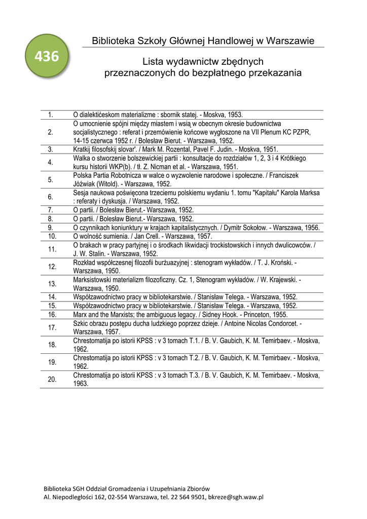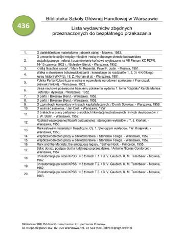 Biblioteka Szkoły Głównej Handlowej w Warszawie 436 1. 2. 3. 4. 5. 6. 7. 8. 9. 10. 11. 12. 13. 14. 15. 16. 17. 18. 19. 20. Lista wydawnictw zbędnych przeznaczonych do bezpłatnego przekazania O dialektićeskom materializme : sbornik statej. - Moskva, 1953. O umocnienie spójni między miastem i wsią w obecnym okresie budownictwa socjalistycznego : referat i przemówienie końcowe wygłoszone na VII Plenum KC PZPR, 14-15 czerwca 1952 r. / Bolesław Bierut. - Warszawa, 1952. Kratkij filosofskij slovar'. / Mark M. Rozental, Pavel F. Judin. - Moskva, 1951. Walka o stworzenie bolszewickiej partii : konsultacje do rozdziałów 1, 2, 3 i 4 Krótkiego kursu historii WKP(b). / tł. Z. Nicman et al. - Warszawa, 1951. Polska Partia Robotnicza w walce o wyzwolenie narodowe i społeczne. / Franciszek Jóźwiak (Witold). - Warszawa, 1952. Sesja naukowa poświęcona trzeciemu polskiemu wydaniu 1. tomu "Kapitału" Karola Marksa : referaty i dyskusja. / Warszawa, 1952. O partii. / Bolesław Bierut.- Warszawa, 1952. O partii. / Bolesław Bierut.- Warszawa, 1952. O czynnikach koniunktury w krajach kapitalistycznych. / Dymitr Sokołow. - Warszawa, 1956. O wolność sumienia. / Jan Crell. - Warszawa, 1957. O brakach w pracy partyjnej i o środkach likwidacji trockistowskich i innych dwulicowców. / J. W. Stalin. - Warszawa, 1952. Rozkład współczesnej filozofii burżuazyjnej : stenogram wykładów. / T. J. Kroński. Warszawa, 1950. Marksistowski materializm filozoficzny. Cz. 1, Stenogram wykładów. / W. Krajewski. Warszawa, 1950. Współzawodnictwo pracy w bibliotekarstwie. / Stanisław Telega. - Warszawa, 1952. Współzawodnictwo pracy w bibliotekarstwie. / Stanisław Telega. - Warszawa, 1952. Marx and the Marxists; the ambiguous legacy. / Sidney Hook. - Princeton, 1955. Szkic obrazu postępu ducha ludzkiego poprzez dzieje. / Antoine Nicolas Condorcet. Warszawa, 1957. Chrestomatija po istorii KPSS : v 3 tomach T.1. / B. V. Gaubich, K. M. Temirbaev. - Moskva, 1962. Chrestomatija po istorii KPSS : v 3 tomach T.2. / B. V. Gaubich, K. M. Temirbaev. - Moskva, 1962. Chrestomatija po istorii KPSS : v 3 tomach T.3. / B. V. Gaubich, K. M. Temirbaev. - Moskva, 1963. Biblioteka SGH Oddział Gromadzenia i Uzupełniania Zbiorów Al. Niepodległości 162, 02-554 Warszawa, tel. 22 564 9501, [email protected] Biblioteka Szkoły Głównej Handlowej w Warszawie 437 1. 2. 3. 4. 5. 6. 7. 8. 9. 10. 11. 12. 13. 14. 15. 16. 17. 18. 19. 20. 21. 22. Lista wydawnictw zbędnych przeznaczonych do bezpłatnego przekazania Śvedsko-russkij slovar' = Svensk-rysk ordbok. / Diza E. Milanova. - Moskva, 1962. Mały słownik geologiczny. / Grażyna Niemczynow, Jan Burchart. - Warszawa, 1963. Mały słownik geologiczny. / Grażyna Niemczynow, Jan Burchart. - Warszawa, 1963. Mały słownik geologiczny. / Grażyna Niemczynow, Jan Burchart. - Warszawa, 1963. Z dziejów czasopiśmiennictwa polskiego w ZSRR : ("Kultura Mas" 1929-1937). / Krystyna Sierocka. - Warszawa, 1963. Słownik poprawnej polszczyzny. / Stanisław Szober. - Warszawa, 1963. Słownik etymologiczny łacińskich nazw i terminów używanych w biologii oraz medycynie. / Jerzy Kreiner. - Wrocław, 1963. Prawo pracy : przepisy, orzecznictwo i wyjaśnienia : stan prawny na dzień 15 III 1963 r. / Józef Zieliński. - Warszawa, 1963. Prawo pracy : przepisy, orzecznictwo i wyjaśnienia. Uzupełnienia 1. / Józef Zieliński. Warszawa, 1965. Ilustrowany górniczy słownik encyklopedyczny. / Stanisław Gisman. - Stalinogród, 1955. Słownik psychologiczny. / Józef Pieter. - Wrocław ; Warszawa ; Kraków, 1963. Słownik psychologiczny. / Józef Pieter. - Wrocław ; Warszawa ; Kraków, 1963. Encyklopedia ochrony roślin : praca zbiorowa. / pod red. St. Gałeckiego et al. - Warszawa, 1963. Encyklopedia ochrony roślin : praca zbiorowa. / pod red. St. Gałeckiego et al. - Warszawa, 1963. Przewodnik po Polsce. / red.Justyn Wojsznis et al.- Warszawa, 1963. Przewodnik po Polsce. / red.Justyn Wojsznis et al.- Warszawa, 1963. Poradnik ceramiczny. / Stefan Bogusławski et al. - Warszawa, 1963. Słownik etymologiczny języka polskiego. / Aleksander Brückner. - Warszawa, 1957. Polszczyzna piękna i poprawna : porady językowe. / Stanisław Urbańczyk.- Wrocław, 1963. Filosofskij slovar'. / M. M. Rozental, P. F. Judin. - Moskva, 1963. Filosofskij slovar'. / M. M. Rozental, P. F. Judin. - Moskva, 1963. Filosofskij slovar'. / M. M. Rozental, P. F. Judin. - Moskva, 1963. Biblioteka SGH Oddział Gromadzenia i Uzupełniania Zbiorów Al. Niepodległości 162, 02-554 Warszawa, tel. 22 564 9501, [email protected] Biblioteka Szkoły Głównej Handlowej w Warszawie 438 1. 2. 3. 4. 5. 6. 7. 8. 9. 10. 11. 12. 13. 14. 15. 16. 17. 18. 19. 20. Lista wydawnictw zbędnych przeznaczonych do bezpłatnego przekazania Świat w mapach i wykresach : Europa. / Stefan Żmuda, Józef Szaflarski. - Warszawa, 1963. Świat w mapach i wykresach : Europa. / Stefan Żmuda, Józef Szaflarski. - Warszawa, 1963. Publiczność prasowa Katowic. / Józef Kądzielski. - Kraków, 1963. Mała encyklopedia rolnicza... / red. J.Głowacki i in. - Warszawa, 1963. Mała encyklopedia rolnicza... / red. J.Głowacki i in. - Warszawa, 1963. Encyklopedia: Przyroda i technika : zagadnienia wiedzy współczesnej. / red. nacz. Józef Hurwiec. - Warszawa, 1963. Język niemiecki : teksty ekonomiczne. / Izabela Kubicowa, Janina Jasińska. - Poznań, 1964. Afryka. / Lech Ratajski. - Warszawa, 1966. Afryka. / Lech Ratajski. - Warszawa, 1966. Słownik terminów pszczelarskich = Dictionary of beekeeping terms with allied scientific terms. / ed. by E. E. Crane. - Warszawa, 1964. Anglo-russkij juridićeskij slovar’. / Sergej N. Andrianov, Aleksandr S. Nikiforov. - Moskva, 1964. Mały słownik chemiczny. / red. Jerzy Chodkowski. - Warszawa, 1964. Mały słownik chemiczny. / red. Jerzy Chodkowski. - Warszawa, 1964. Słownik roślin użytkowych : polski, łaciński, angielski, francuski, niemiecki. / Zbigniew Podbielkowski. Warszawa, 1966. Słownik chemicz