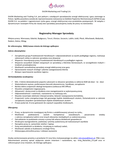 DUON Marketing and Trading S.A. DUON Marketing and Trading S.A. jest jednym z wiodących sprzedawców energii elektrycznej i gazu ziemnego w Polsce. Spółka powołana została do reprezentowania notowanej na Giełdzie Papierów Wartościowych (GPW) Grupy DUON S.A. na polskim i zagranicznym rynku gazu, energii elektrycznej oraz produktów powiązanych. W związku z dynamicznym rozwojem firmy do naszej sieci sprzedaży poszukujemy osoby do pracy na stanowisku: Regionalny Manager Sprzedaży Miejsca pracy: Warszawa, Gdańsk, Bydgoszcz, Toruń, Olsztyn, Szczecin, Lublin, Łódź, Płock, Włocławek, Białystok, Radom, Kielce, Elbląg. Nr referencyjny: RMS/nazwa miasta do którego aplikujesz Zakres obowiązków:       Zarządzanie grupą Przedstawicieli Handlowych i odpowiedzialność za wynik podległego regionu, realizacja założonych celów w zakresie sprzedaży oraz ekspansji Wsparcie i koordynacja pracy Przedstawicieli Handlowych w podległym regionie Wsparcie wszystkich działań związanych ze sprzedażą u klientów biznesowych, w szczególności małych i średnich przedsiębiorstw Możliwość samodzielnej sprzedaży energii elektrycznej oraz gazu Opracowanie nowych strategii i planów zaangażowania klienta Bieżące raportowanie wyników regionu Od Kandydatów oczekujemy:         Min. 3-letnie doświadczenie poparte sukcesami w obszarze sprzedaży w sektorze B2B lub door - to - door Wykształcenie wyższe, preferowane kierunki ekonomiczne, handlowe, zarządzanie Bardzo dobra znajomość obsługi komputera (zwłaszcza MS Office) Wysokie umiejętności negocjacyjne, Aktywność i skuteczność w działaniu oraz zaangażowanie w wykonywaną pracę Odpowiedzialność i rzetelność, nastawienie na realizację celu Wysoko rozwinięte zdolności interpersonalne, łatwość nawiązywania kontaktów, Znajomość rynku energetycznego lub gazowego będzie dodatkowych atutem, Doświadczenie w zakresie zarządzania zespołem sprzedażowym będzie dodatkowym atutem  Prawo jazdy kat. B oraz gotowość do częstych wyjazdów służbowych, Oferujemy:         Pracę w dynamicznie rozwijającej się firmie o ustabilizowanej sytuacji na rynku, Możliwość podniesienia swoich kompetencji zawodowych, poszerzenie z zakresu zarządzania ludźmi oraz innych obszarów niezbędnych w codziennej pracy Zatrudnienie na podstawie umowy o pracę lub własna działalność gospodarcza Atrakcyjne wynagrodzenie, podstawę i premię uzależnioną od realizowanych wyników Narzędzia pracy tj. samochód, telefon i laptop Dużą samodzielność w działaniu, inicjatywę w realizacji zadań, Możliwość udziału w budowaniu strategii firmy Motywującą atmosferę pracy i ciekawe wyzwania wiedzy Osoby zainteresowane prosimy o przesłanie CV oraz listu motywacyjnego na adres [email protected]. Pliki z ww. dokumentami prosimy opisać wyłącznie swoim imieniem i nazwiskiem, np.: Imię_Nazwisko_CV.pdf oraz nr referencyjnym oraz miastem, do którego aplikujesz. Prosimy o dopisanie następującej klauzuli: "Wyrażam zgodę na przetwarzanie moich danych osobowych zawartych w ofercie pracy dla potrzeb procesu rekrutacji zgodnie z ustawą z dnia 27.08.1997r. Dz. U. z 2002 r., Nr 101, poz. 923 ze zm." Dziękujemy za nadesłane zgłoszenia. Jednocześnie zastrzegamy, że skontaktujemy się tylko z wybranymi kandydatami.