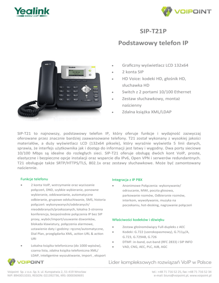 SIP-T21P Podstawowy telefon IP Graficzny wyświetlacz LCD 132x64 2 konta SIP HD Voice: kodeki HD, głośnik HD, słuchawka HD Switch z 2 portami 10/100 Ethernet Zestaw słuchawkowy, montaż naścienny Zdalna książka XML/LDAP SIP-T21 to najnowszy, podstawowy telefon IP, który oferuje funkcje i wydajność zazwyczaj oferowane przez znacznie bardziej zaawansowane telefony. T21 został wykonany z wysokiej jakości materiałów, a duży wyświetlacz LCD (132x64 piksele), który wyraźnie wyświetla 5 linii danych, sprawia, że interfejs użytkownika jak i dostęp do informacji jest łatwy i wygodny. Dwa porty sieciowe 10/100 Mbps są idealne do rozległych sieci. SIP-T21 oferuje obsługę dwóch kont VoIP, proste, elastyczne i bezpieczne opcje instalacji oraz wsparcie dla IPv6, Open VPN i serwerów redundantnych. T21 obsługuje także SRTP/HTTPS/TLS, 802.1x oraz zestawy słuchawkowe. Może być zamontowany naściennie. Funkcje telefonu Integracja z IP PBX 2 konta VoIP, wstrzymanie oraz wyciszanie połączeń, DND, szybkie wybieranie, ponowne wybieranie, oddzwanianie, automatyczne odbieranie, grupowe odsłuchiwanie, SMS, historia połączeń: wykonywanych/odebranych/ nieodebranych/przekazanych, lokalna 3-stronna konferencja, bezpośrednie połączenia IP bez SIP proxy, wybór/import/usuwanie dzwonków, blokada klawiatury, połączenia alarmowe, ustawienie daty i godziny: ręczne/automatyczne, Dial Plan, przeglądarka XML, action URL & action URI Lokalna książka telefoniczna (do 1000 wpisów), czarna lista, zdalna książka telefoniczna XML/ LDAP, inteligentne wyszukiwanie, import , eksport Anonimowe Połączenia: wykonywanie/ odrzucanie, MWI, poczta głosowa, parkowanie rozmów, Odbieranie rozmów, interkom, wywoływanie, muzyka na poczekaniu, hot-desking, nagrywanie połączeń Właściwości kodeków i dźwięku Zestaw głośnomówiący Full-dupleks z AEC Kodeki: G.722 (szerokopasmowy), G.711μ/A, G.723, G.729AB, G.726 DTMF: in-band, out-band (RFC 2833) i SIP INFO VAD, CNG, AEC, PLC, AJB, AGC Właściwości sieciowe i bezpieczeństwo Wyświetlacz Graficzny wyświetlacz LCD 132x64 pikseli Intuicyjny interfejs użytkownika z ikonami i klawiszami funkcyjnymi Wybór języka SIP v1 (RFC2543), v2 (RFC3261), IPV6, Open VPN NAT Traversal: STUN mode IEEE802.1X Tryb Proxy i peer-to-peer SIP link IP Przypisanie IP: Statyczne/DHCP/PPPoE Serwer HTTP/HTTPS Synchronizacja daty I godziny poprzez SNTP UDP/TCP/DNS-SRV (RFC 3263) QoS: 802.1p/Q, ToS warstwy 3, DSCP SRTP Transport Layer Security (TLS) Menadżer certyfikatów HTTPS Szyfrowanie AES pliku konfiguracyjnego Uwierzytelnianie szyfrowania przy użyciu MD5/MD5-sess Konfiguracja : przeglądarka/telefon/autoprovision Auto-provision poprzez : FTP/TFTP/HTTP/ HTTPS dla masowego wdrożenia Auto-provision with PnP Reset do ustawień fabrycznych, reboot Identyfikacja połączenia przychodzącego (imię i nazwisko, numer) Właściwości fizyczne 2 porty RJ45 10/100M Ethernet 1 port słuchawki RJ9 Pobór mocy (PSU): 1.4 - 2.6W Zarządzanie Dioda LED wskazująca połączenie/wiadomość oczekującą 31 klawiszy, w tym 4 funkcyjne 4 diody LED: 1 x zasilanie, 2 x linia, 1 x wiadomość 1 port zestawu słuchawkowego RJ9 Możliwość montażu naściennego Zasilacz: AC 100 - 240 V (wejście) i DC 5V/600mA (wyjście) Wymiary: 209 x 188 x 150 x 41 mm Waga: 0.81 kg Wilgotność : 10~95% Temperatura : od - 100C do 600C Zero sp-touch Wsparcie dla redundantnych serwerów auto -provision Eksport zrzutu pakietów, log systemowy Certyfikaty
