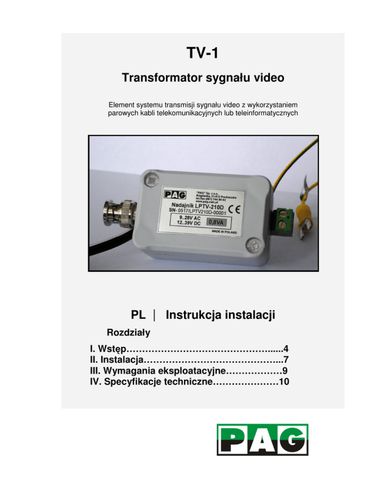 TV-1 Transformator sygnału video Element systemu transmisji sygnału video z wykorzystaniem parowych kabli telekomunikacyjnych lub teleinformatycznych PL | Instrukcja instalacji Rozdziały I. Wstęp………………………………………......4 II. Instalacja……………………………………...7 III. Wymagania eksploatacyjne………………9 IV. Specyfikacje techniczne…………………10 TV-1 | Instrukcja instalacji PL | 1 Środki bezpieczeństwa UWAGA: ZE WZGLĘDU NA NIEBEZPIECZEŃSTWO PORAŻENIA PRĄDEM ELEKTRYCZNYM NIE OTWIERAĆ OBUDOWY URZĄDZENIA. WEWNĄTRZ NIE MA ELEMENTÓW WYMAGAJĄCYCH REGULACJI PRZEZ UŻYTKOWNIKA. WSZELKIE NAPRAWY MOGĄ BYĆ DOKONYWANE TYLKO PRZEZ AUTORYZOWANY SERWIS. To ostrzeżenie może być umieszczone na płycie bocznej urządzenia ze względu na ograniczoną ilość miejsca. Błyskawica z symbolem strzałki wewnątrz równobocznego trójkąta ostrzega użytkownika urządzenia, że wewnątrz obudowy występują niebezpieczne napięcia, które przy niewłaściwym użytkowaniu mogą stworzyć niebezpieczeństwo porażenia prądem elektrycznym. Wykrzyknik wewnątrz trójkąta równobocznego ma na celu zwrócenie uwagi użytkownika na obecność w instrukcji obsługi ważnych czynności związanych z obsługą i konserwacją sprzętu. OSTRZEŻENIE: W CELU UNIKNIĘCIA POŻARU LUB PORAŻENIA PRĄDEM ELEKTRYCZNYM NIE WOLNO NARAŻAĆ URZĄDZENIA NA DZIAŁANIE DESZCZU LUB WODY ___________________________________________________________________ TV-1 I 2006-12 I Wersja 1 TV-1 | Instrukcja instalacji PL | 2 Uwaga! Instalacji powinien dokonywać wykwalifikowany personel zgodnie z zasadami bezpieczeństwa obowiązującymi przy urządzeniach elektrycznych. WAŻNE INFORMACJE DOTYCZĄCE BEZPIECZEŃSTWA 1. Przeczytaj instrukcje - Należy przeczytać wszystkie instrukcje bezpieczeństwa, użytkowania i instalacji przed użyciem urządzenia. 2. Zachowaj instrukcje - Instrukcje bezpieczeństwa, użytkowania i instalacji należy zachować w celu późniejszego wykorzystania. 3. Zwracaj uwagę na wszystkie ostrzeżenia - Należy stosować się do wszystkich ostrzeżeń umieszczonych na urządzeniu i w instrukcji użytkowania. 4. Postępuj zgodnie ze wszystkimi instrukcjami - Należy postępować zgodnie z wszystkimi instrukcjami dotyczącymi pracy i użytkowania. 5. Nie używaj tego urządzenia w pobliżu wody - na przykład w niezabezpieczonej instalacji zewnętrznej lub w obszarze określonym jako miejsce wilgotne. 6. Czyść tylko suchą ściereczką. Nie używaj środków czyszczących w płynie ani aerozolu. 7. Nie instaluj urządzenia w pobliżu źródeł ciepła, takich jak kaloryfery, systemy grzewcze, piece czy inne urządzenia (w tym wzmacniacze), które wydzielają ciepło. 10. Używaj tylko określonych przez producenta elementów dodatkowych / akcesoriów. 11. Odłączaj urządzenie podczas burz z piorunami lub, gdy urządzenie nie jest wykorzystywane przez długi okres czasu. 12. Wszelkie naprawy zlecaj wykwalifikowanemu personelowi serwisu. Naprawa jest wymagana, gdy urządzenie zostanie uszkodzone w dowolny ___________________________________________________________________ TV-1 I 2006-12 I Wersja 1 TV-1 | Instrukcja instalacji PL | 3 sposób, na przykład, gdy urządzenie zostanie zalane płynem lub, gdy upadnie na nie jakiś przedmiot, gdy urządzenie zostanie wystawione na działanie deszczu lub wilgoci, gdy nie pracuje normalnie lub zostało upuszczone. 13. Przenoszenie - Urządzenie należy przenosić z zachowaniem szczególnej ostrożności. Użycie dużej siły lub wstrząs może spowodować uszkodzenie urządzenia. 14. Wkładanie przedmiotów i zalanie - Nie wolno wpychać żadnych przedmiotów do otworów wentylacyjnych urządzenia, ponieważ mogą one dotknąć punktów o niebezpiecznie wysokim napięciu lub spowodować zwarcie, co może spowodować pożar lub porażenie prądem. Nie należy wylewać żadnych płynów na urządzenie. 15. Części zamienne - Jeśli wymagana jest wymiana części, należy upewnić się, że serwisant użył części zamiennych określonych przez producenta lub o tej samej charakterystyce, co części oryginalne. Nieautoryzowana wymiana może spowodować pożar, porażenie prądem lub inne zagrożenie. 16. Kontrola bezpieczeństwa - Po wykonaniu jakichkolwiek czynności serwisowych lub napraw urządzenia, należy poprosić personel serwisowy o wykonanie kontroli bezpieczeństwa w celu określenia, czy urządzenie działa prawidłowo. ___________________________________________________________________ TV-1 I 2006-12 I Wersja 1 TV-1 | Instrukcja instalacji ROZDZIAŁ I PL | 4 Wstęp________________________________________ System transmisji sygnału video przeznaczony jest do stosowania w instalacjach telewizji przemysłowej, prowadzonych na zewnątrz i wewnątrz obiektów. System umożliwia transmisję sygnału video w paśmie podstawowym z wykorzystaniem symetrycznej pary przewodów. Sygnały wizyjne przesyłane są w typowych kablach telekomunikacyjnych lub komputerowych. Do transmisji sygnału stosuje się kable parowe. Dla kabli o skręcie czwórkowym wykorzystuje się dwa przewody z każdej „czwórki” kabla (pozostałe przewody muszą pozostać wolne). W jednym kablu możliwa jest transmisja tylko w jednym kierunku (ze względu na przenikanie zakłóceń od sygnału nadawanego do sygnału odbieranego). Maksymalny zasięg transmisji zależy od parametrów zastosowanych kabli. Zwiększenie zasięgu jest możliwe przez zastosowanie kabli o większej średnicy żyły transmisyjnej. System zbudowany jest z nadajnika oraz odbiornika sygnału różnicowego. Nadajnik dokonuje transformacji sygnału video z linii koncentrycznej na sygnał symetryczny, odpowiedni do transmisji po skrętce dwużyłowej. Nadajnik posiada możliwość korekcji sygnału w zależności od długości linii transmisyjnej. Po stronie odbiorczej znajduje się odbiornik skrętki, który wzmacnia i koryguje sygnał otrzymany na wejś