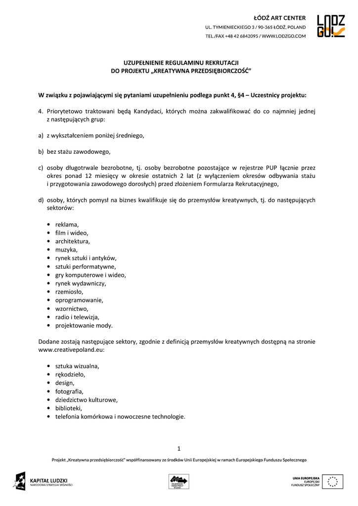 UZUPEŁNIENIE REGULAMINU REKRUTACJI DO PROJEKTU „KREATYWNA PRZEDSIĘBIORCZOŚĆ” W związku z pojawiającymi się pytaniami uzupełnieniu podlega punkt 4, §4 – Uczestnicy projektu: 4. Priorytetowo traktowani będą Kandydaci, których można zakwalifikować do co najmniej jednej z następujących grup: a) z wykształceniem poniżej średniego, b) bez stażu zawodowego, c) osoby długotrwale bezrobotne, tj. osoby bezrobotne pozostające w rejestrze PUP łącznie przez okres ponad 12 miesięcy w okresie ostatnich 2 lat (z wyłączeniem okresów odbywania stażu i przygotowania zawodowego dorosłych) przed złożeniem Formularza Rekrutacyjnego, d) osoby, których pomysł na biznes kwalifikuje się do przemysłów kreatywnych, tj. do następujących sektorów: • • • • • • • • • • • • • reklama, film i wideo, architektura, muzyka, rynek sztuki i antyków, sztuki performatywne, gry komputerowe i wideo, rynek wydawniczy, rzemiosło, oprogramowanie, wzornictwo, radio i telewizja, projektowanie mody. Dodane zostają następujące sektory, zgodnie z definicją przemysłów kreatywnych dostępną na stronie www.creativepoland.eu: • • • • • • • sztuka wizualna, rękodzieło, design, fotografia, dziedzictwo kulturowe, biblioteki, telefonia komórkowa i nowoczesne technologie. 1